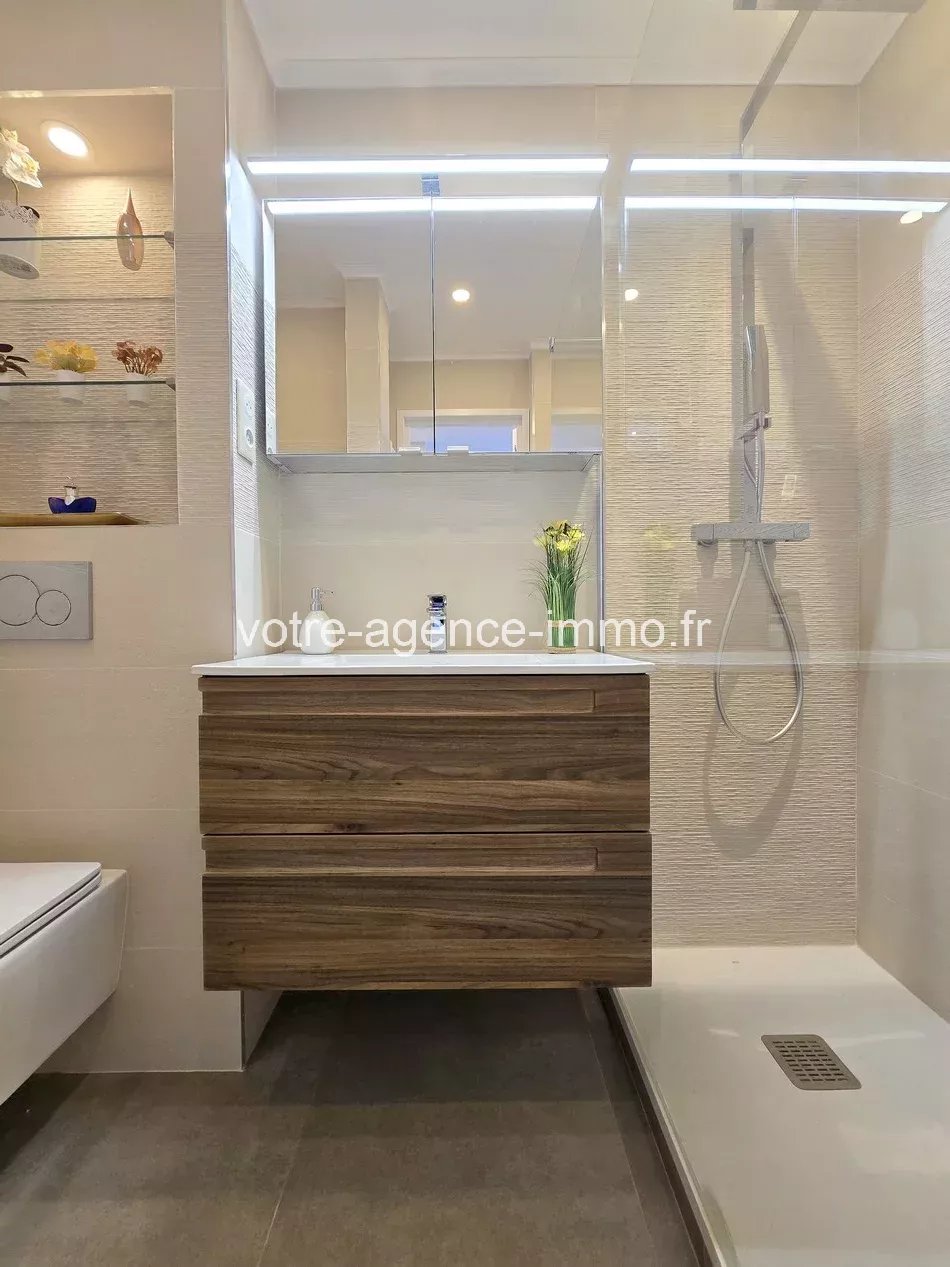 NICE OUEST FABRON : Résidence de standing en situation dominante dans un environnement verdoyant, MAGNIFIQUE 3 PIECES de 49m² INTEGRALEMENT RENOVE A NEUF DANS UN STYLE CONTEMPORAIN et avec des MATERIAUX DE QUALITE. TERRASSE aménagée avec VUE PANORAMIQUE COLLINES, VILLE ET MER (10m²) et BALCON (4,80m²). Possibilité GARAGE avec fond de cave en sus. CALME, LUMINEUX, TRAVERSANT et SANS VIS-A-VIS. L'appartement à l'atmosphère des plus chaleureuses et aux nombreux aménagements se compose d'une entrée (3,50m²), un beau séjour avec cuisine américaine entièrement aménagée et équipée (19,60m²) donnant accès à la terrasse (10m²), une chambre avec placard aménagé (11,20m²), une seconde chambre avec coin bureau (9,50m²) et son balcon privatif avec un espace séchoir (4,80m²), une salle de douche avec toilette (3,40m²) et une buanderie avec rangements (1,80m²). NOMBREUSES PRESTATIONS : climatisation réversible, fenêtres coulissantes, double vitrage, volets roulants électriques, salle de douche à l'italienne, nombreux rangements et placards, Proximité immédiate bus (ligne 51) et commerces. Centre-ville, Aéroport ou autoroute accessibles en 15mns. - Nombre de lots de copropriété : 144 à usage d'habitation. - Dernière quote-part annuelle de charges (20..) : En attente. - DPE : 99 Kwh/m²/an (C) - GES : 19 kg.co2/m²/an (C) - Consommation annuelle entre 442 € et 598 € (années de références : 2021 à 2023). - Les informations sur les risques auxquels ce bien est exposé sont disponibles sur le site Géorisques : georisques.gouv.fr.