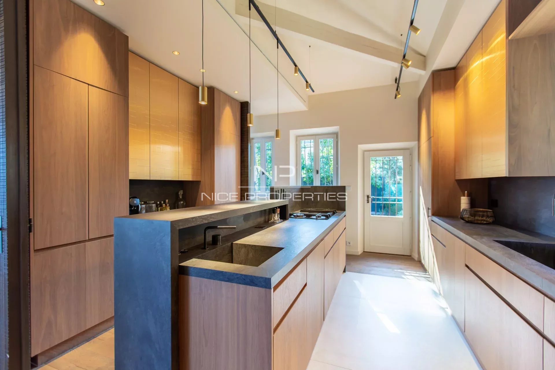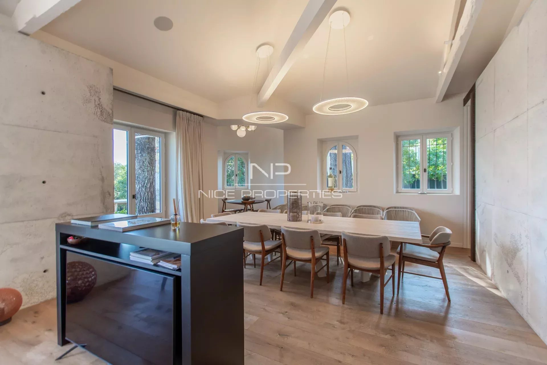 CAP D'ANTIBES: Eccezionale proprietà situata in una delle zone più ricercate, vicino alle migliori spiagge di sabbia e ai ristoranti, questa casa di campagna in pietra di circa 360 m² su un unico livello, beneficia di un magnifico terreno alberato di 3050 m². Casa principale di circa 280 m² composta da un ampio ingresso, una zona giorno con salotto, una cucina attrezzata, una sala da pranzo, il tutto aperto su una bella terrazza e sulla piscina a sfioro di 14 metri con vista panoramica sul mare. 4 camere da letto con bagno. La guest house di 80 m² offre 3 camere con bagno. Garage per 2 auto. Tasse del 5% incluse, a carico del venditore. Le informazioni sui rischi a cui è esposta questa proprietà sono disponibili sul sito web di Géorisques: georisques.gouv.fr