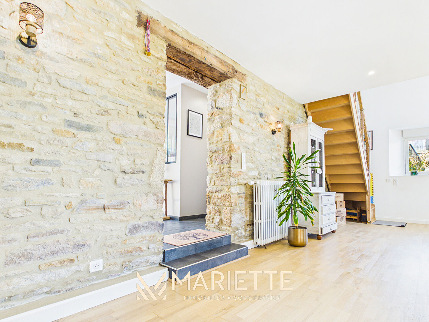 "CASA VECCHIA" Est cette magnifique maison pleine de charme et de caractère, nichée à Saint-Yvi, dans un écrin de verdure au calme absolu. Elle est située à seulement quelques minutes de Concarneau et de ses plages, tout en profitant pleinement du calme et de et de la douceur de la campagne environnante. Entièrement rénovée avec goût, elle a su conserver et mettre en valeur la pierre d'origine, qui donne aujourd'hui tout son cachet à la maison. L'ensemble dégage une vraie authenticité, alliée à un confort contemporain soigné. La pièce de vie principale offre un volume remarquable, ou la pierre apparente dialogue avec la lumière naturelle, créant un espace à la fois généreux et chaleureux, tourné vers la convivialité. Un bien rare, ou le charme de l'ancien et la qualité de rénovation se rencontrent naturellement, offrant une maison de caractère prête à accueillir une nouvelle histoire. En plus de la maison, vous trouverez une dépendance en pierre pouvant être réhabilité en habitation ou en espace de stockage. Annexe : Garage, terrasse et atelier en pierre Une nouveauté Mariette immobilier La forêt Fouesnant. La distribution : Au rez-de-jardin : Hall d'entrée, avec couloir de dégagement, bureau, WC, salle d'eau, cuisine et salon séjour. Au 1ère étage : un palier de distribution, trois chambres dont une suite parentale avec dressing et salle d'eau, salle de bains. Ce que l'on aime : Le charme et le caractère de la maison, la rénovation soignée, les grands volumes, l'espace extérieur avec sa grande terrasse, le jardin, l'emplacement proche des accès. Points d'intérêt : A 6 minutes du bourg et des commerces A 6 minutes des écoles A 15 minutes de la plage Mariette Immobilier Conciergerie soutient la SNSM de Trévignon - Concarneau en leur reversant 1 % de chaque commission d'agence, afin de contribuer à leurs actions de prévention et de sauvetage en mer. (4.00 % honoraires TTC à la charge de l'acquéreur.)