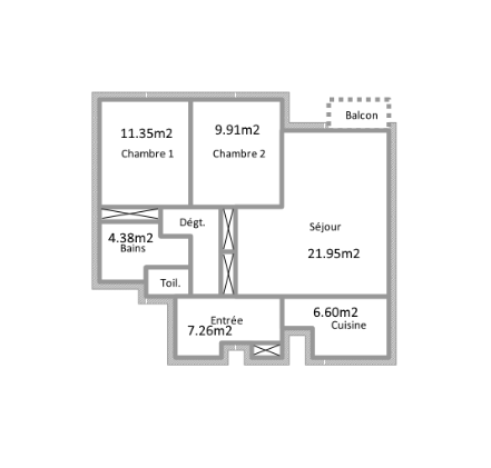 vends t 3 2chambre salon sejour entree cuisine equipée sdb 1 w.c. couloir avec grand placard intégré comme indiqué sur le plan . appart entierement renové du sol au plafond: sol en lames pvc isolées sauf cuisine et s.d.b. en carrelage.peintures refaite murs plafonds cuisine equipée neuve(2ans) .chauffage et e.c.s collectif au gaz.residence calme grands espaces verts, a proximité de tous commerces tram +bus 2minutes a pied.caves en sous sol parking dans la residence acces residence voi