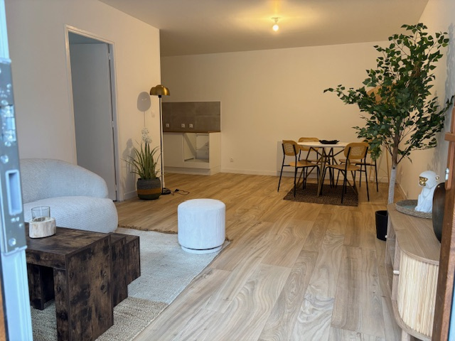 F2 en rdc complétement refait à neuf comprend (en cours de finition) : Entrée sur séjour ouvert sur cuisine aménagée et équipée, salle de bains + wc, chambre.Garage de 25 m2 + 1/3 de garage partagé en 3 Geste commercial a 5% pour les frais d