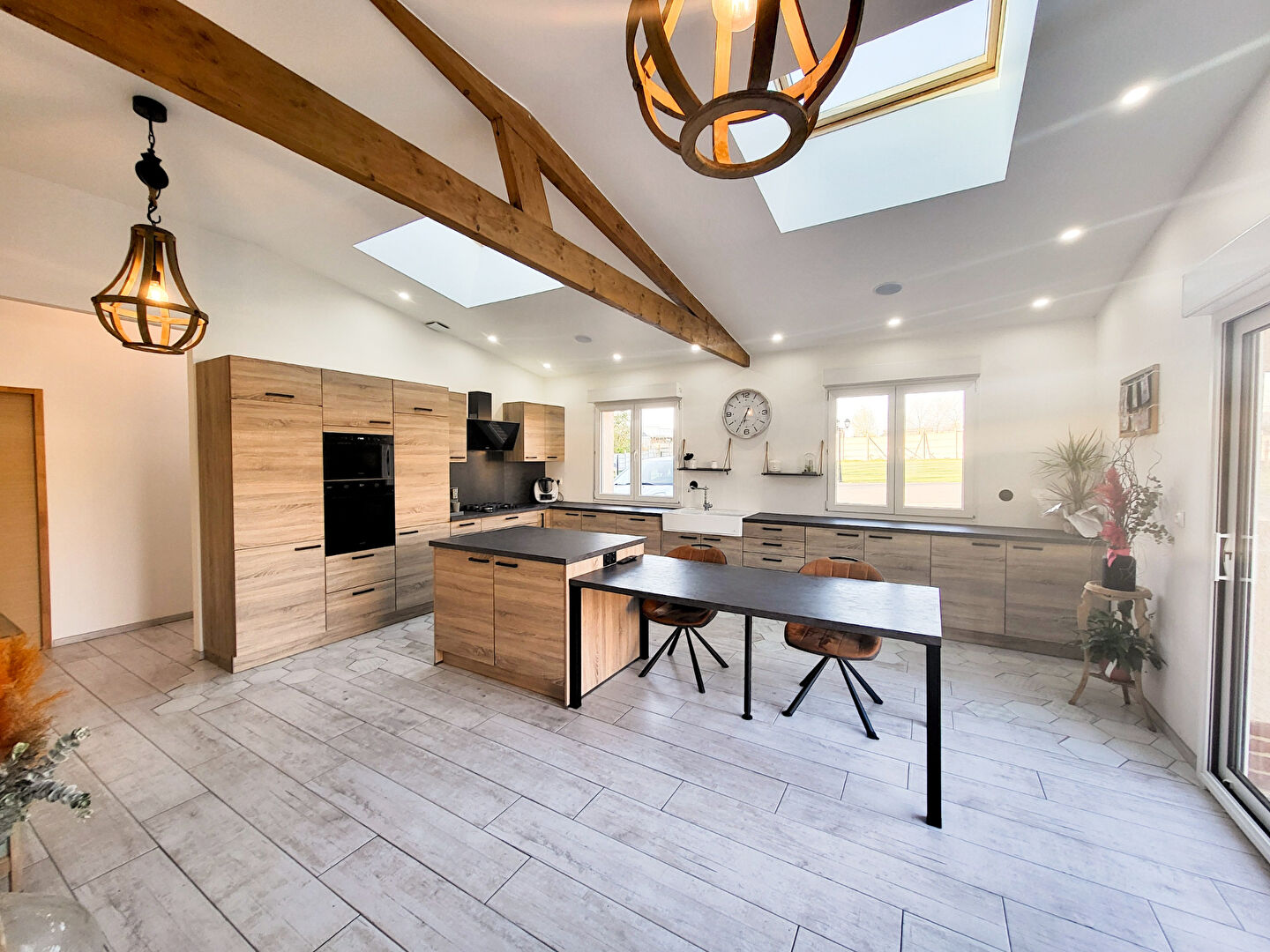 Axe CAUDRY CAMBRAI Hall d'entrée, un salon-sal. à m. avec cfb insert, un séjour-cuisine équipée, 3 chs, une sdb avec baignoire et douche, un w.c. Etage : Palier, une suite parentale avec salle d'eau et w.c. et dressing, une chambre, greniers. Ga