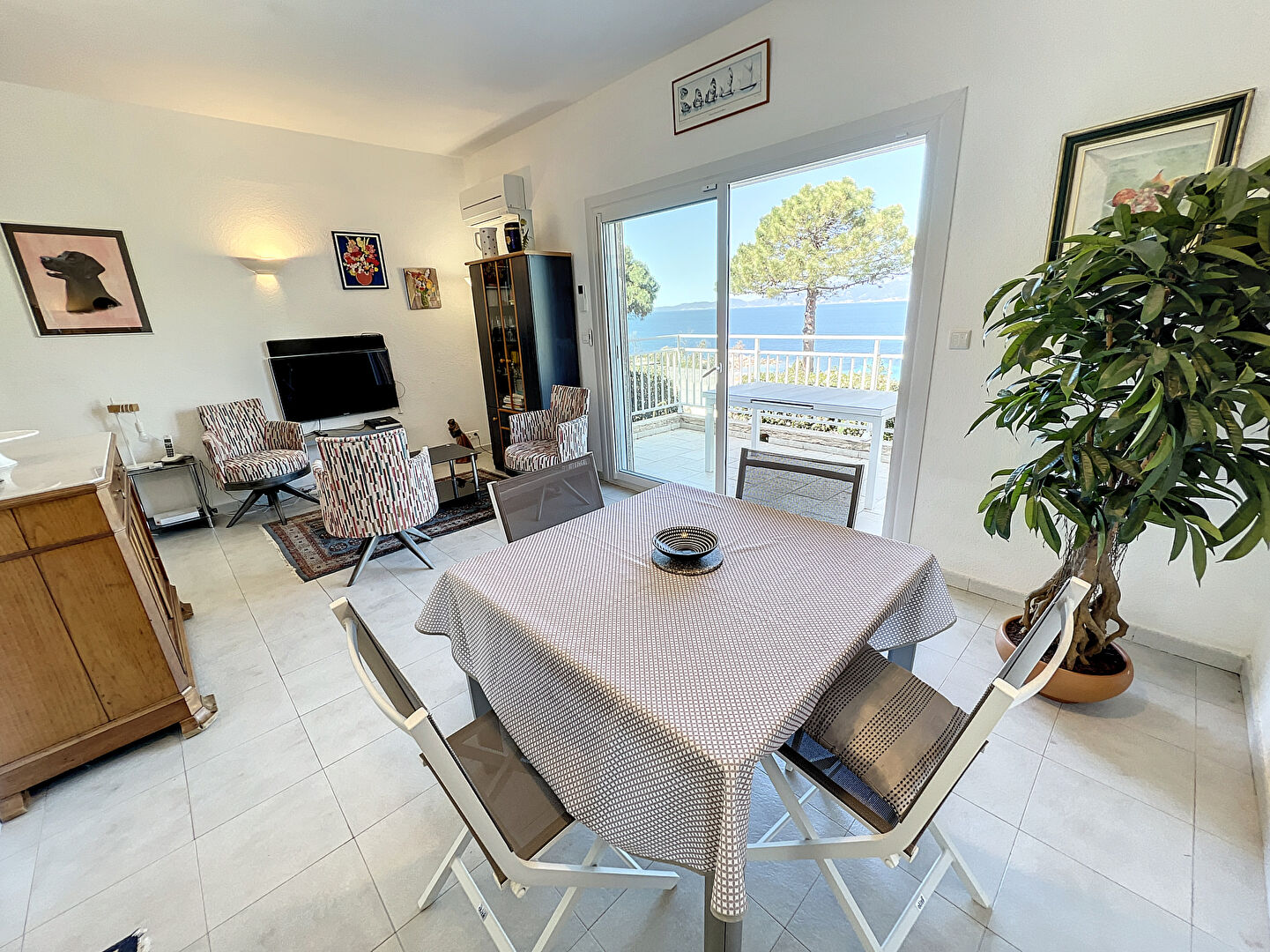 L'agence Lods Transaction vous présente en exclusivité, face à la plage de Mare Sole, une maison mitoyenne de 110m2 avec pleine vue sur le golfe d'Ajaccio, des iles sanguinaires à la pointe de l'isolella. Le bien est disposé de la manière suivante: Une arrivée par l'arrière de la résidence donnant sur un grand jardin avec une terrasse exposée soleil levant, une entrée donnant sur un coin cuisine, un salon avec salle à manger sur terrasse avec vue panoramique mer, un couloir avec placards, un cellier, une salle d'eau et 2 chambres avec vue sur la mer. Au niveau inférieur, un coin cuisine, un salon, 2 chambres, un couloir, une buanderie, une salle d'eau. Prestations: climatisation, double vitrage, stores électriques, pergola bio climatique, douche extérieur. Une cave complète ce lot. Un pieds à terre parfait pour passer des vacances à proximité de la mer et recevoir des amis ou de la famille. Photos supplémentaires de l'appartement du bas sur demande. Pour prévoir une visite sur site ou à distance n'hésitez pas à nous contactez au 06 26 07 82 36