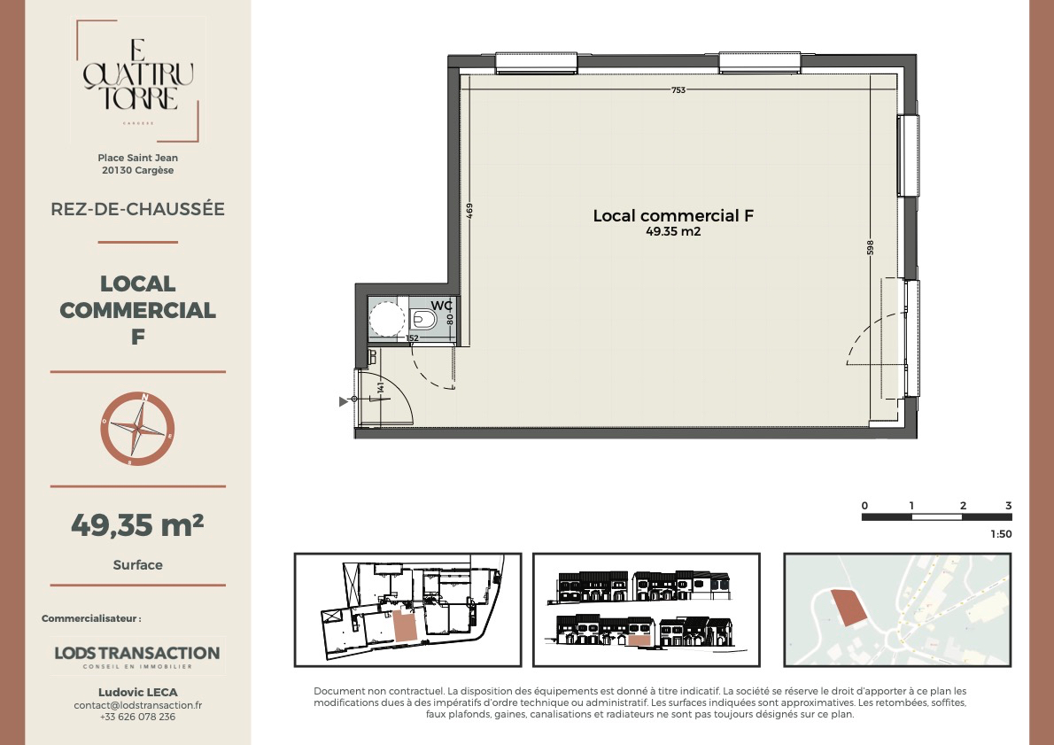 Lancement commercial La Résidence E Quattru Torre bénéficie d'un emplacement de choix sur le plateau de la Sarra , au coeur de village de Cargèse. Elle domine ainsi le golfe du Pero. Proposant seulement 9 appartements et 10 locaux, le projet rappel l'architecture des villages Corses pour une intégration parfaite à son environnement. Lot F Local commercial Superficie: 49,35m2 Prestations locaux: Livrés bruts. Rideau métallique. Menuiseries double vitrage aluminium. Travaux en cours. Livraison 1er semestre 2025. Une opportunité rare à saisir sans plus attendre! Pour plus de renseignements contactez nous au 06 26 07 82 36 Copropriété de 19 lots - dont 9 lots habitation. (Pas de procédure en cours). Charges annuelles : 10 euros.