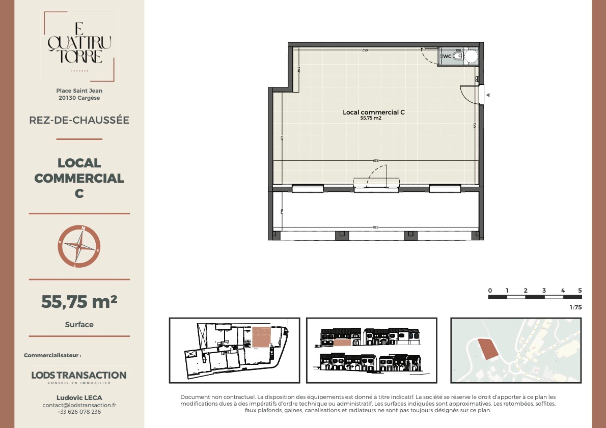 Lancement commercial La Résidence E Quattru Torre bénéficie d'un emplacement de choix sur le plateau de la Sarra , au coeur de village de Cargèse. Elle domine ainsi le golfe du Pero. Proposant seulement 9 appartements et 10 locaux, le projet rappel l'architecture des villages Corses pour une intégration parfaite à son environnement. Lot C Local commercial Superficie: 55,75m2 Prestations locaux: Livrés bruts. Rideau métallique. Menuiseries double vitrage aluminium. Travaux en cours. Livraison 1er semestre 2025. Une opportunité rare à saisir sans plus attendre! Pour plus de renseignements contactez nous au 06 26 07 82 36 Copropriété de 19 lots - dont 9 lots habitation. (Pas de procédure en cours). Charges annuelles : 10 euros.