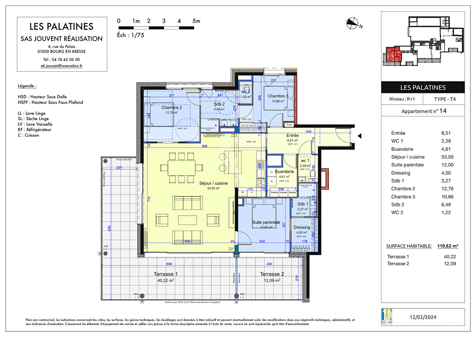 LES PALATINES rue du Palais à Bourg-en-Bresse, Découvrez ce nouveau programme immobilier enchassé dans les murs de l'ancien palais de justice, en plein coeur du centre historique, alliant calme, confort et caractère avec toutes les commodités à proximité immédiate. Dans la continuité de l'immeuble de LA CONCIERGERIE cette nouvelle résidence propose des appartements haut de gamme bénéficiant d'une vue d'exception sur la ville et le jardin suspendu, Tous avec de belles terrasses, des volumes spacieux , de larges baies, des prestations et finitions haut de gamme. Chauffage réversible par pompe à chaleur, ascenseur et norme PMR, domotique, isolation répondant à la dernière norme RT2020. De 56 à 212 m², du T2 au T7, avec en sous-sol des garages simples ou doubles avec portes motorisées. Pour plus de renseignements n'hésitez à nous contacter au 04.74.45.06.00.