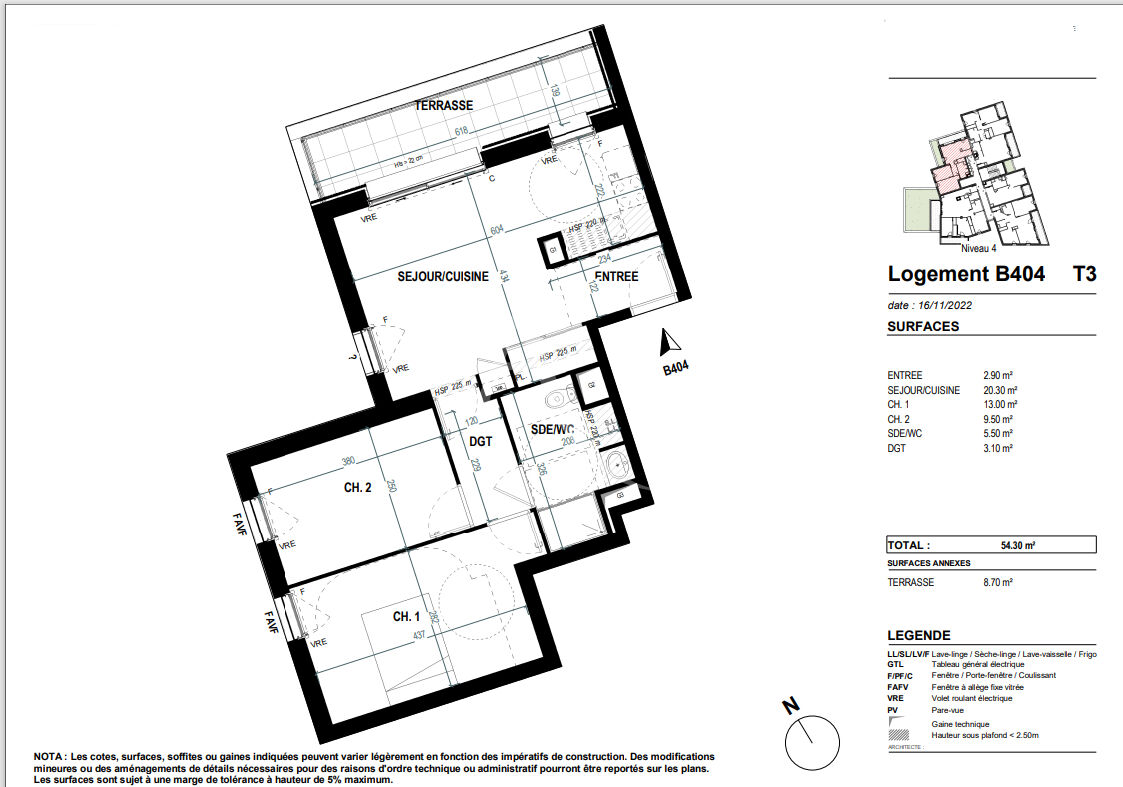 Nouvelle résidence en centre ville de Saint Nazaire, appartements de type 1 au Type 5 . Idéalement situé à moins de de 5 min à pied du parc paysagé , 200m d'une supérette et à 10 min à pied des rues commerçantes du centre ville et du centre commercial Ruban bleu. Vous rejoignez la grande plage de St Nazaire en moins de 15 min à pied. Bus U4 et Hélice , arrêt soleil levant à 200m (vers centre ville et gare). A VENDRE appartement de type 3 de 54,30m² comprenant un séjour cuisine de 20,30m² ouvert sur une terrasse, deux chambres , une salle d'eau et WC. Une place de parking privative en sous-sol complète les lieux Label Energie RT 2012 norme PMR (personne à mobilité réduite) Prix: 287 000 euros TTC (+ frais notaire réduits 2.5%) Prix direct promoteur REF: 31528ET-B404 "Les informations sur les risques auxquels ce bien est exposé sont disponibles sur le site Géorisques : www.georisques.gouv.fr" Copropriété de 86 lots - dont 86 lots habitation.(Pas de procédure en cours).
