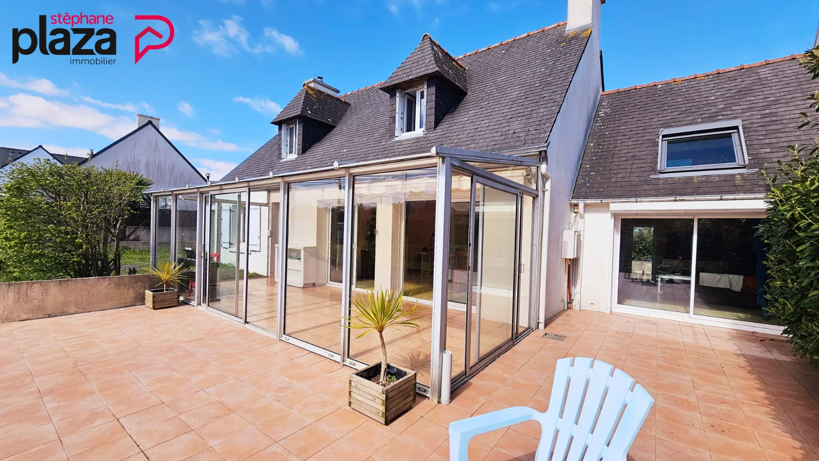 En Exclusivité! Située sur la commune de Poullan-sur-Mer, dans une rue calme proche des commerces, venez découvrir cette maison offrant de jolis volumes et une vie possible de plain-pied. Une petite allée dans le jardin vous amène à une grande terrasse et sa véranda sans vis-à-vis, en entrant, une vaste pièce de vie comprenant un séjour salle à manger, un salon avec mezzanine et une cuisine aménagée/équipée ouverte. Deux chambres dont une suite parentale avec mezzanine ainsi qu'