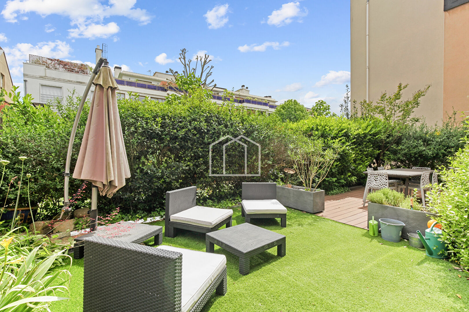 Dans une résidence calme, un appartement familial de 105 m², 5 pièces situé en rez-de-jardin. Composé d'un beau et grand séjour avec accès à une grande terrasse de 77m² et un jardin, une cuisine séparée, 3 chambres (possibilité 4 ou bureau), une salle de bains avec WC, une salle d'eau, une buanderie avec WC et un cellier. Appartement traversant avec extérieurs de part et d'autre, fonctionnel, espace nuit, bon état général. Ce bel ensemble est complété par une cave et une place