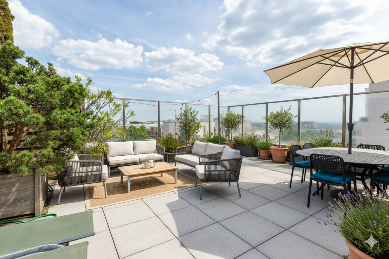 SURESNES - Proche Bois de Boulogne ,APPARTEMENT AVEC TERRASSE DE PLAIN PIED Dans une belle résidence récente, bel appartement de 93m2 compose? d'une entrée, d'un trés beau double séjour ouvrant sur une belle terrasse de plain pied de 49m2, 2 chambres, une salle de bain, une cuisine américaine, 2 WC, une cave, un parking Trés ensoleille - vue Tour Eiffel
