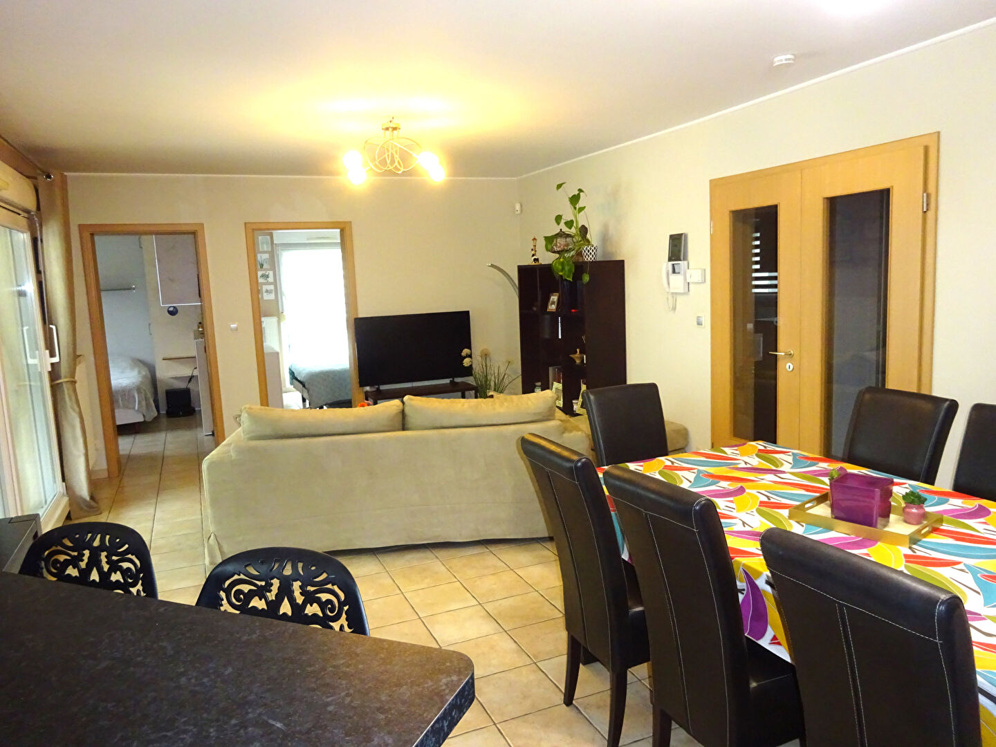 HETTANGE GRANDE Bel Appartement de 79.92 m² en rez-de-chaussée, comprenant : une entrée / dégagement avec placards, une cuisine entièrement équipée ouverte sur séjour accès véranda, deux chambres , une salle de bains ''dble vasque, baignoire , arrivée et évacuation lave-linge, un w.c séparé . Chauffage ind Gaz . Dépendances : un garage de 20 m², une place de parking , terrasse et jardinet . Copropriété de 17 lots principaux, charges annuelles syndic : 1120,- euros . Prix : 258