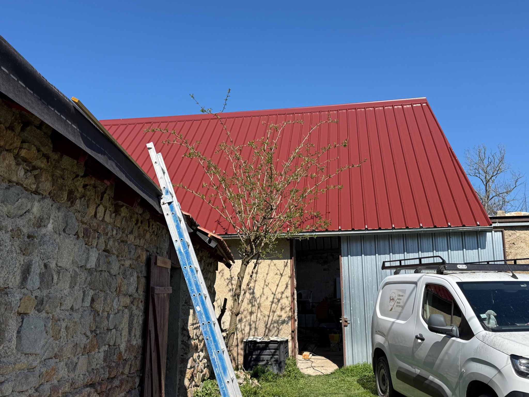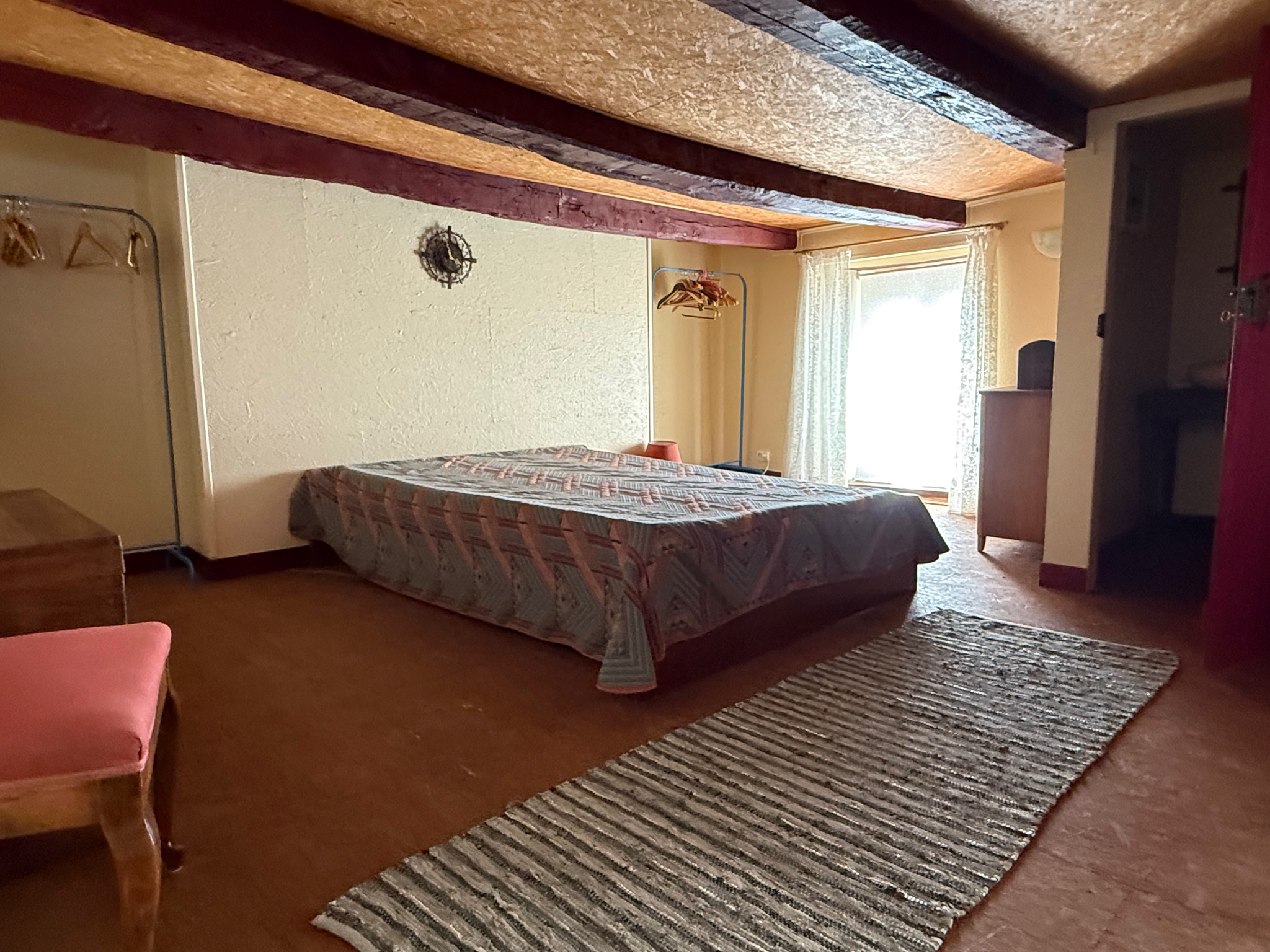 Auv 1143 : Maison habitable, dépendances, ruine, jardin, calme, 440m2. Dans cette charmante petite maison, il y a une dizaine d'années, de nombreux travaux ont été réalisés. L'installation électrique, la plomberie, une nouvelle fosse toutes eaux, de nouvelles fenêtres en PVC avec double vitrage, une porte d'entrée en bois, la salle d'eau, la cuisine, l'isolation du grenier, tous ces travaux ont été effectués en 2012 2013. Elle est donc habitable de suite. La surface intérieure de la maison fait 40m2. Il y a un grand espace de vie (27m2) avec un coin cuisine, une cheminée, un placard encastré, un plafond à poutres, un sol en béton recouvert d'un revêtement de sol, un chauffage électrique. Les 13m2 restants constituent actuellement une chambre avec une salle d'eau attenante avec douche, WC, lavabo et un raccordement pour une machine à laver. L'étage supérieur est un grand espace qui où on retrouve encore la hauteur d'origine, ou plutôt la basse hauteur, ce qui crée en fait un effet très cosy. Entre les poutres, la hauteur est que de 1m80 et sous les poutres les plus basses, elle est seulement de 1m60. Au-dessus, il y a un grand grenier avec une isolation posée au sol, actuellement inaccessible depuis l'intérieur de la maison. Il est évidemment envisageable de retirer ce plancher pour que l'étage soit ouvert jusqu'au faîtage, et de refaire et isoler le toit, mais cela représente une grande intervention. Actuellement, le toit est constitué de plaques de tôle ondulée contenant de l'amiante. À droite de la maison, il y a une petite terrasse couverte, un jardin devant avec la fosse septique récente, une microstation, déclaré conforme en 2013. Plus loin, le jardin s'élargit, est entouré de murs, et il y a une partie de la ruine qui peut être reconstruite ou transformée en un beau jardin extérieur supplémentaire. À gauche, il y a une grande grange (60m2) avec un nouveau toit en tôle, dotée d'une grande porte coulissante qui peut servir de garage, atelier, etc., ou bien sûr être modifiée pour d'autres usages. Derrière la maison, il y a également une partie couverte avec un toit récent. Tout à gauche, il y a encore un petit bâtiment original qui servait autrefois de débarras et de poulailler.
