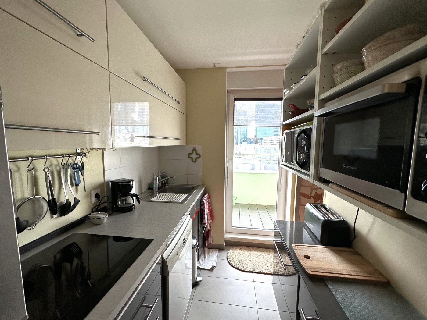 Appartement de deux pièces avec balcon filant, en étage d'un immeuble de standing. Il se compose d'une entrée desservant une cuisine équipée et séparée du séjour, d'une pièce à vivre, d'une salle de bains et d'une chambre.