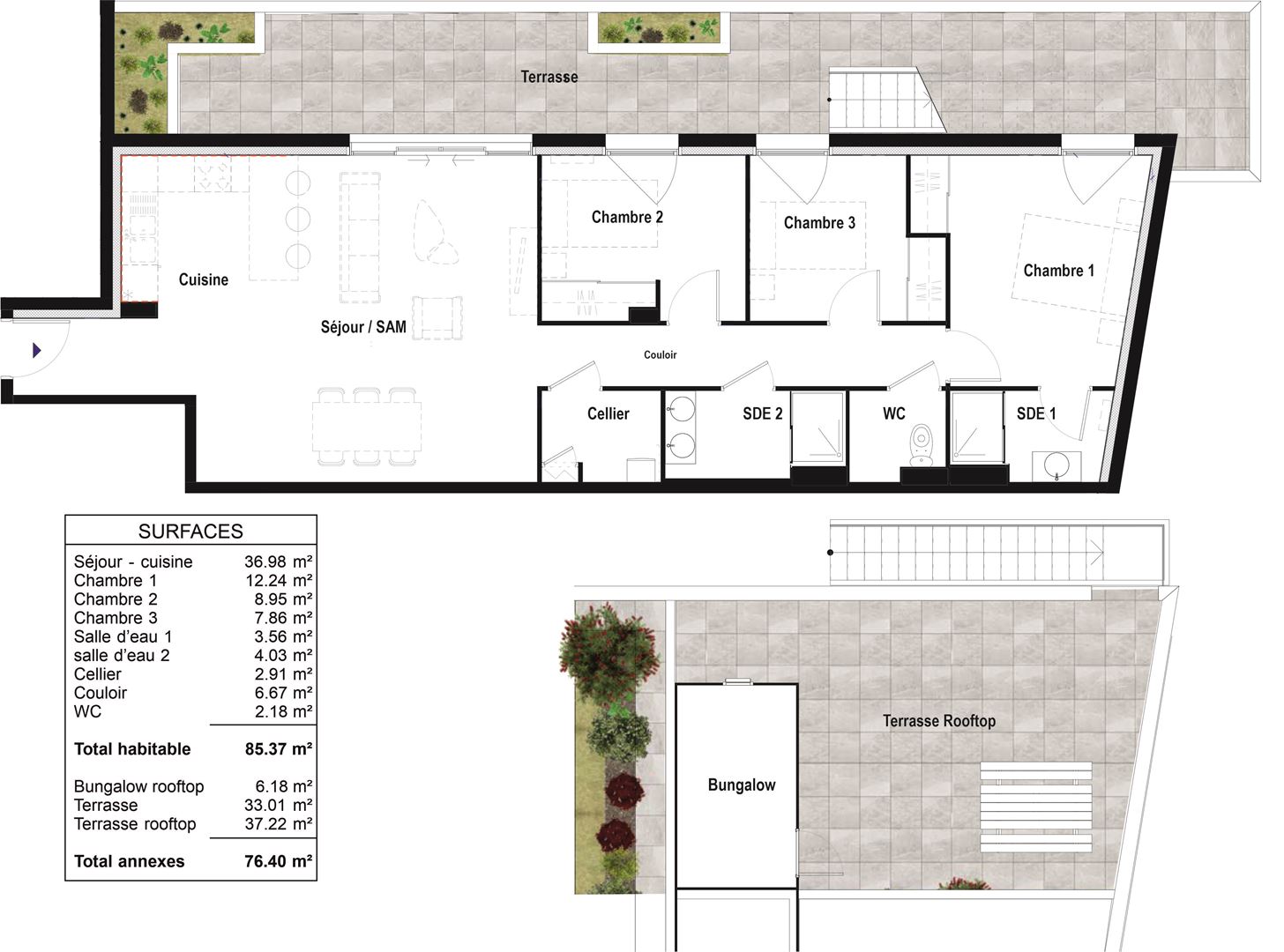 Beau T4, au dernier étage d'une petite résidence de 23 logements, située en lisière du programme d'aménagement urbain 'Euratlantique'. Ce nouveau quartier d'une superficie de 738 hectares dont cinquante hectares d'espaces verts, hébergera, à terme, 25 000 emplois, des écoles, salles de spectacle, équipements sportifs et culturels, crèches, écoles, collège, piscine et commerces. Desservi par deux lignes de tram et la LGV, il favorisera la mobilité de ses résidents. L'appartement d'une superficie de 85 m², offre une belle pièce de vie ouvrant à l'ouest, sur une terrasse de 33 m². Les trois chambres ouvrent également sur cette terrasse. L'une d'entre elle dispose d'une salle d'eau privative. Une deuxième est commune au deux autres chambres. Un cellier abrite le dispositif du réseau de chauffage urbain. De la terrasse, un escalier extérieur permet d'accéder, sur le toit de l'immeuble, à une terrasse privative, en rooftop, de 37 m² agrémentée d'un bungalow. L'appartement dispose d'une place de stationnement et sera disponible début 2021. Taxe foncière 1500 euro, charges mensuelles 140 euro. Les honoraires sont à la charge du vendeur.