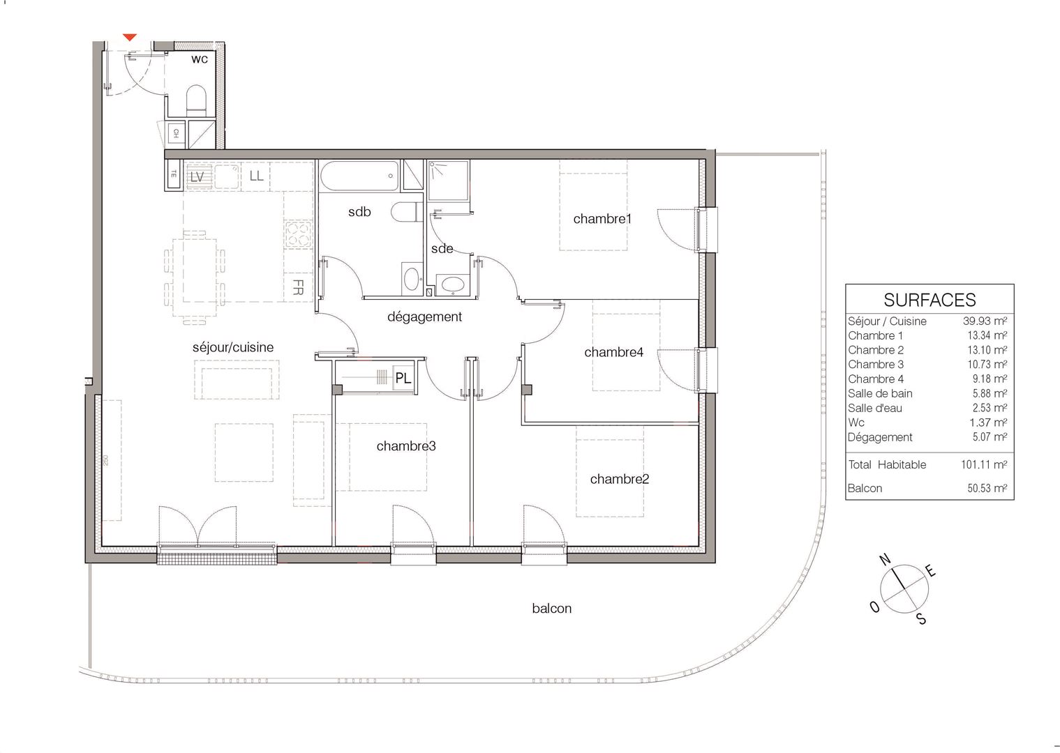 Beau T5, de 101 m² habitables, neuf, frais de notaire offerts, au troisième étage d'une résidence de 38 logements, située au Bouscat, entre lhippodrome et le parc de la Chêneraie, le long du trajet du tram D. Il se compose d'une entrée, d'une grande pièce de vie orientée Sud, ouvrant sur un très grand balcon de 51 m², de quatre chambres, dont une pourvue dune salle deau privative, dun WC. et d'une salle de bains. Conforme à la norme BBC RT-2012, il dispose d'un chauffage individuel au gaz. Il est doté de deux places de stationnement au sous-sol. Le tram D, vers Bordeaux-centre sarrête à 150 m. Les commerces sont présents tout le long de lavenue et trois des lycées privés les plus prisés de bordeaux sont à 2 kilomètres. Taxe foncière 1900 euros, charges mensuelles 160 euros, honoraires à la charge du vendeur. Les informations sur les risques auxquels ce bien est exposé sont disponibles sur le site Géorisques : www.georisques.gouv.fr.