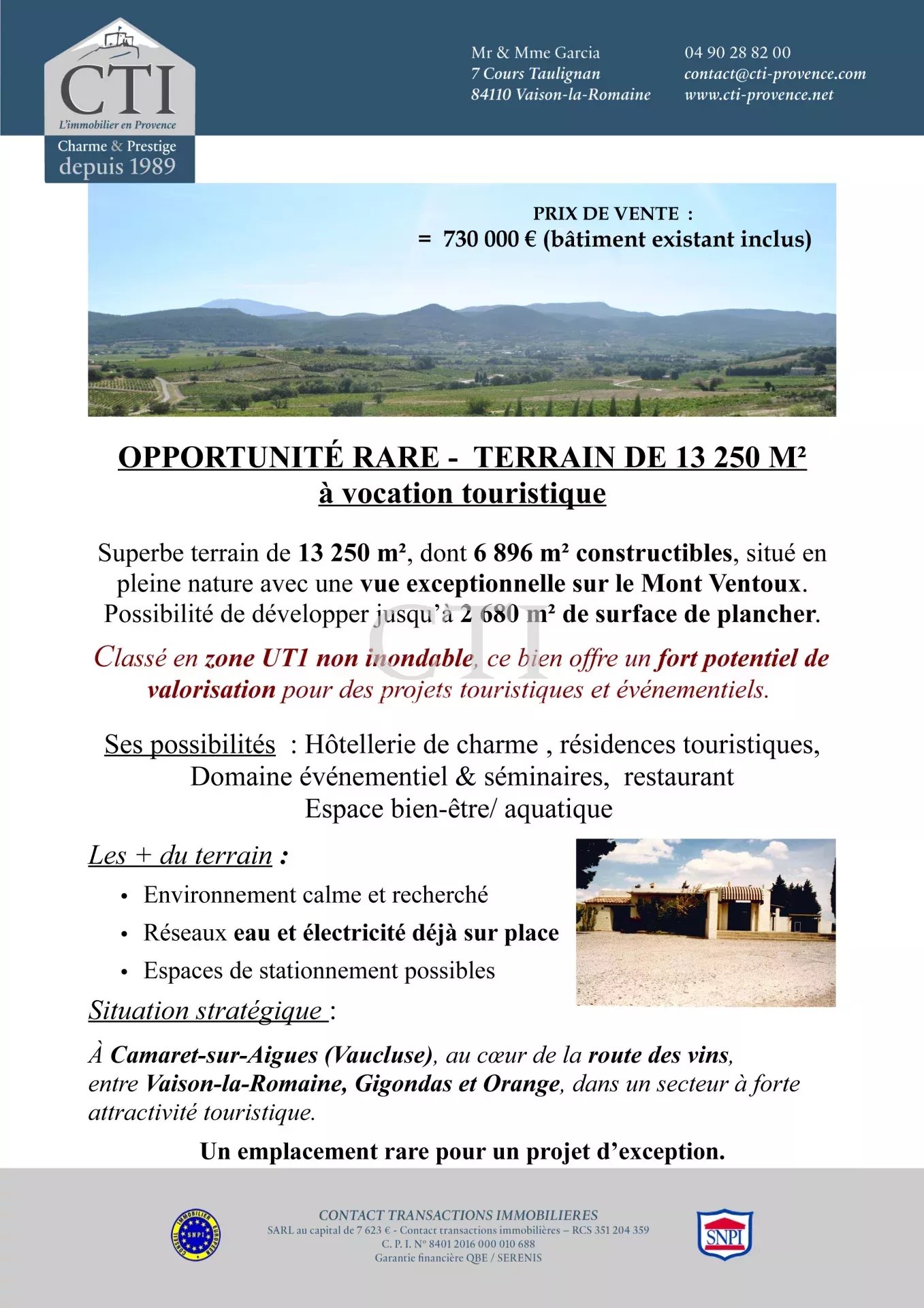 TERRAIN DE 13 250 M² Exclusivité - A vendre - Superbe terrain de 13 250 m², dont 6 896 m² constructibles, situé en pleine nature avec une vue exceptionnelle sur le Mont Ventoux. Possibilité de développer jusqu’à 2 680 m² de surface de plancher. Classé en zone UT1 non inondable, ce bien offre un fort potentiel de valorisation pour des projets touristiques et événementiels. (Bâtiment à restaurer de 300 m² env.) Idéal pour : * Création de résidences de vacances ou hôtellerie de charme (Possibilité de créer 30 pavillons ou plus) * Domaine événementiel & séminaires * Restaurant * Espace bien-être/ aquatique Situation stratégique : À Camaret-sur-Aigues (Vaucluse), au cœur de la route des vins, entre Vaison-la-Romaine, Gigondas et Orange, dans un secteur à forte attractivité touristique. Un emplacement rare pour un projet d'exception. Prix demandé 730 000 €
