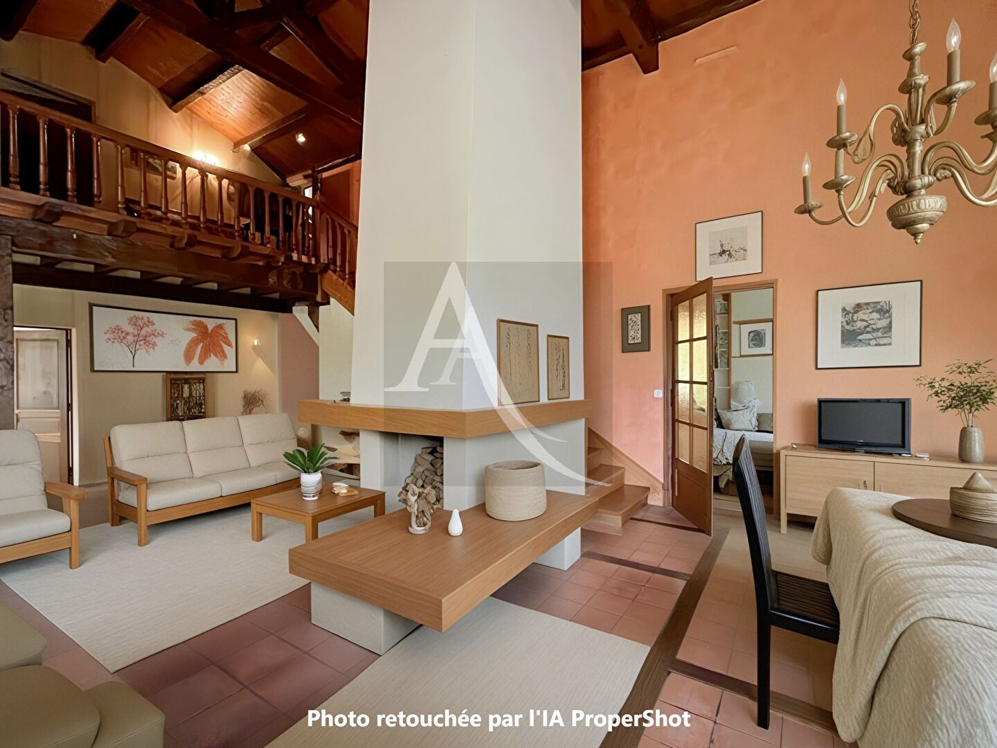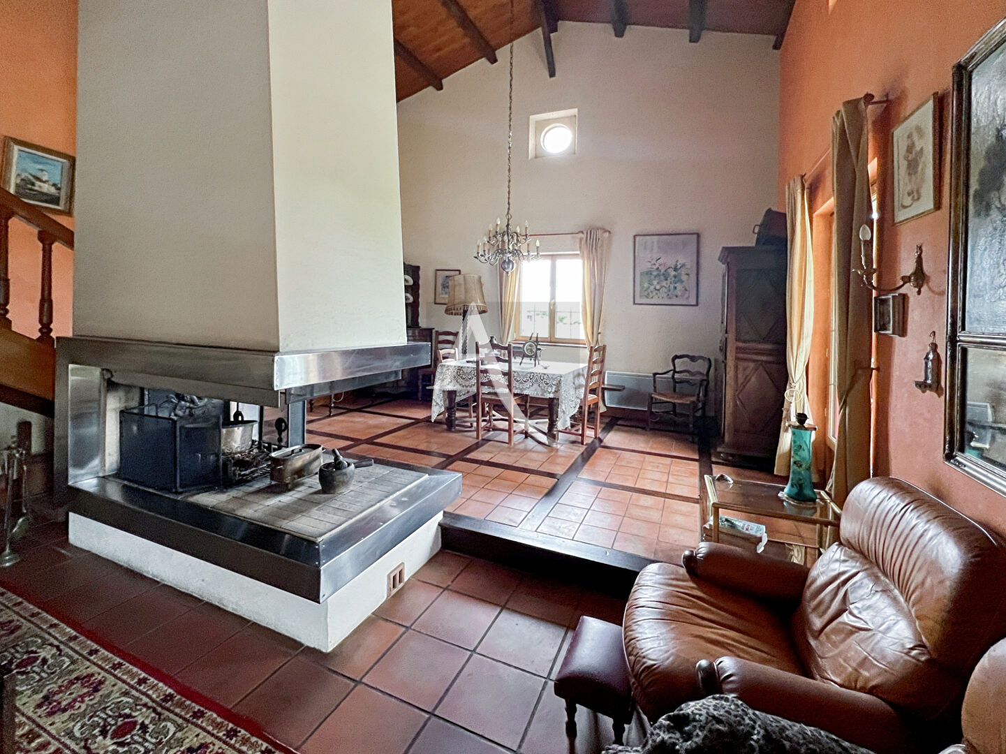 Maison qui offre de plain pied, une entrée sur une belle pièce de vie avec cheminée centrale, une cuisine aménagée ouverte sur un auvent, pour manger l'été ... Une chambre avec une salle d'eau (douche à l'Italienne récente), un couloir distributeur, un wc, un cellier avec une cave, un bureau. A l'étage une mezzanine, une chambre avec salle d'eau et wc. Combles. Double garage Auvent Terrain : 1958 m2 Piscine 11x5 avec pool house (liner a changer) Foncier : 1300 euros Les atouts : maison en parfait état des beaux parquets bois, fenêtre alu, et bois à l'intérieur, tout à l'égout, avec une pièce de vie qui offre volume et clarté ..