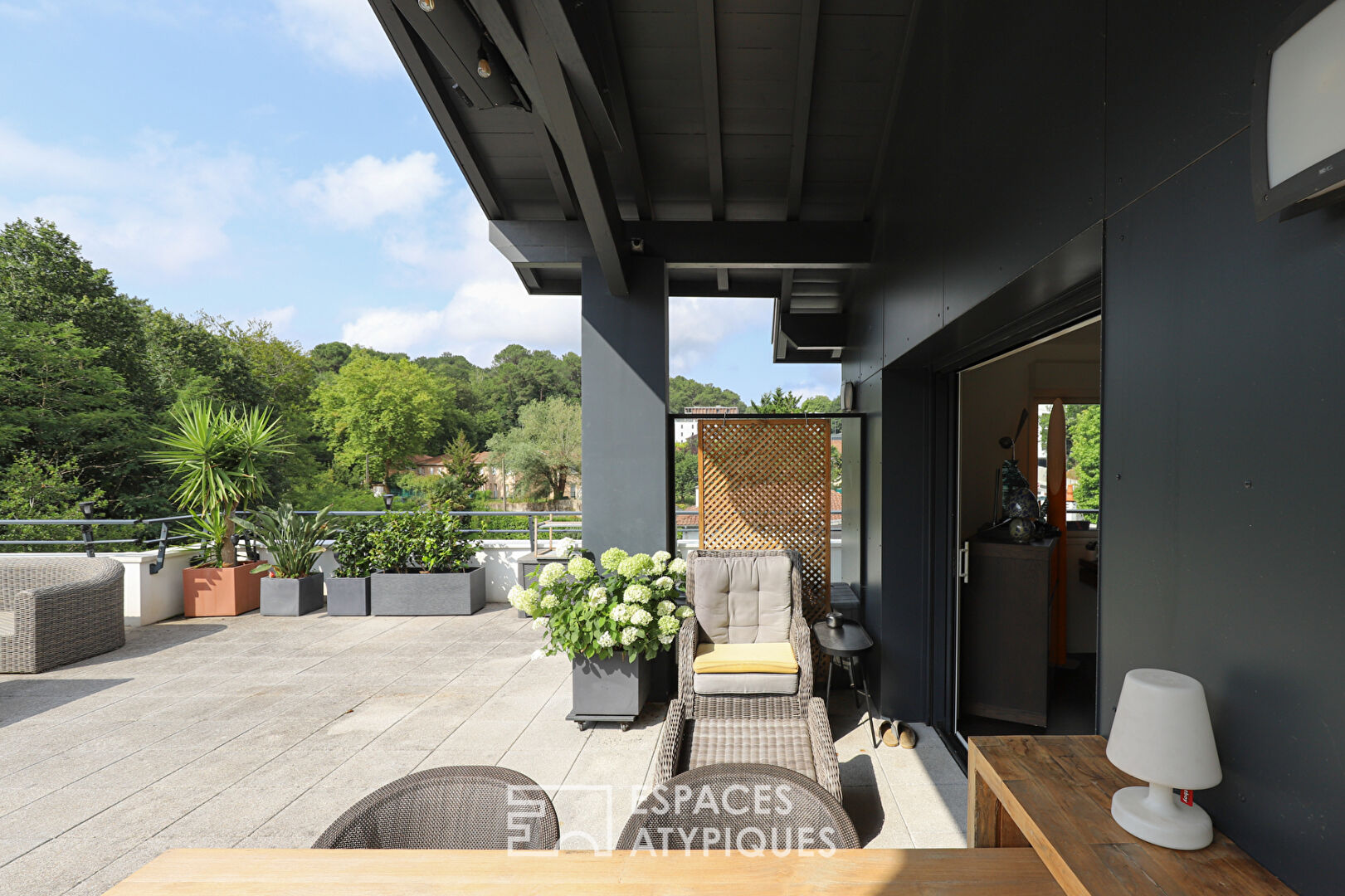 ANGLET proche BIARRITZ Bel Appartement en Duplex de 162m2 situé au 1er et 2ème étage, en TBE. Dans Résidence de Standing de 2003: Hall d'Entrée, Séjour 48m2 très lumineux sur Terrasse Sud de 33m2, 3 Chambres donnant sur grand Balcon dont une Suite Parentale avec Salle d'Eau et Dressing, Spacieuse Cuisine Aménagée, Lingerie, Bureau, SDB, 3 wc, Nbrx Placards. Clim. Reversible. Garage 2 Voitures + Parking ext et Cave.Proximité commerces, Trambus.... Possibilité de redistribuer en 2 appar