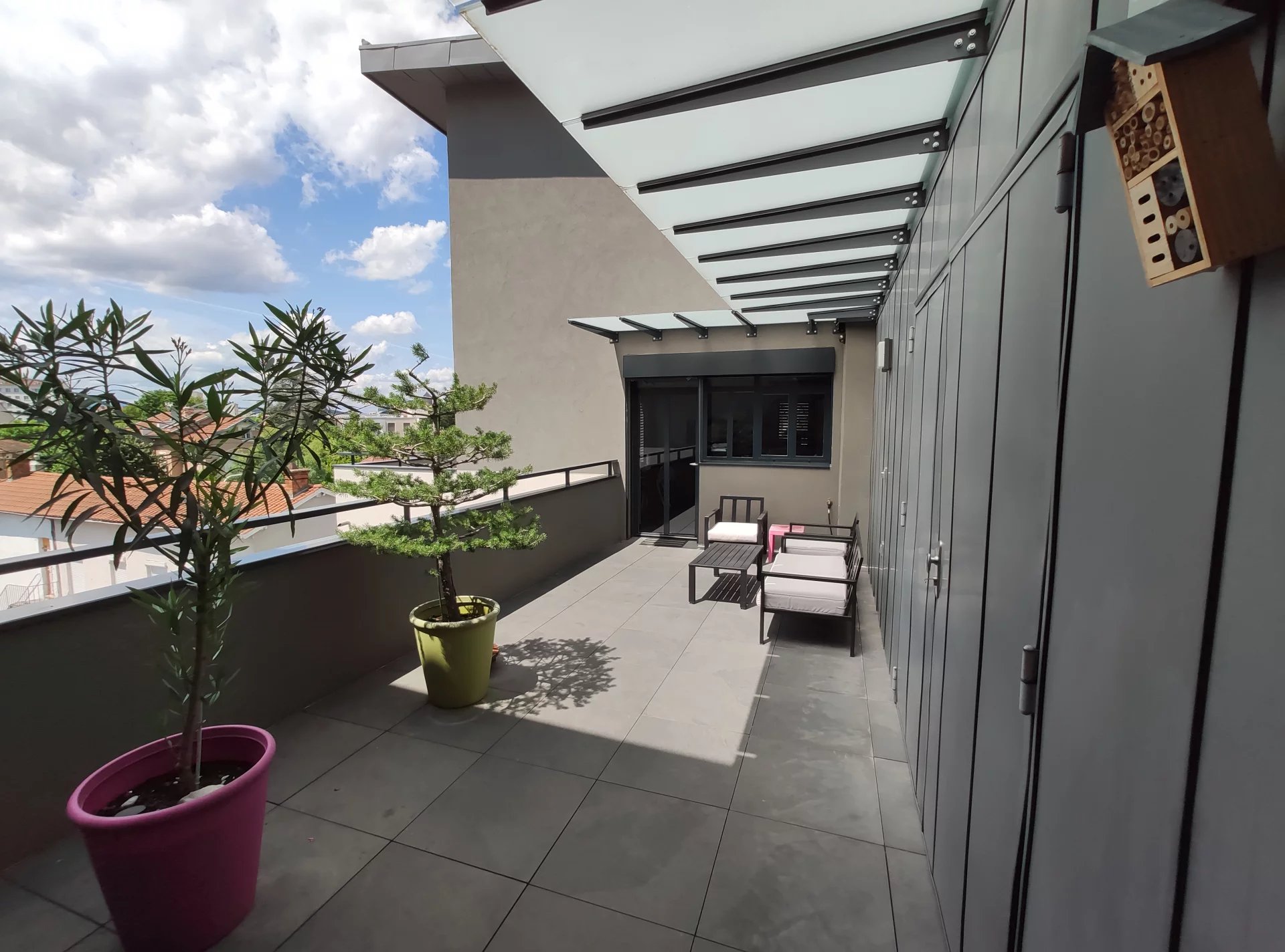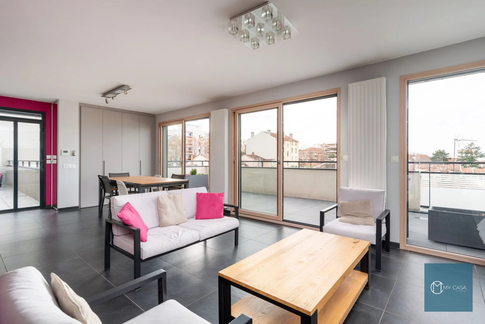 EXCLUSIVITÉ - Dorothée Ansoud vous propose en plein coeur de MONTCHAT, à 5mn à pied du tramway, au pieds des commerces et des écoles... Au 3ème et dernier étage, avec ascenseur, d'une résidence récente (2016) de standing (UTEI), ce superbe T4 toit terrasse en Duplex de 100 m2 env. avec accès privatif par une première terrasse de 27 m2 exposée Sud. Il se compose d'une cuisine équipée SCHMIDT et ouverte sur séjour pour une pièce de vie de 42 m2 donnant accès à une seconde terrasse de 39 m2 avec une vue imprenable sur Lyon, une suite parentale avec salle de bain, un wc séparé et un coin buanderie. A l'étage, deux chambres avec chacune des rangements intégrés sur mesure, une salle d'eau et wc. Chauffage individuel Gaz. Double vitrage. Fermeture électrique des volets BSO. Raccordement à la Fibre Optique. En sous-sol, un garage fermé et une place de parking privative. Un local vélo. Contact My Casa Immobilier: 04.72.60.97.02 / 06.70.74.29.23