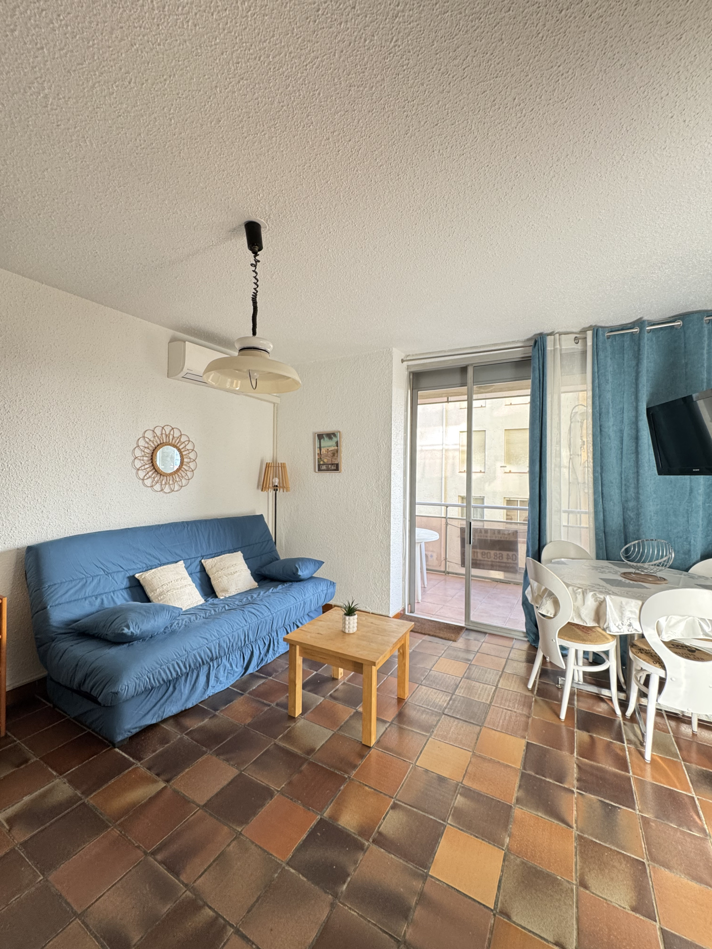 Canet plage coté port, charmant appartement 2 pièces avec terrasse vue mer, cuisine équipée ouverte sur salon avec couchage canapé, salle d'eau avec douche à l'italienne et wc et chambre avec placard. Proche de tous les commerces et direct accès plage. Climatisation. (linges de lits non compris dans la location).