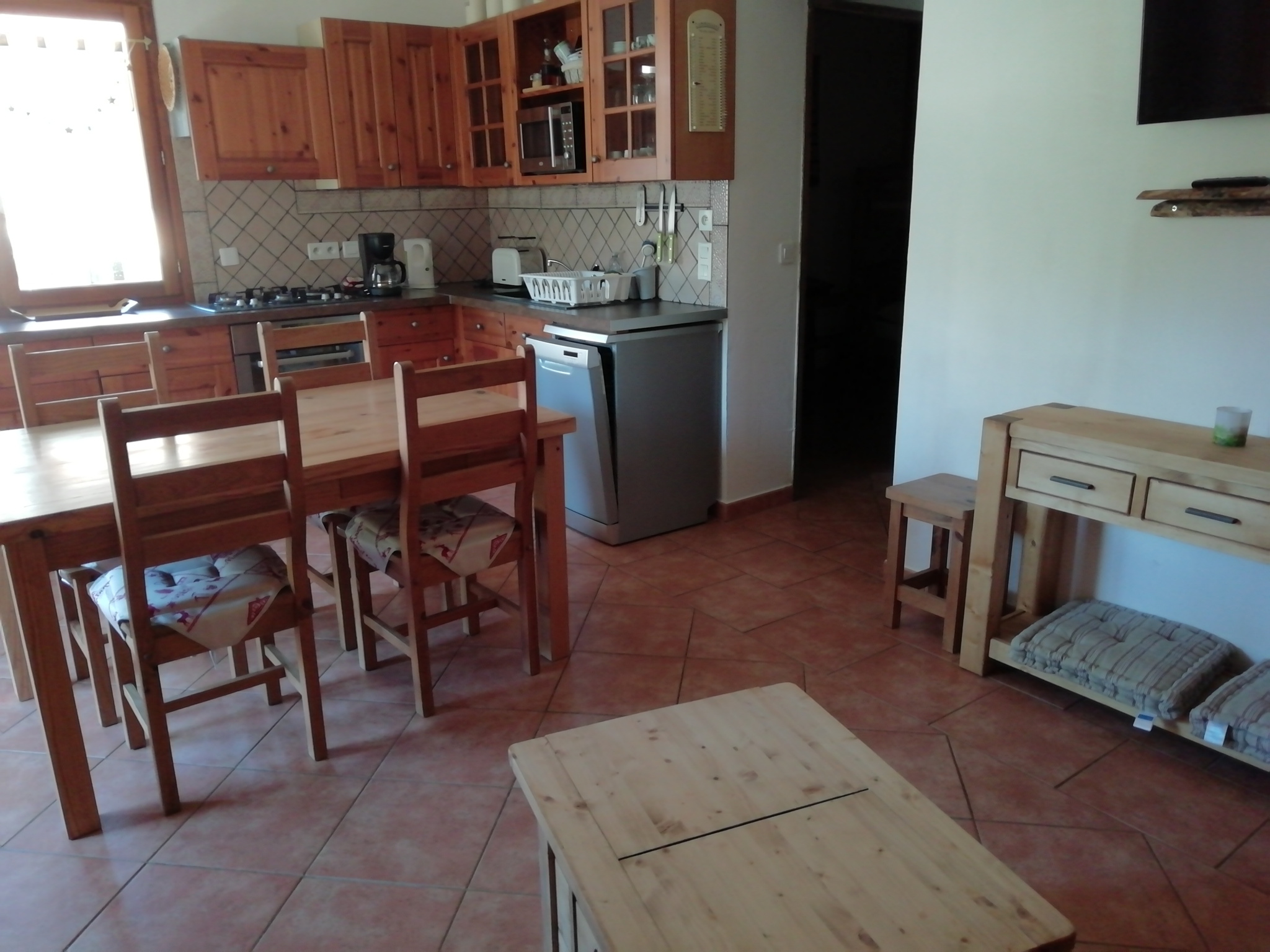T3 Grand confort 60 m2, rez de jardin avec terrasse et mobilier de jardin; Cuisine équipéeouverte sur terrasse : (réfrigérateur avec petit congélateur, four micro-ondes et électrique + 4 feux gaz, lave-vaisselle) ouverte sur séjour. Télévision. Wifi gratuit. Grand dressing avec lave-linge, 1 chambre (lit 140) avec grande armoire et coin bureau, ouvert sur terrasse + 1 chambre avec lits superposés - Salle d'eau avec douche WC séparé.Terrasse avec mobilier de jardin. (SPA privatif). Espace extérieur pour vélo -ski....