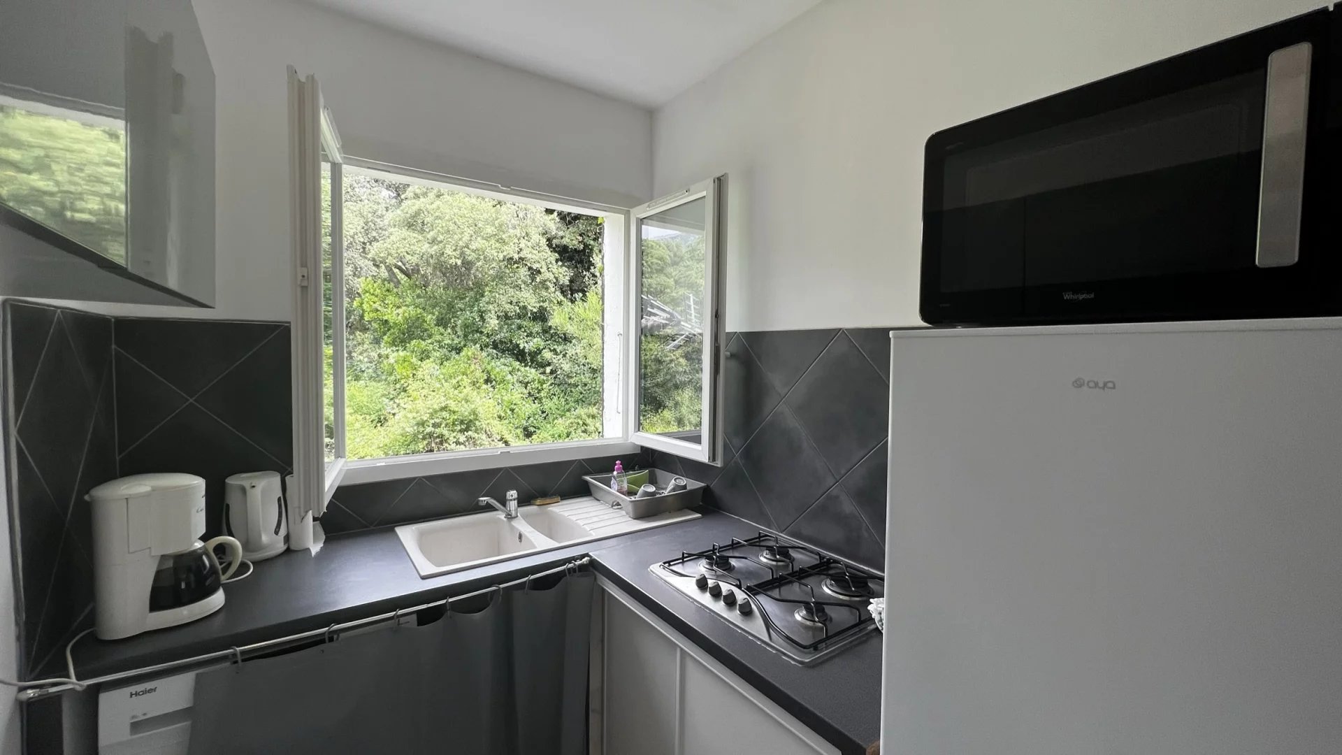 Mini-villa situé à 1.5 km du village de Moriani plage et de ses commodités. Sa surface d'environ 42m² et sa terrasse de 15 m2 vue piscine et parc, une pièce principale composée d'un séjour et de sa cuisine ouverte avec une fenêtre vue campagne, une terrasse, une salle de douche en travertin, le wc indépendant. Le bien est climatisé, parking privé, Piscine. Petite résidence de 14 lots.