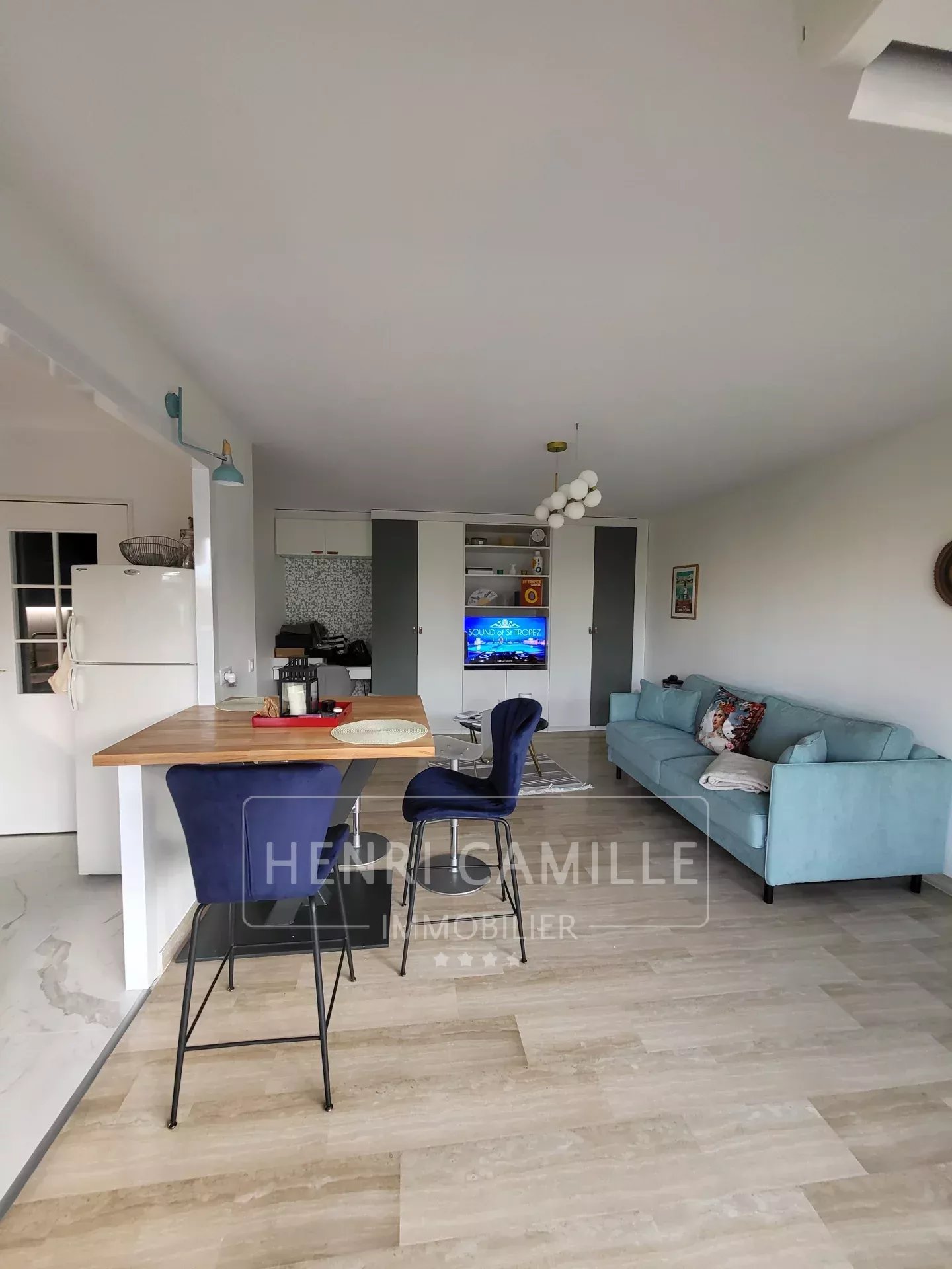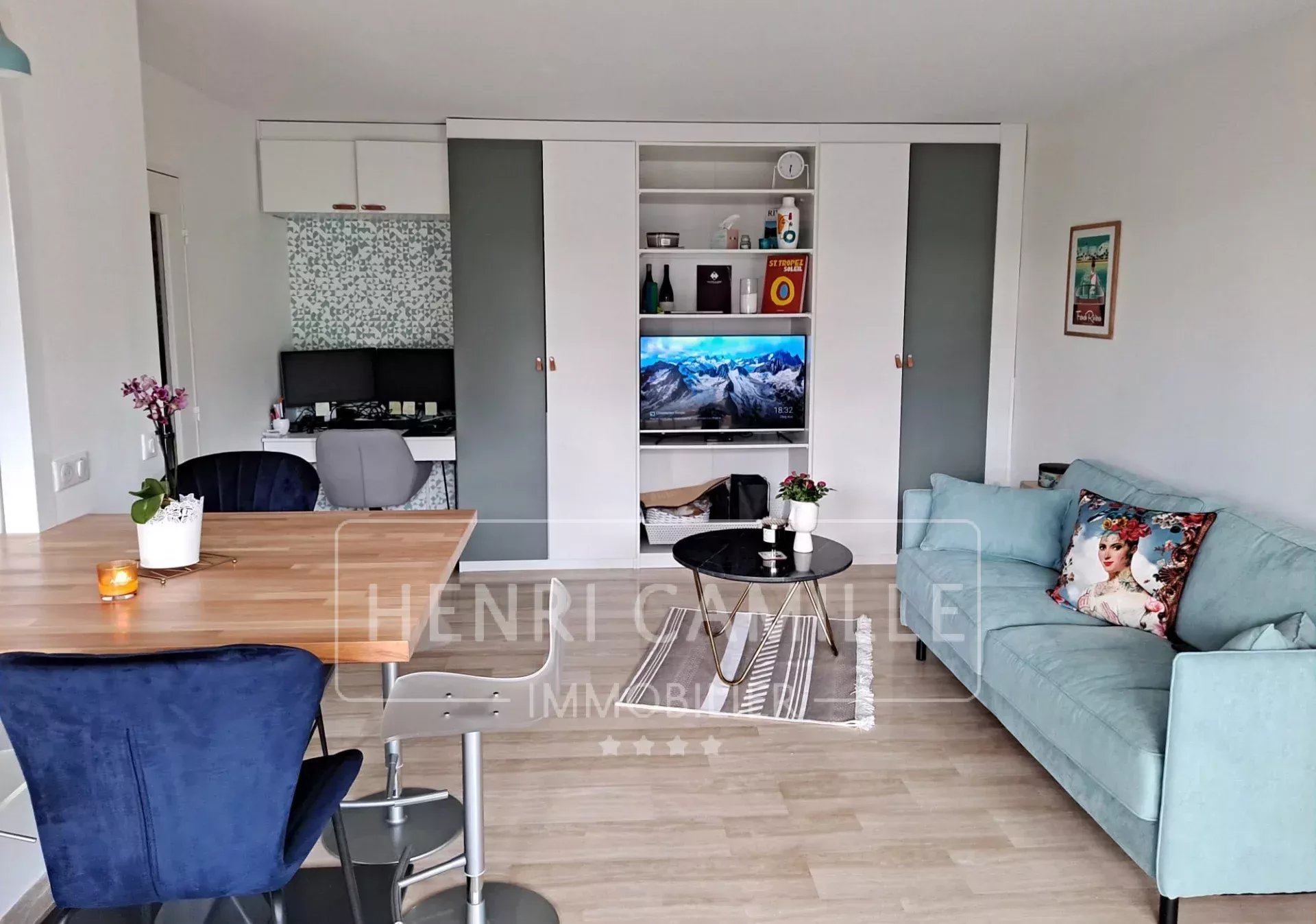 Il se compose d'un très beau salon avec un canapé lit ( vrai lit 160 cm ) avec cuisine moderne à l'américaine, équipée, une belle chambre avec lit double 160 cm avec sa salle de bain attenante, un WC séparé, un coin bureau, une grande terrasse aménagée,