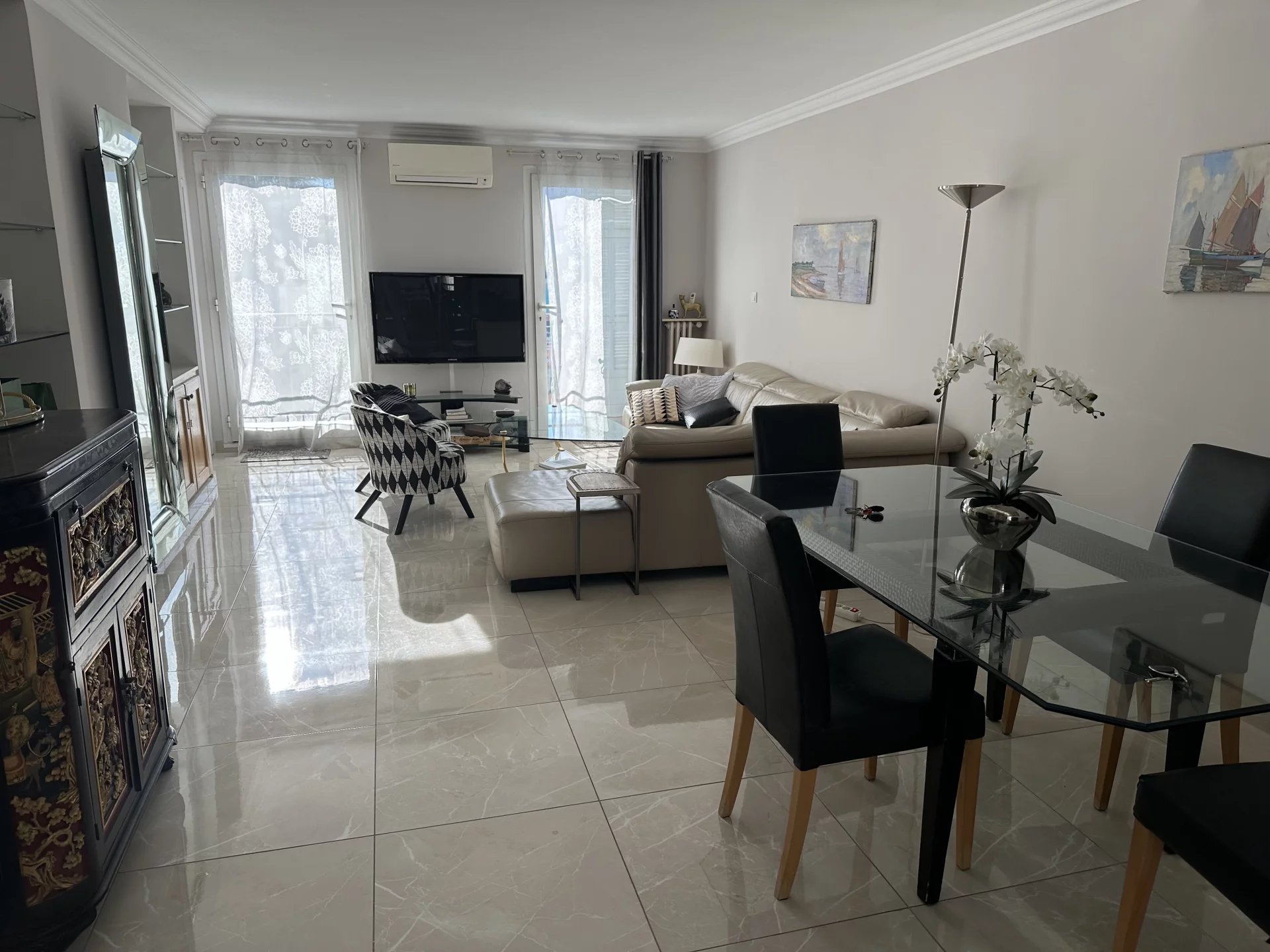 Très agréable appartement 3 chambres très bien situé à Cannes en face du Palais et de l'entrée du Théâtre Debussy. -2 terrasses , 1 au sud avec possibilité de mettre une banderole et 1 au nord plus large pour les receptions ou repas. - 2 salles de bains: 1 avec baignoire et wc et 1 avec douche. - 1 wc séparé Ascenseur, clim