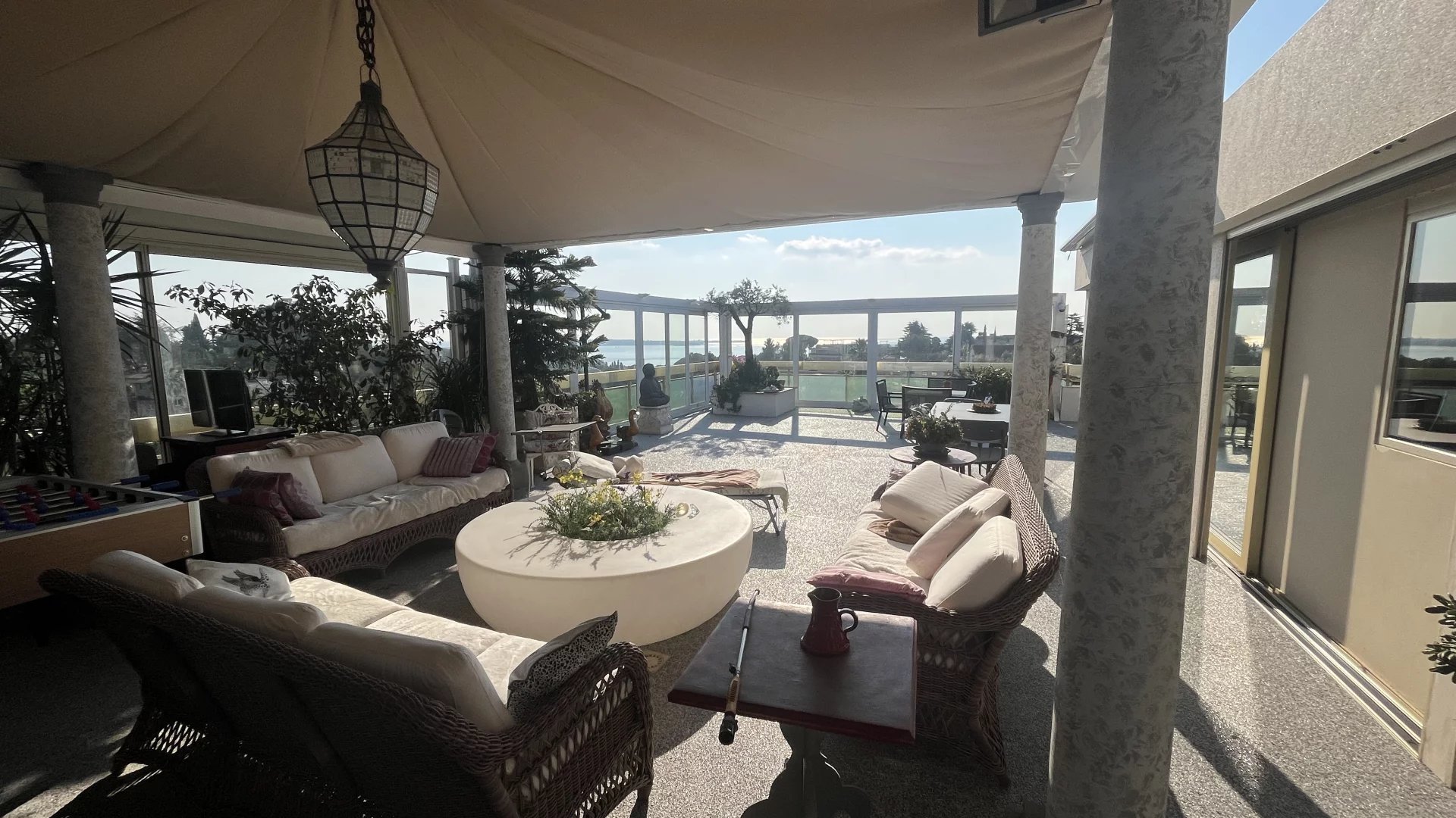 Dans résidence intimiste ,avec piscine , au calme absolue , luxueuse Villa Toit de 220m2 habitables, exposition sud ,accès privatif par ascenseur direct ,se composant: entrée ,placards ,vestiaire, toilette invités,bureau(chambre) grande réception avec en suite salle à manger et cuisine haut de gamme ouverte, équipée,une chambre de maître avec en suite douche,baignoir,wc et fitnes,une troisième chambre avec douche, wc et placard,le tout donnant sur une terrasse de 130m2 avec jacuzzi et vue sur les îles de Lérins et l'Esterel.Pour compléter un double box en s/sol et 2 parkings privatif et une cave sont attachés au bien. Offrez vous le privilège d'une visite !