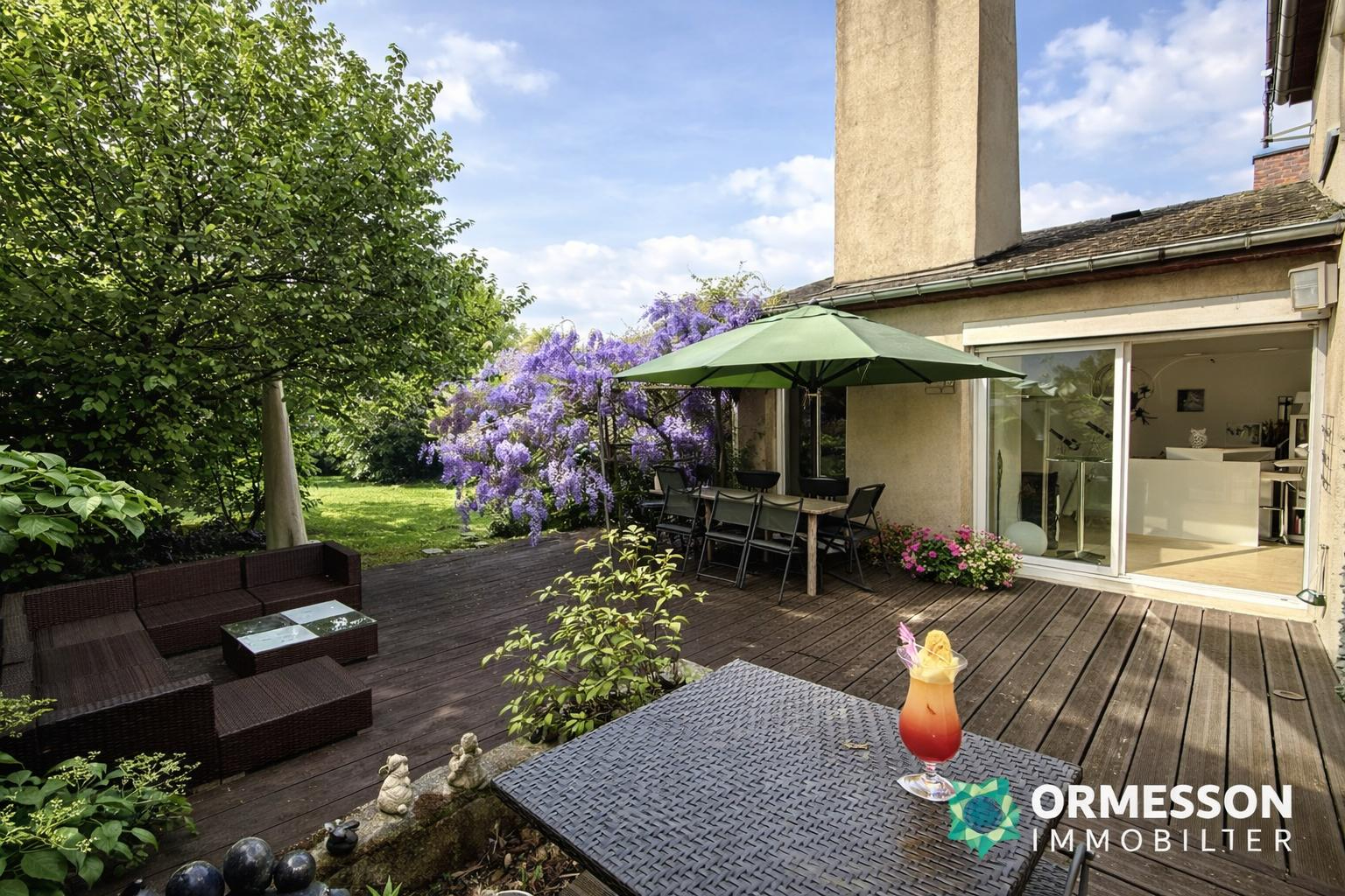 Ormesson Immobilier vous présente cette maison d'architecte de plain pied d'une superficie 180 m², à l'abri des regards, située dans un quartier recherché, à proximité de la gare de la Barre Ormesson. La maison se compose d'une entrée ouvrant sur un vaste séjour baigné de lumière, prolongé par un coin salle à manger et un espace cosy avec cheminée. La cuisine, entièrement équipée, est indépendante. Un WC séparé ainsi que de nombreux rangements complètent ce niveau. L'archit