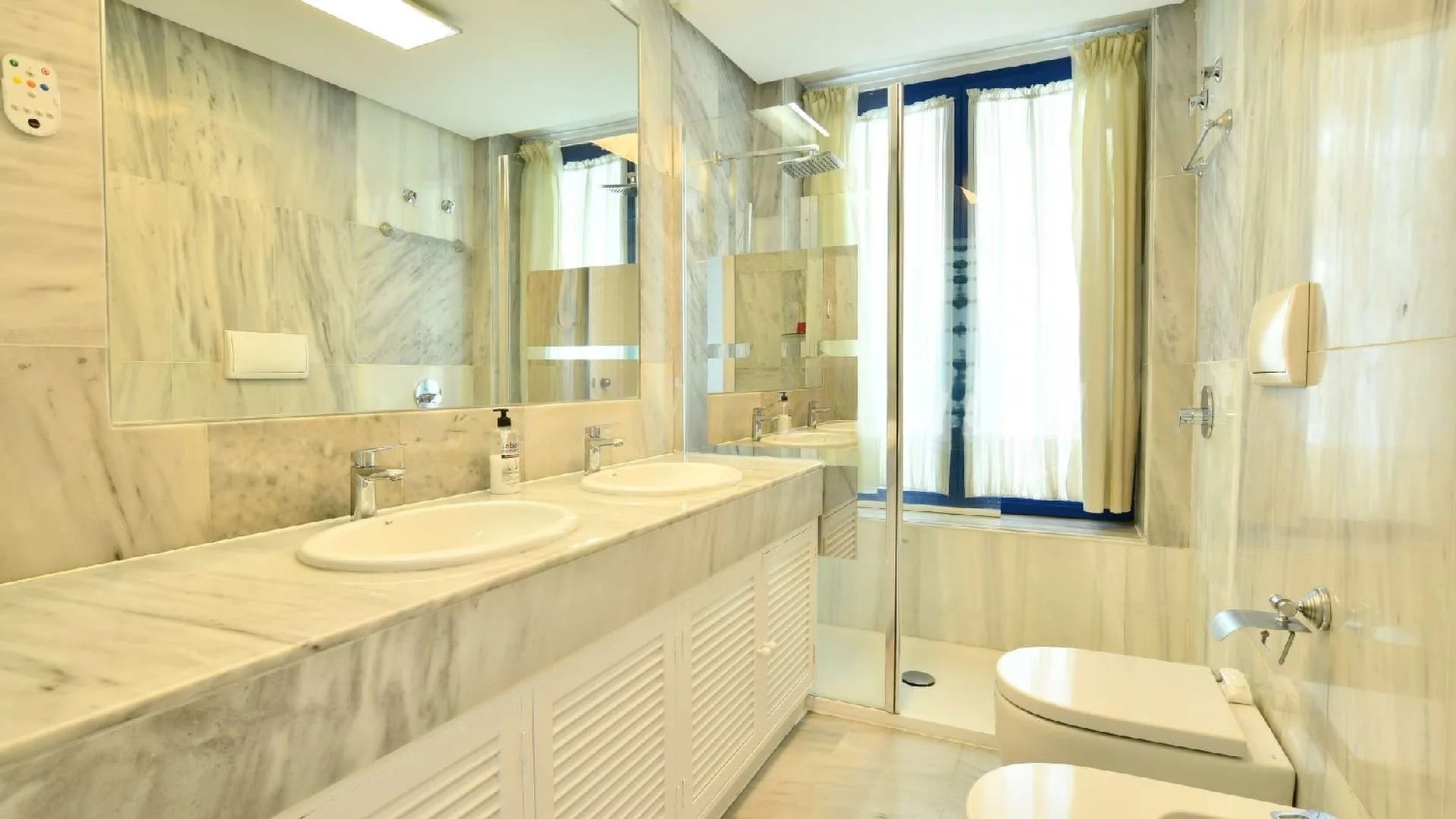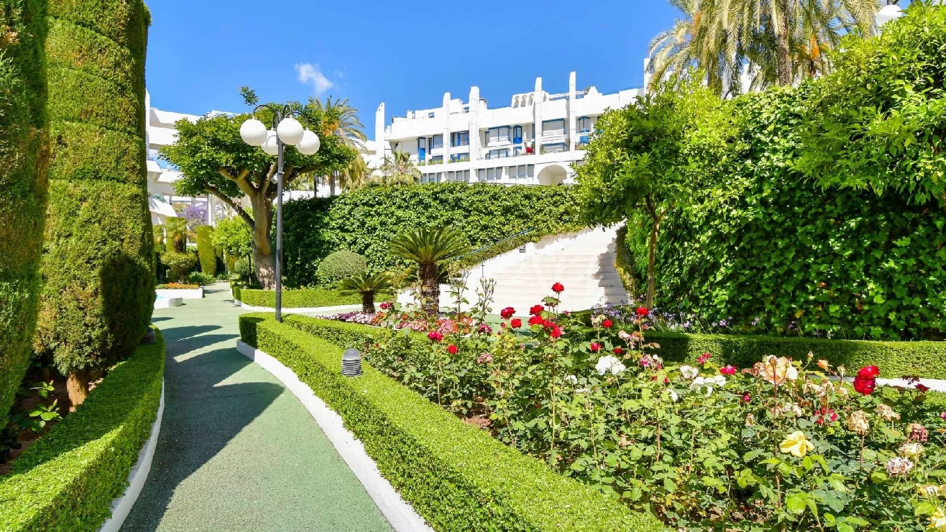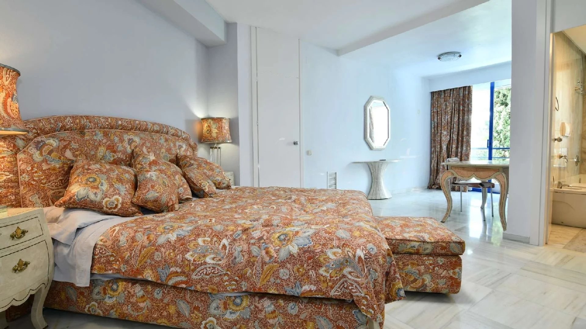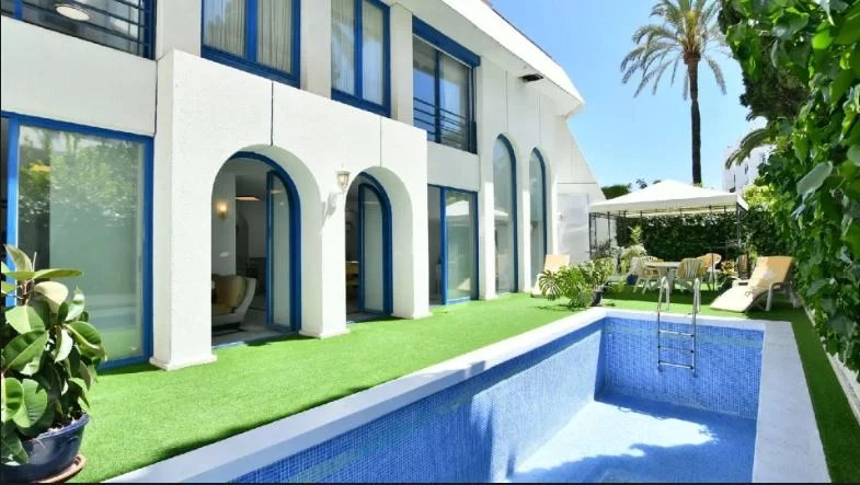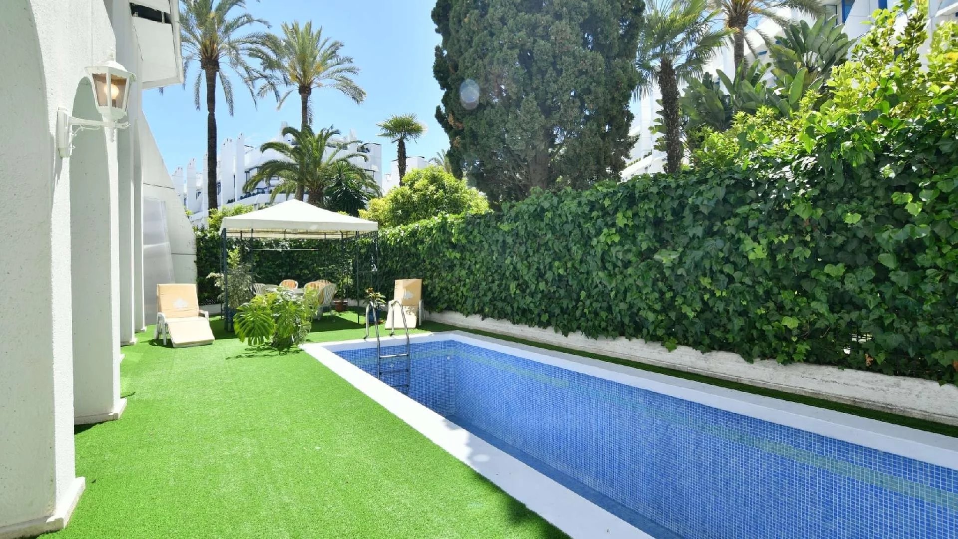 Duplex with private pool in the urbanization Marbella House, one of the most prestigious of Marbella, with 24hrs security, at unbeattable location next to the beach and with all the advantages of the center. Amazing tropical gardens, gym, squash, sauna, etc. The property is distributed on two very spacious floors. The entrance floor has a large living room with fireplace and three differentiated ambiances, as well as large floor to cealing glass doors that lead to the private garden of 110 meters, with a pool and southwest facing. On this floor there is also a separate kitchen and a toilet. Upstairs there are three very spacious bedrooms with en suite bathrooms. Marble floors and bathrooms, air conditioning hot / cold, two fireplaces in perfect use, three parking spaces and storage room, all included in the price.