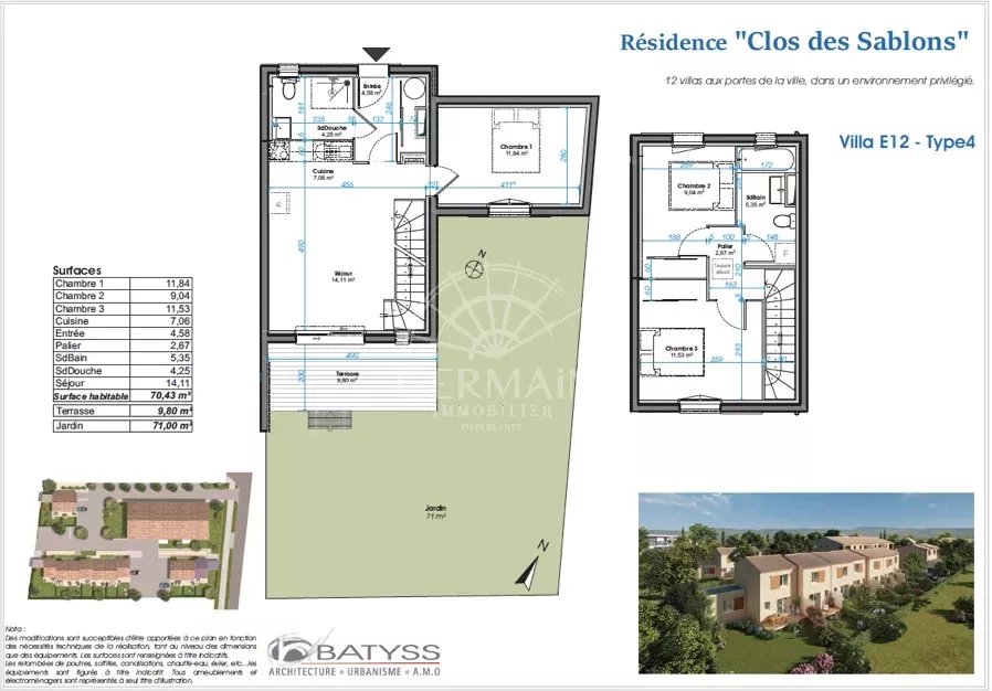 Découvrez avec nous ce nouveau PROGRAMME NEUF ! Nous vous proposons la dernière villa de type 4 avec jardin et 2 places de parking idéalement située aux portes de la ville. Cette villa se compose en Rez-de-Chaussée d'un hall d'entrée, d'un séjour avec cuisine ouverte, d'une salle d'eau avec wc conforme à l'accessibilité des personnes à mobilité réduite et d'une chambre de 12 m² . Au 1er étage, vous trouverez 2 chambres avec placards et une salle de bains avec wc. À l'extérieur vous profiterez d'une jolie terrasse en bois donnant sur le jardin clos de 71 m², 2 places de parking complètent l'ensemble. Construites dans le respect de la réglementation RE 2020, elle vous offrira un confort thermique de qualité. L'ensemble des plans et la notice descriptive sont disponibles sur simple demande. Frais de notaire réduit - livraison Mars 2025 - Dispositif PINEL +