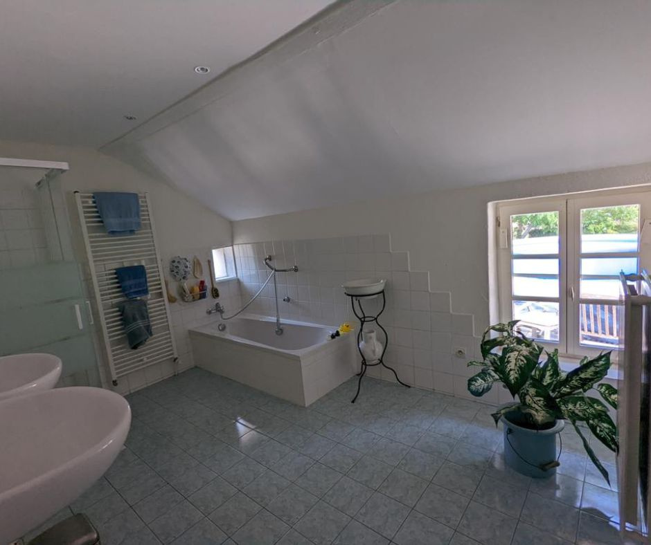 À côté du salon se trouve un couloir, une chambre avec des portes-fenêtres donnant sur le jardin, une grande salle de bains avec chauffage au sol, cabine de douche et baignoire, et des toilettes séparées.