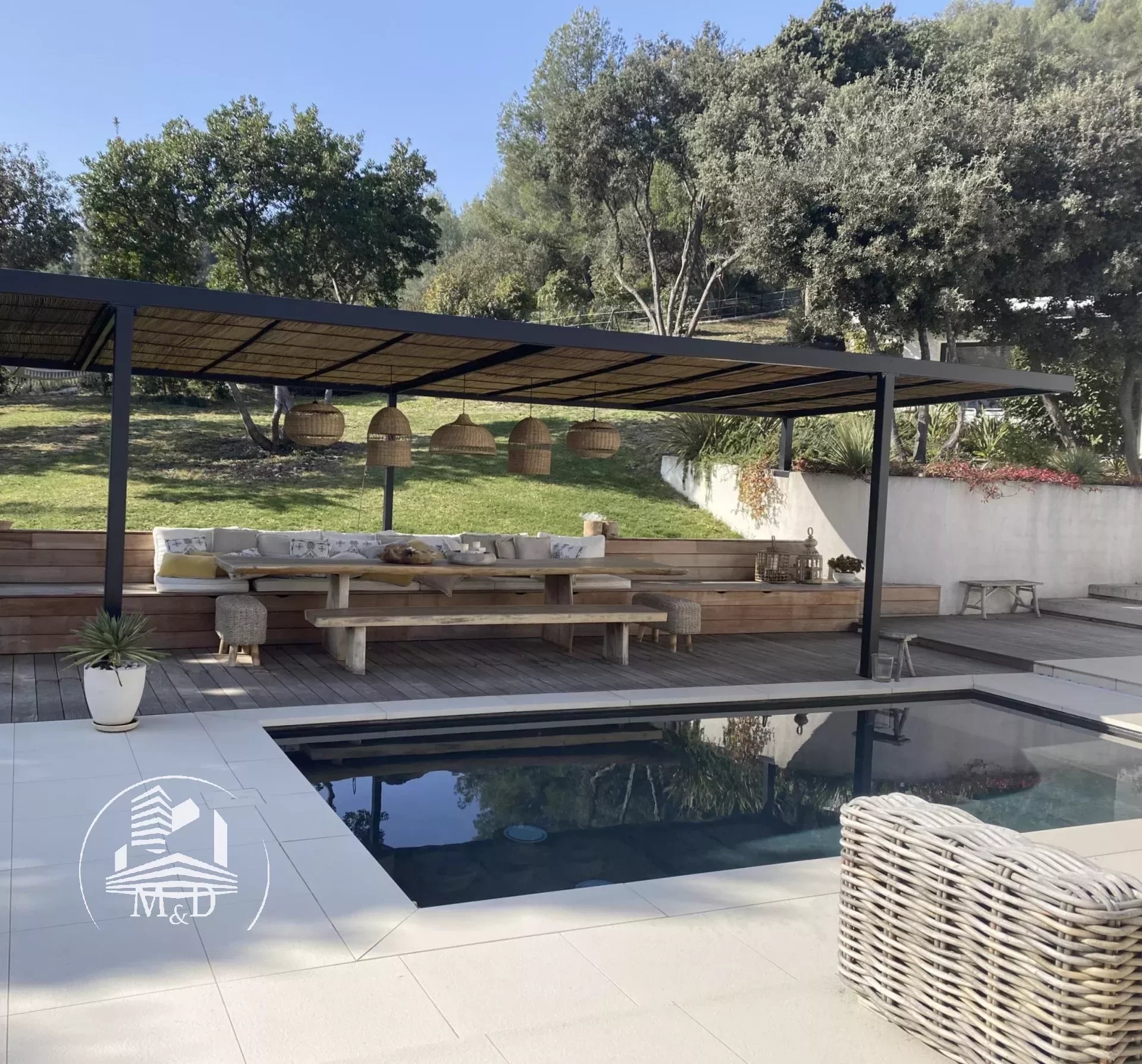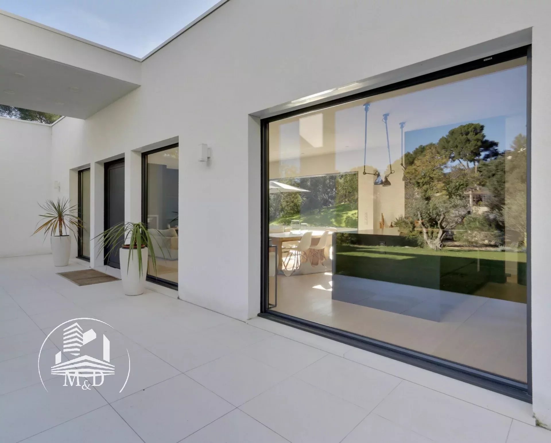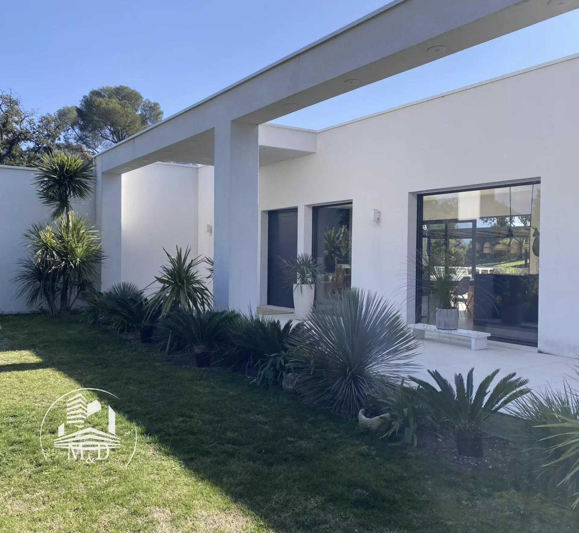 Maison T5 neuve comprenant une cuisine ouverte sur une grande pièce de vie lumineuse avec grandes baies coulissantes, un cellier/buanderie, une salle de bain, 4 grandes chambres avec placard dont une suite parentale avec dressing et salle d'eau, deux wc, et un garage. Construction sur mesure avec prestations de qualité : domotique, chauffage au sol avec pompe à chaleur, climatisation réversible, volets roulants électriques en alu, menuiseries en alu gris anthracite, piscine... Plus d'infos sur notre site.