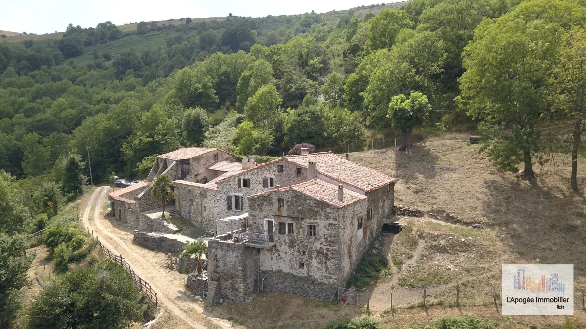 Surplombant les contreforts du Mont Canigou dans les environs de Perpignan, à quelques minutes Céret. Cette propriété de caractère à restaurer a été construite sur un beau terrain d'environ 2ha de bois et de près, avec vue imprenable et un calme assuré. La propriété se compose actuellement de 3 logements formant à eux trois 479 m² habitables et un potentiel habitable de 140 m² supplémentaire: La partie principale d'environ 195 m² habitables sur 2 niveaux et comprenant une terrasse avec vue panoramique et une piscine. Un salon / salle à manger / cuisine d'environ 101m², 3 chambres, deux salles de bains, wc, une terrasse de 40m², d'un garage avec atelier, d'une pièce de 35 m² à restaurer et d'un hall à aménager. Deuxième partie d'environ 177 m² habitables sur deux niveau avec terrasse avec vue panoramique : Un salon / pièce cheminée de 45 m² avec cuisine de 35 m², chambre avec placard, salle d'eau /wc, buanderie, sous les toit 3 chambres, salle d'eau /wc, grenier accès et d'un grenier de 35 m² à restaurer. Troisième partie d'environ 107 m² habitables sur deux niveau avec balcon et vue panoramique : Un salon de 39 m², salle d'eau / wc,et une pièce à restaurer de 17m² , sous les toits une cuisine de 39 m² et une mezzanine de 14m². Un lieu et une ambiance, tout à fait unique! exclusivement chez .