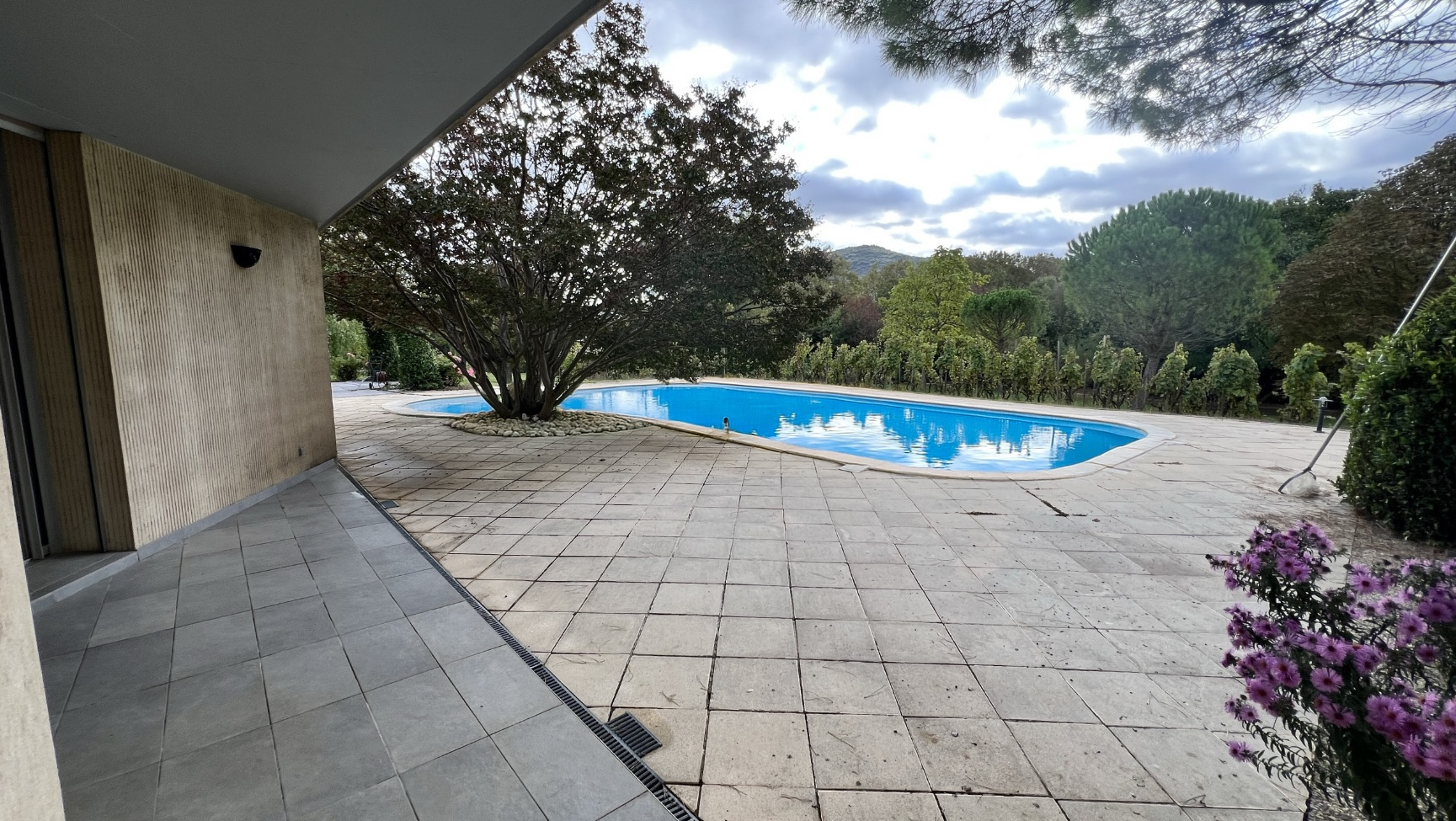 À l'extérieur, la terrasse de 200 m2, ensoleillée et parfaitement aménagée, entoure la majestueuse piscine, idéale pour les journées d'été.