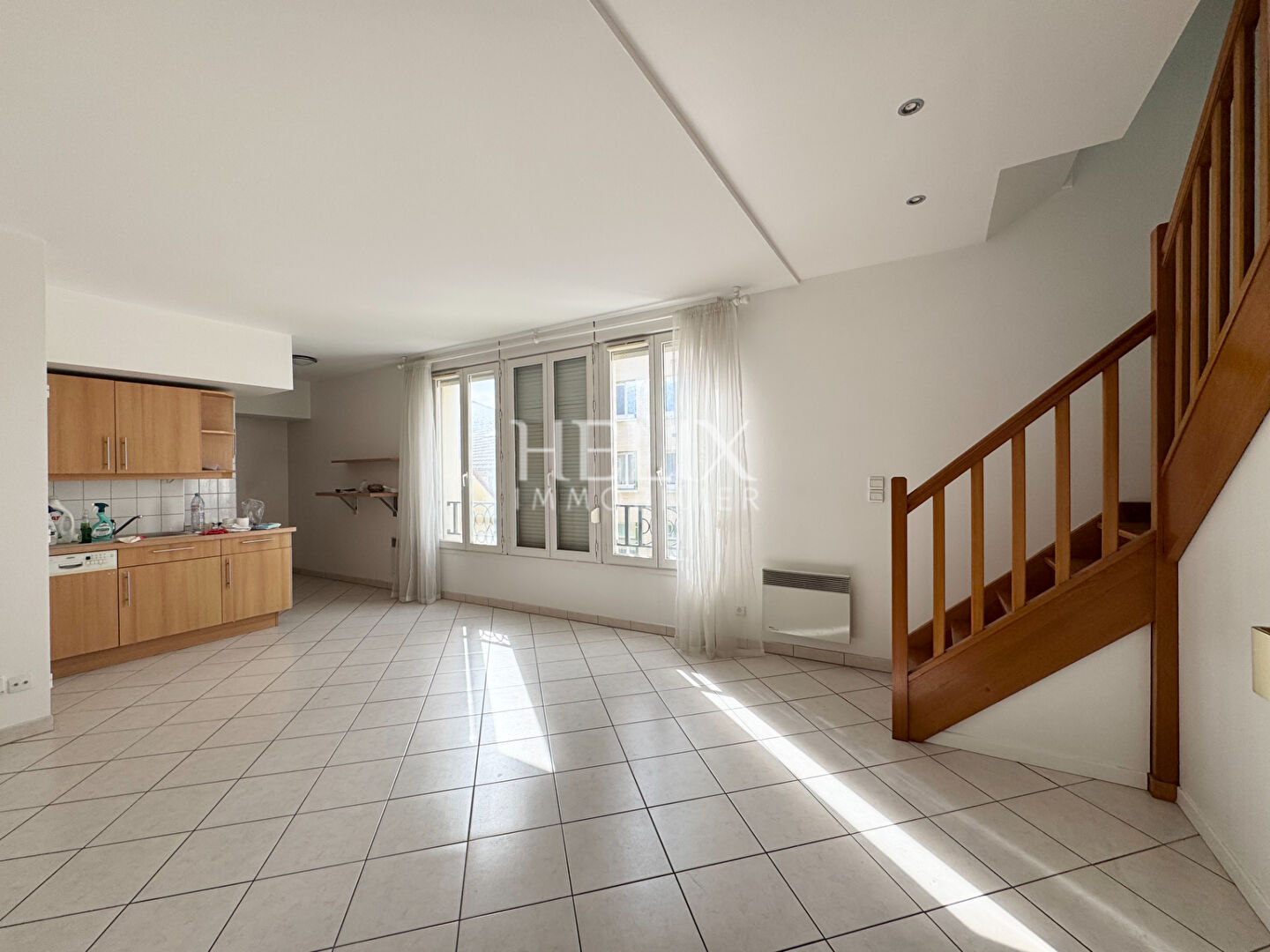 EXCLUSIVITE Centre-ville à 3 mn du RER, totalement au calme sur la cour d'un petit immeuble ancien, Appartement en Duplex / Maison de ville meublée refaite à neuf, vous offrant : séjour avec cuisine ouverte équipée : four, plaque, hotte, lave-vaisselle, lave-linge, frigo, à l'étage : une chambre, une salle de douches/WC. Emplacement très recherché dans le coeur du centre-ville à 2 mn de la Place du marché mais au calme absolu, rénovation de qualité, meubles et équipements neufs. D