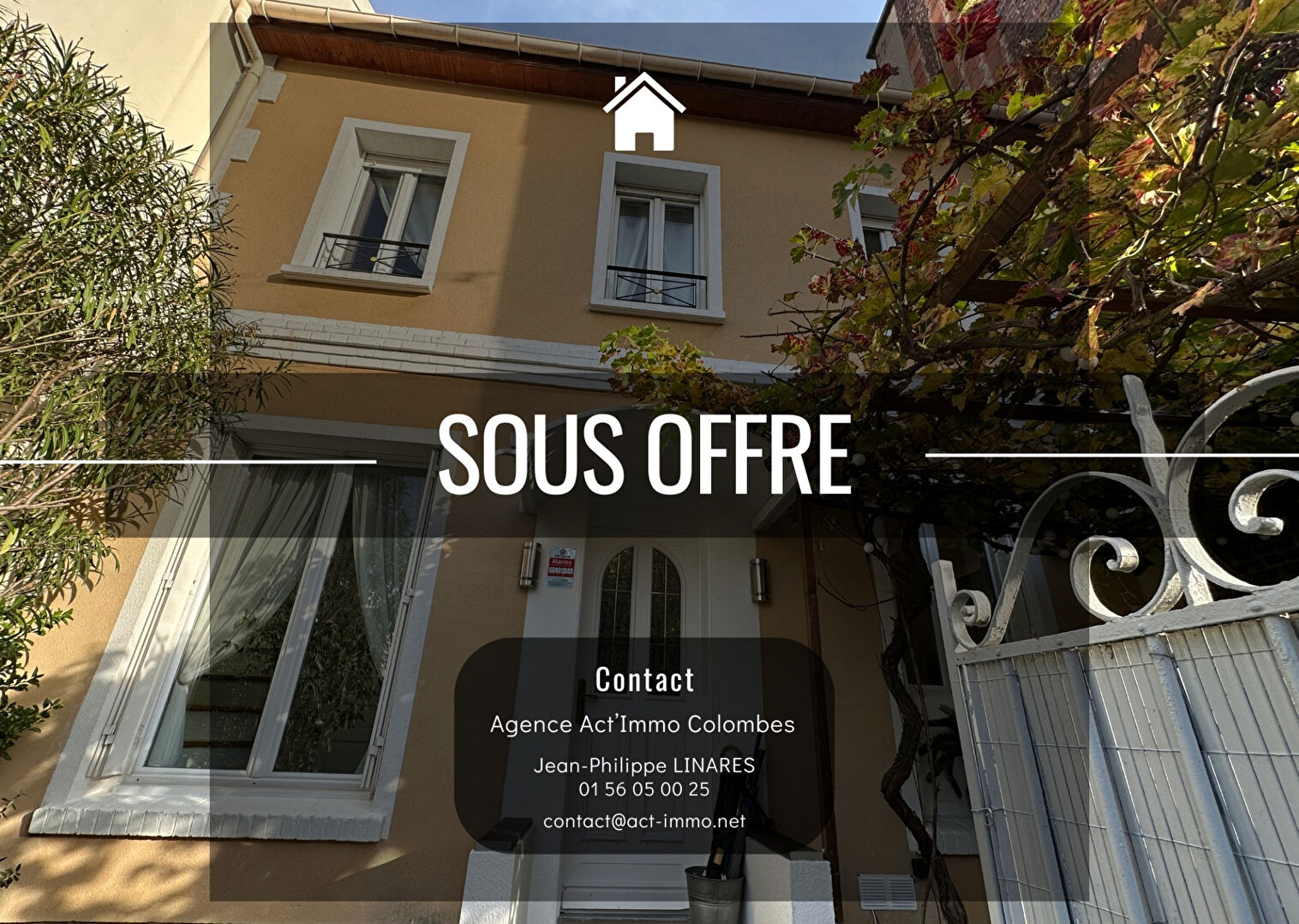 - SOUS OFFRE - L'agence ACT'IMMO vous présente à Colombes en plein coeur du secteur des Vallées, proche des écoles Gustave Bienvêtu (maternelle), Lazare Carnot (Primaire) et Lakanal (collège), de la gare SNCF et des commerces. Dans une petite rue très calme, une charmante maison de 6 pièces offrant, une entrée avec placards, une cuisine aménagée et équipée ouverte sur un double séjour donnant de plein pied sur une terrasse et le jardin, un WC. à l'étage, un palier, 3 belles cham