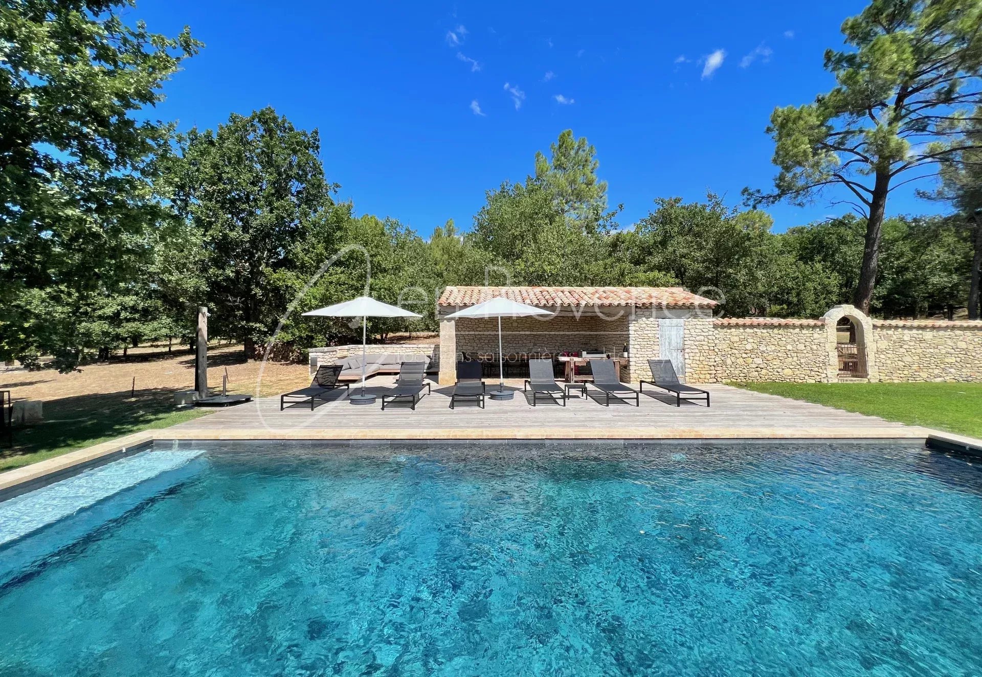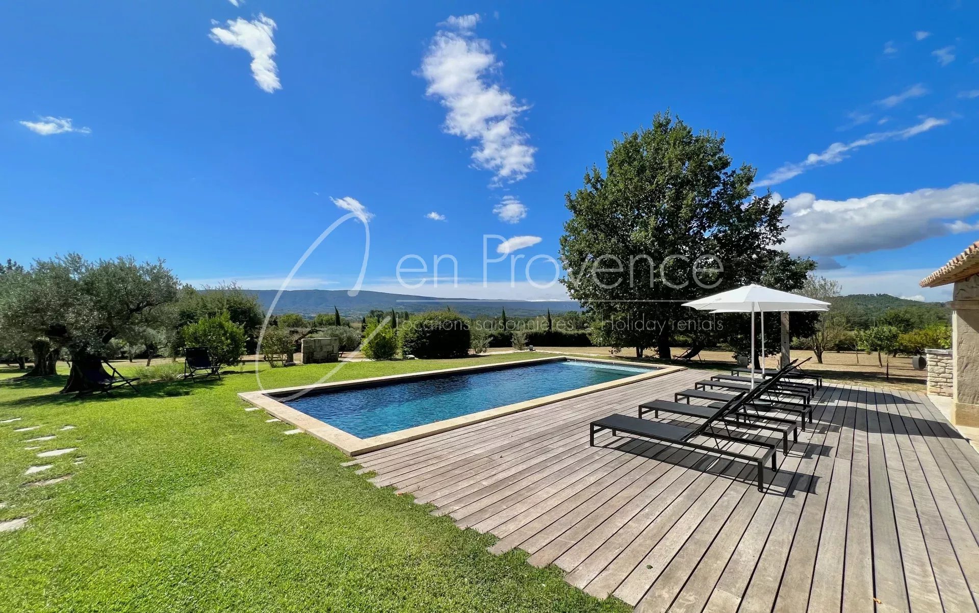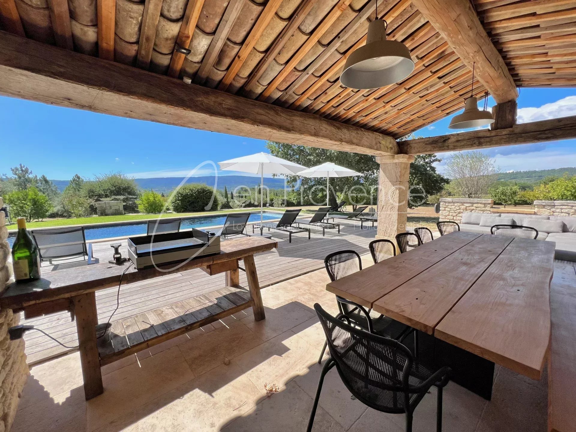 La propriété bénéficie d’un terrain de 2,2 ha non clos, avec un beau jardin provençal avec pelouse, planté d’oliviers, une piscine avec un bel auvent faisant face à la vallée du Luberon. Avec ces 6 chambres et ces 5 salles d’eau, cette propriété est idéale pour les grandes familles ou les groupes d’amis pour une capacité maximale de 12 personnes.