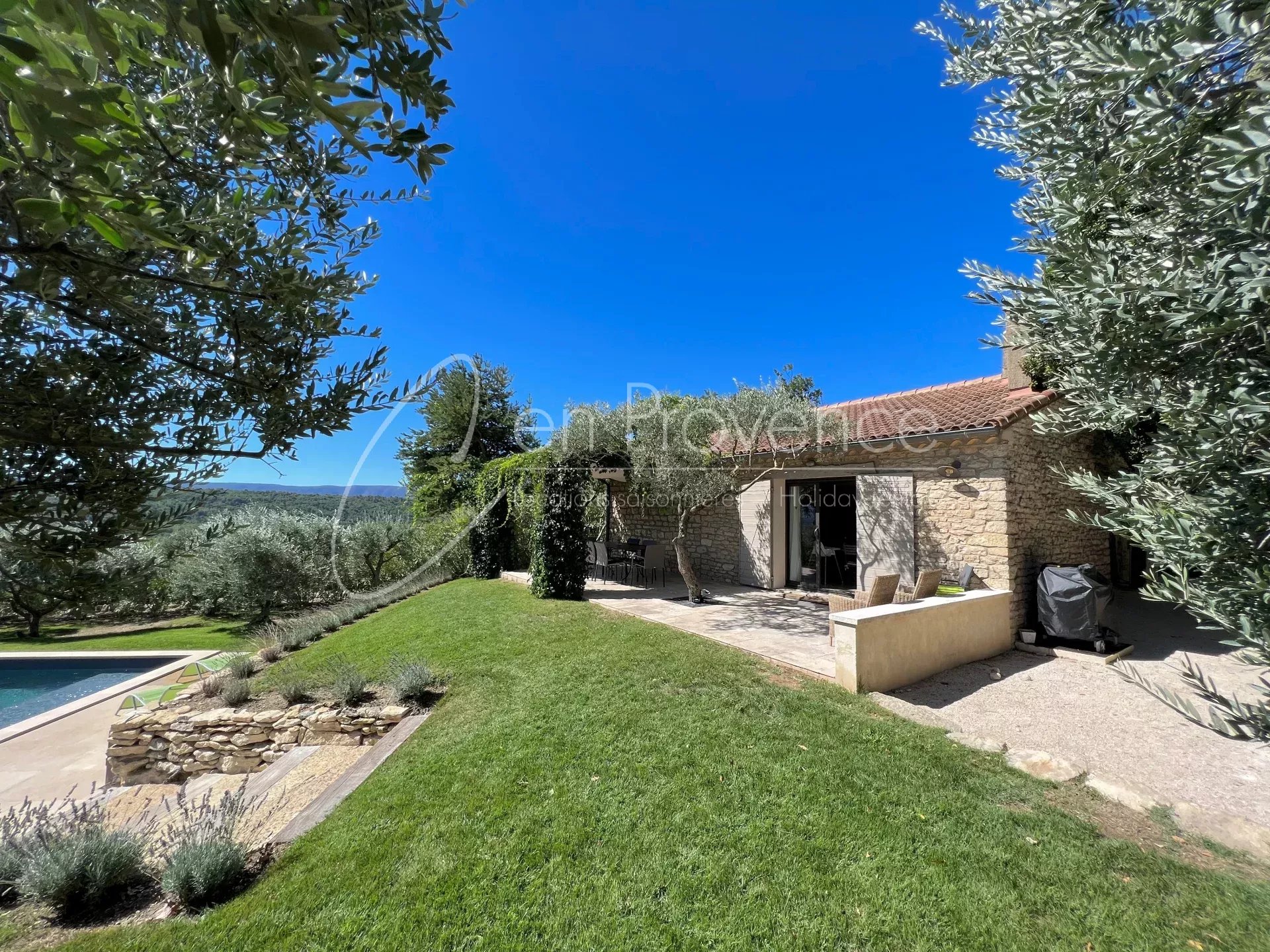 Au coeur du Luberon en Provence, cette confortable villa climatisée en pierre de Gordes offre une vue imprenable sur le Luberon et sa vallée.