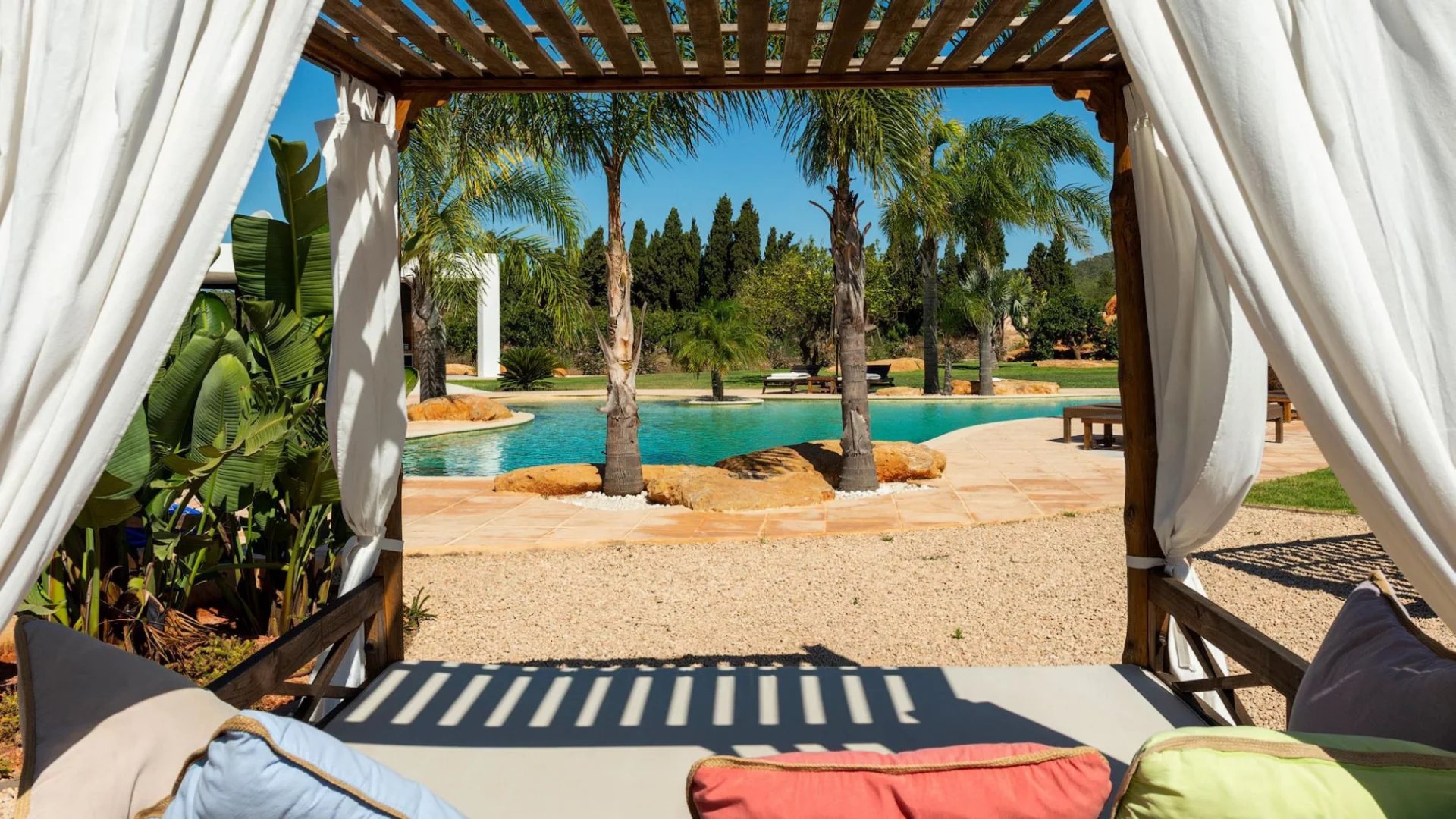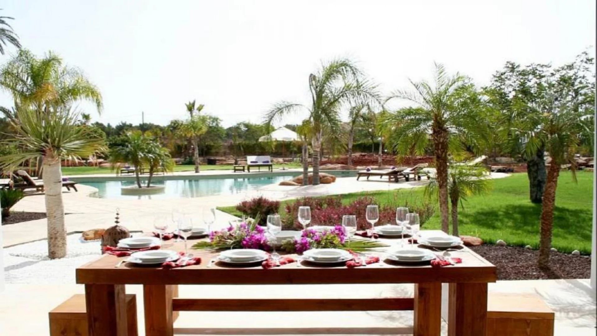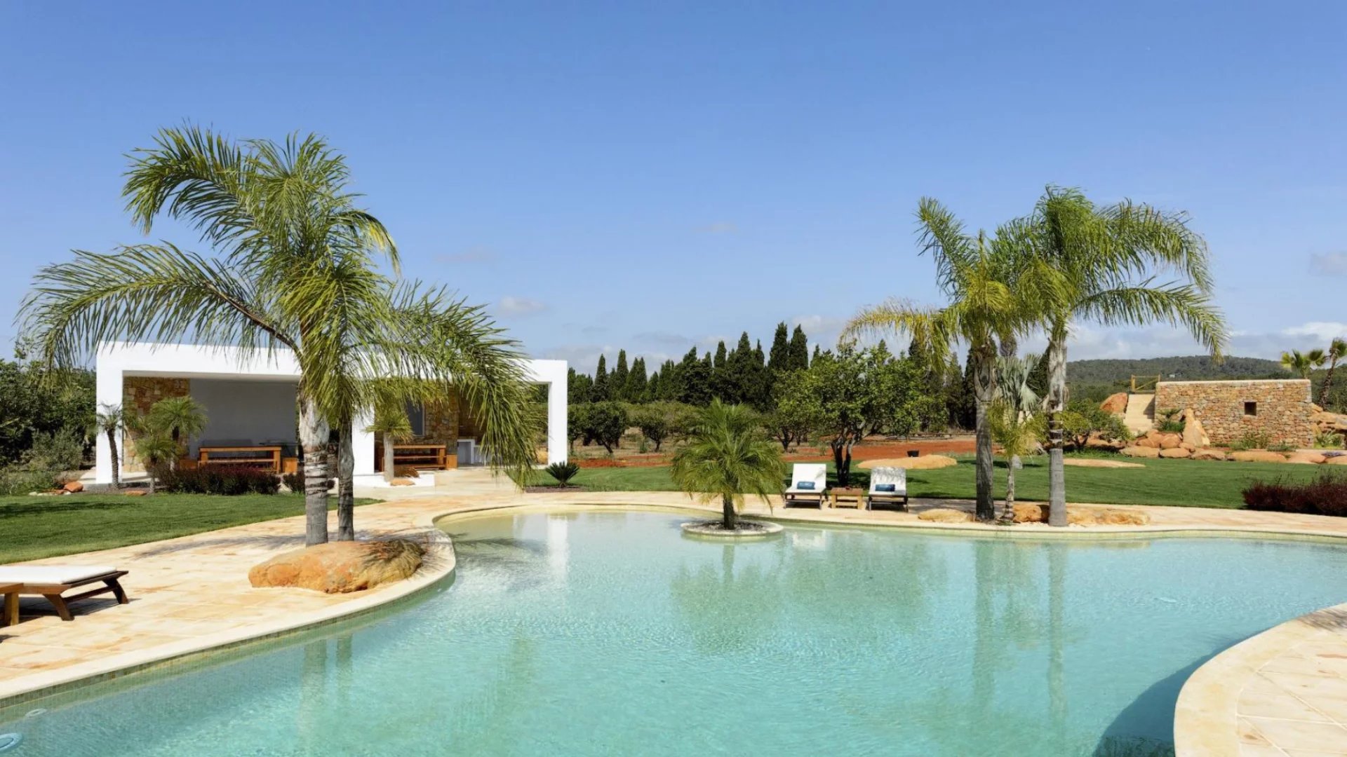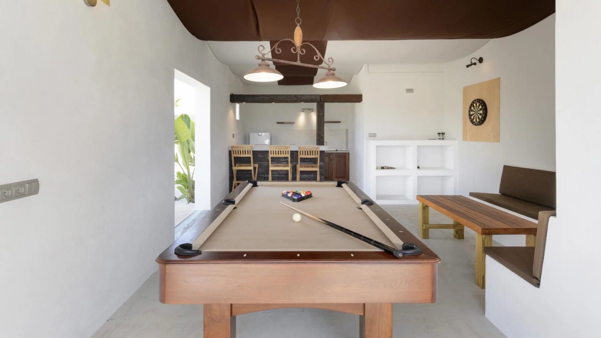 The large swimming pool is accompanied by a bar area with a pool table and a pool house that includes gym equipment, a BBQ, dining area, comfortable sofa space, shower, and WC.