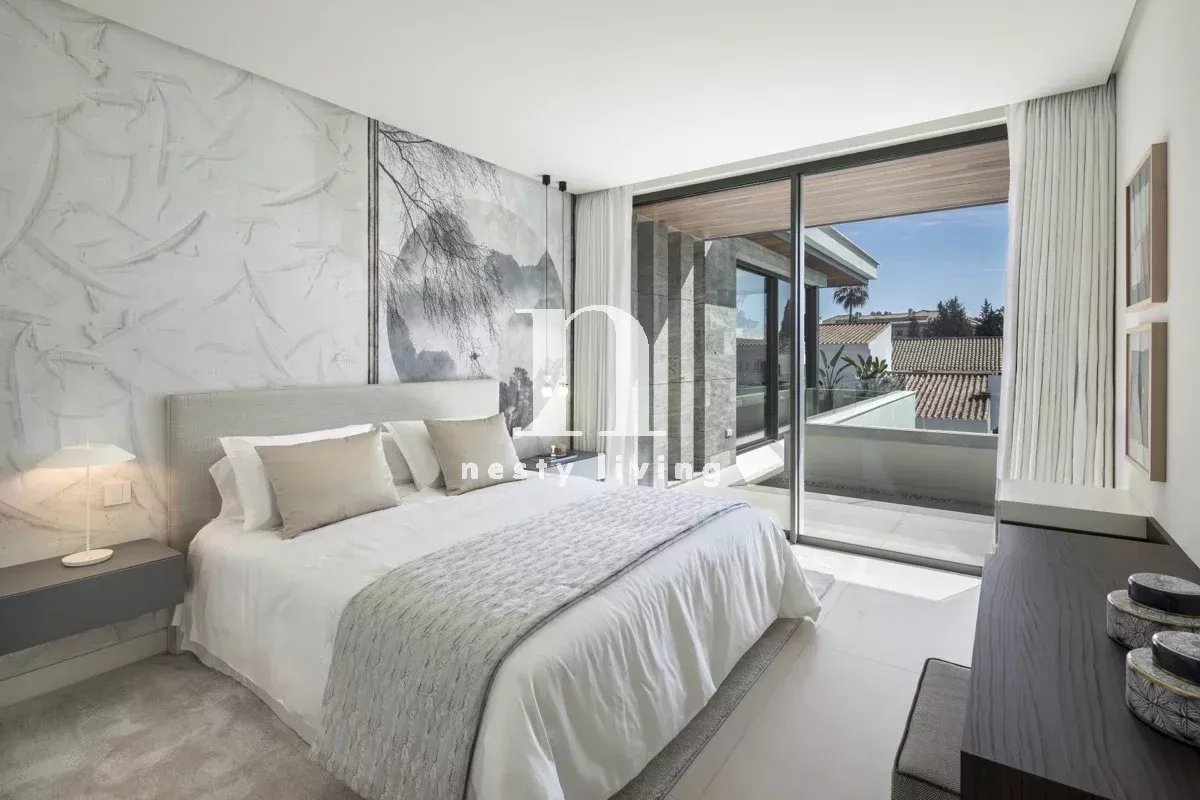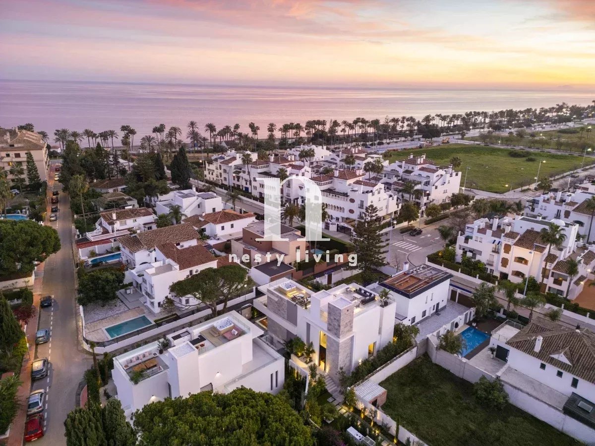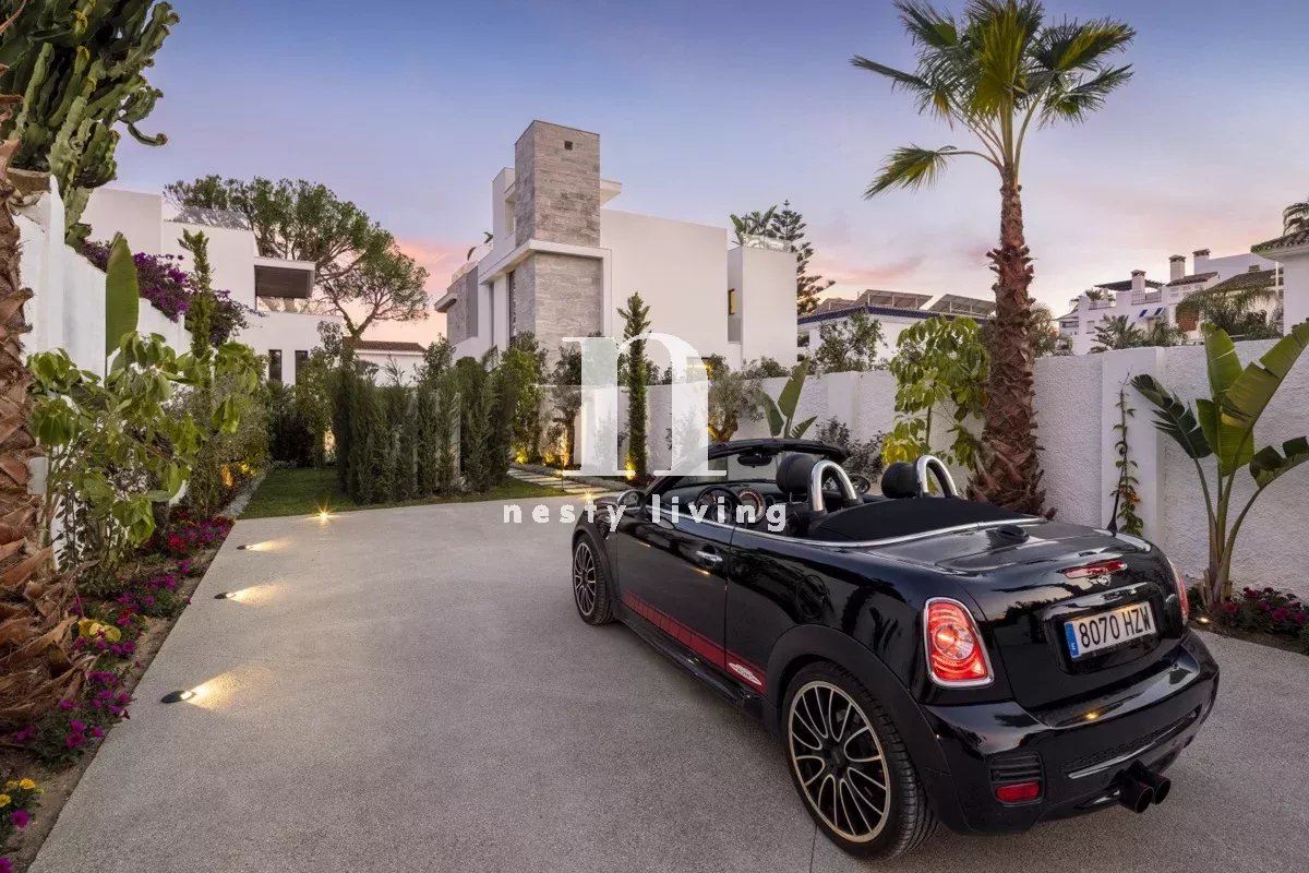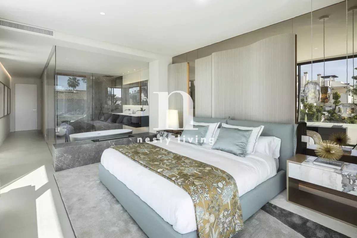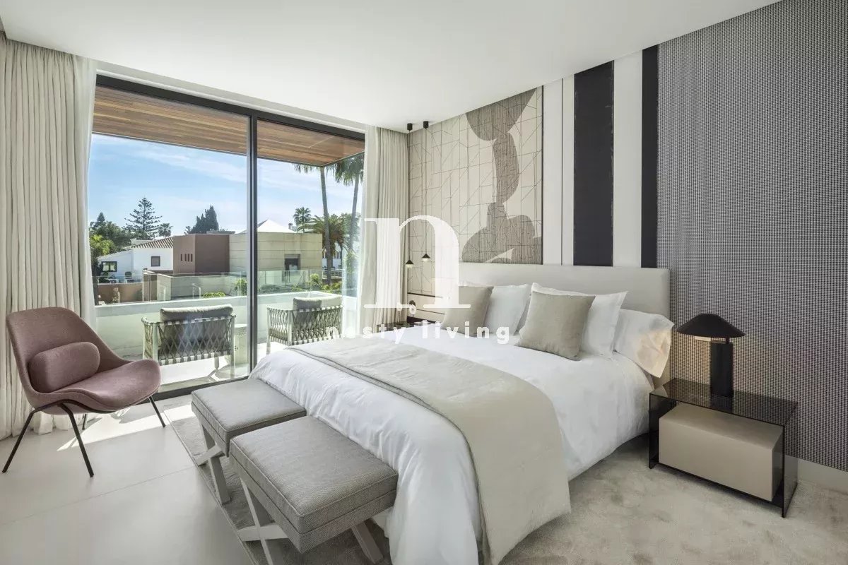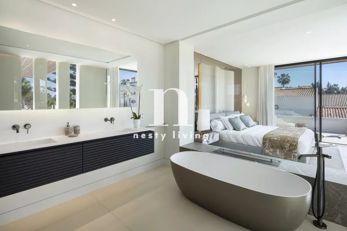 Une villa située près de la plage doit avoir un aspect et une atmosphère un peu différents, ses lignes blanches et fraîches reflétant une situation côtière privilégiée. d'une situation privilégiée sur la côte. Depuis cette banlieue de villas établie sur la Calle Los Angeles, la plage et les commodités voisines sont à quelques pas de votre domaine privé, une villa d'architecture moderne et élégante située au milieu d'une végétation luxuriante. Los Angeles 184 est sophistiquée de par sa conception et présente les plus hauts niveaux de style et d'ameublement intérieur de Marbella. par le plus prestigieux architecte d'intérieur de Marbella, Pedro Peña. Cela se voit dès que vous entrez dans cette maison magnifiquement détaillée, où un spacieux espace de vie ouvert s'étend de la cuisine et des salons à la terrasse et à la piscine d'eau salée, formant ainsi un grand espace de vie. Les normes de qualité de la villa se reflètent dans les matériaux nobles tels que le bois, la pierre et le marbre, dans le mobilier sur mesure et dans des détails tels que l'élégant bar sur mesure qui constitue l'un des points forts de l'espace de divertissement de l'étage inférieur de la villa. Ce dernier, avec son gymnase, son salon et ses salles supplémentaires, est en fait l'un des deux espaces dédiés à la relaxation raffinée. La terrasse sur le toit est un élément de style de vie qui distingue la villa et donne le ton aux journées et aux soirées passées dans son jacuzzi, sa salle de bain et sa cuisine. La terrasse sur le toit est un élément de style de vie qui distingue la villa, donnant le ton aux journées et aux soirées passées dans son jacuzzi, son salon et sa salle à manger desservie par un bar et une cuisine extérieure professionnelle, le tout dans un décor à couper le souffle, celui de la mer toute proche.