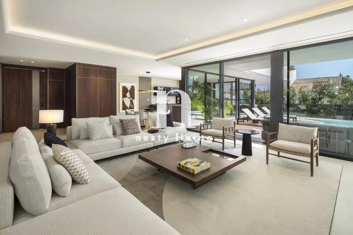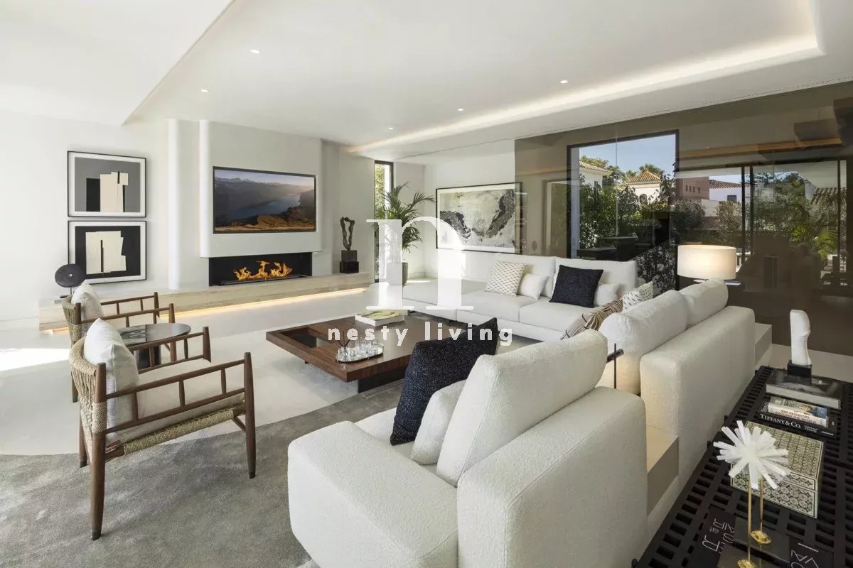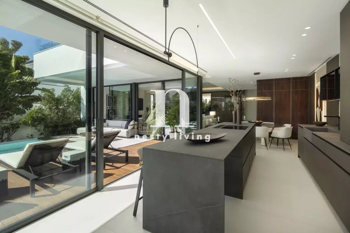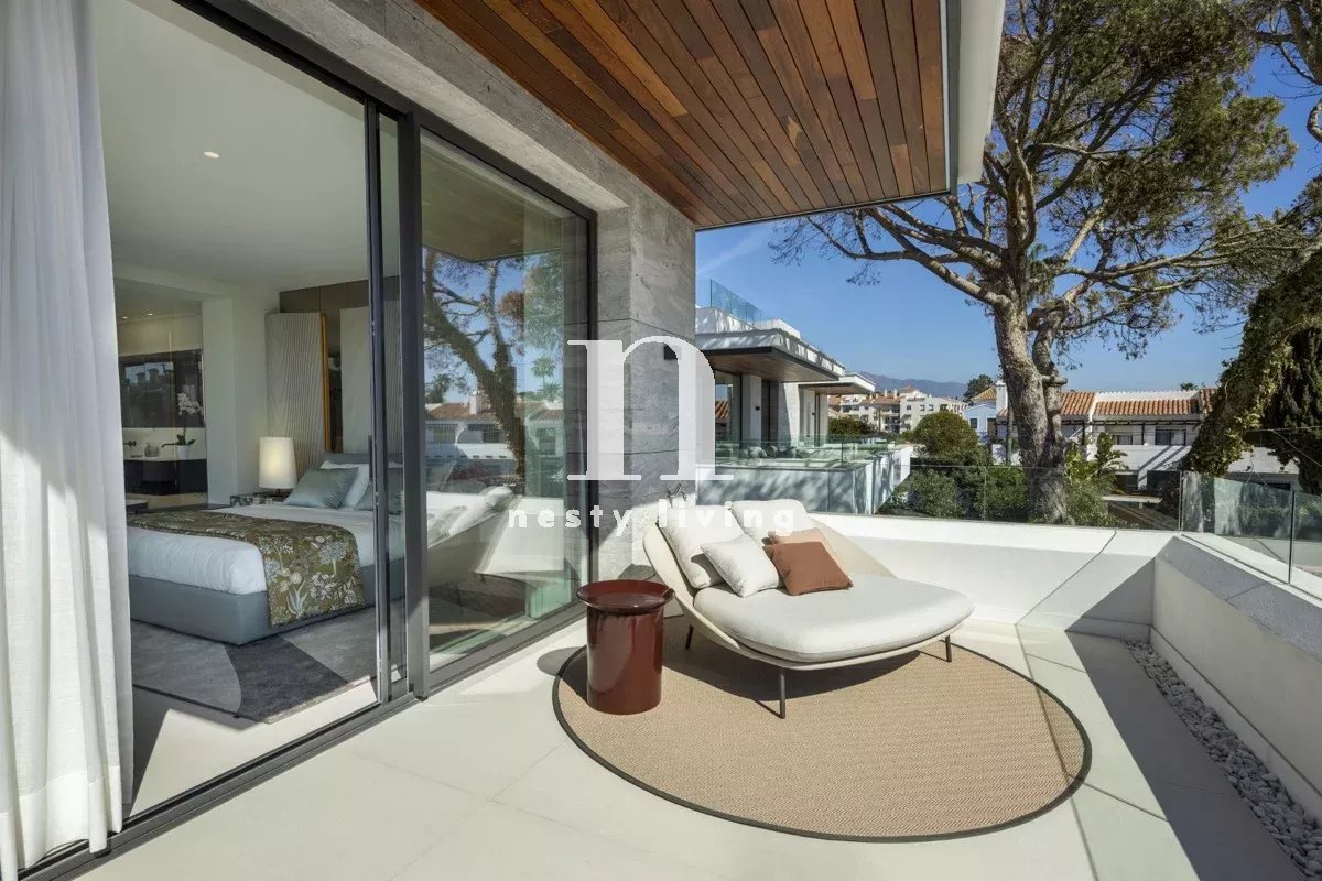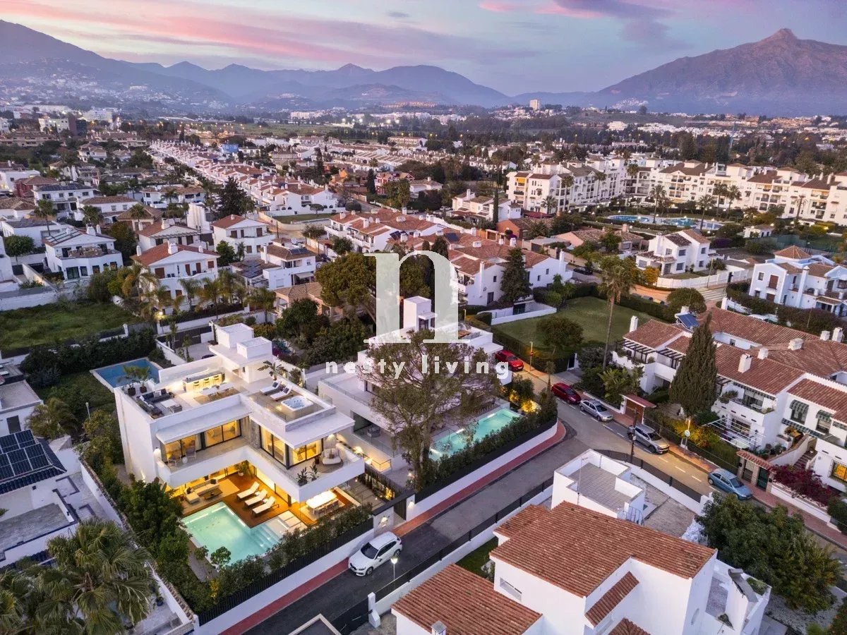 Une villa située près de la plage doit avoir un aspect et une atmosphère un peu différents, ses lignes blanches et fraîches reflétant une situation côtière privilégiée. d'une situation privilégiée sur la côte. Depuis cette banlieue de villas établie sur la Calle Los Angeles, la plage et les commodités voisines sont à quelques pas de votre domaine privé, une villa d'architecture moderne et élégante située au milieu d'une végétation luxuriante. Los Angeles 184 est sophistiquée de par sa conception et présente les plus hauts niveaux de style et d'ameublement intérieur de Marbella. par le plus prestigieux architecte d'intérieur de Marbella, Pedro Peña. Cela se voit dès que vous entrez dans cette maison magnifiquement détaillée, où un spacieux espace de vie ouvert s'étend de la cuisine et des salons à la terrasse et à la piscine d'eau salée, formant ainsi un grand espace de vie. Les normes de qualité de la villa se reflètent dans les matériaux nobles tels que le bois, la pierre et le marbre, dans le mobilier sur mesure et dans des détails tels que l'élégant bar sur mesure qui constitue l'un des points forts de l'espace de divertissement de l'étage inférieur de la villa. Ce dernier, avec son gymnase, son salon et ses salles supplémentaires, est en fait l'un des deux espaces dédiés à la relaxation raffinée. La terrasse sur le toit est un élément de style de vie qui distingue la villa et donne le ton aux journées et aux soirées passées dans son jacuzzi, sa salle de bain et sa cuisine. La terrasse sur le toit est un élément de style de vie qui distingue la villa, donnant le ton aux journées et aux soirées passées dans son jacuzzi, son salon et sa salle à manger desservie par un bar et une cuisine extérieure professionnelle, le tout dans un décor à couper le souffle, celui de la mer toute proche.