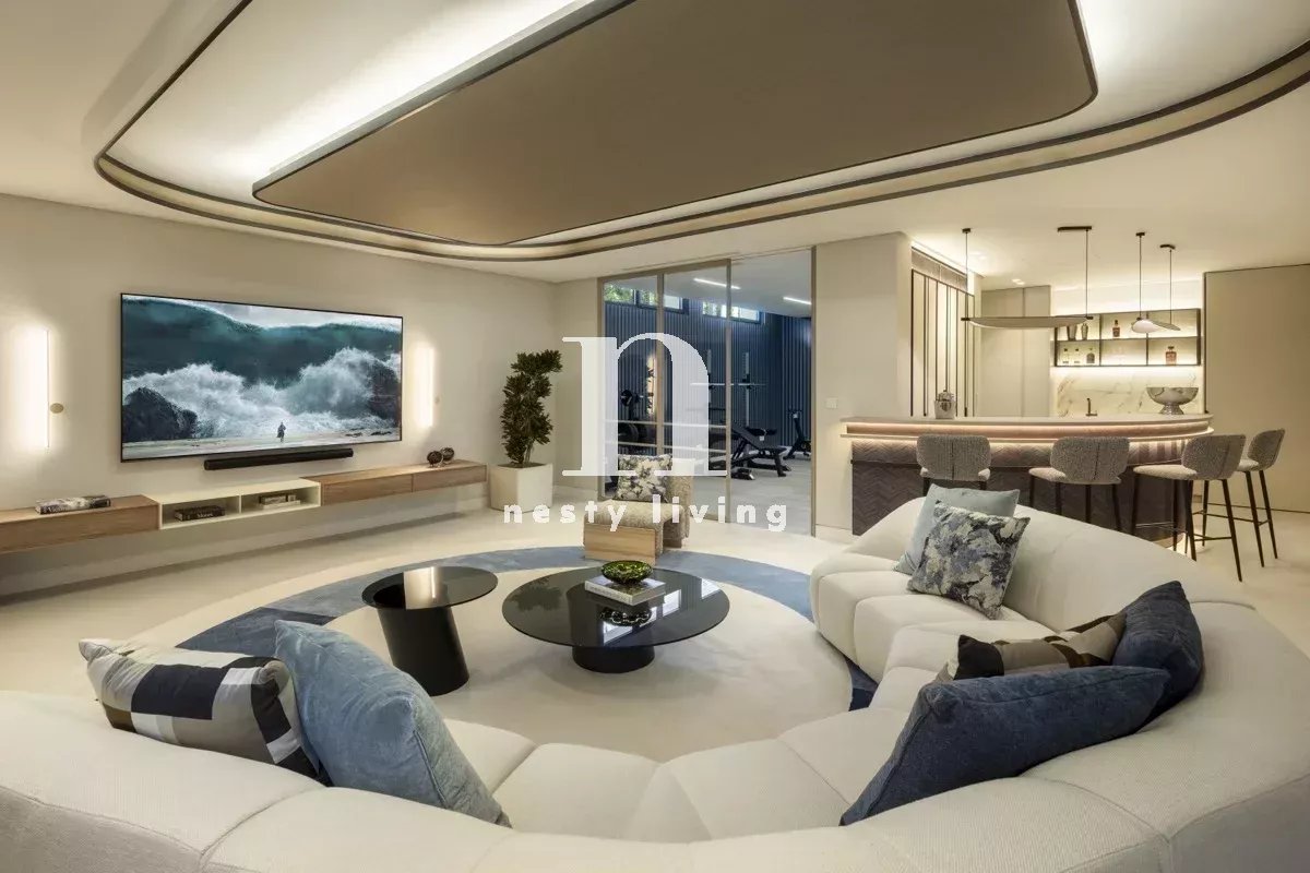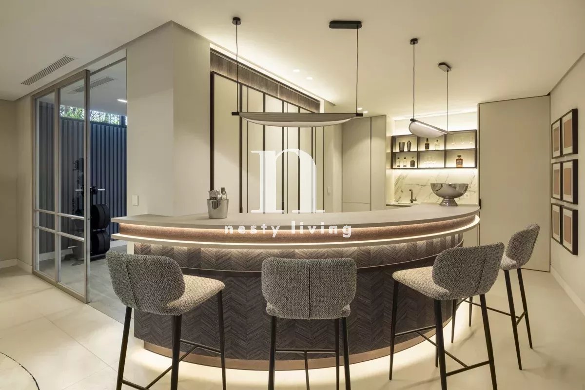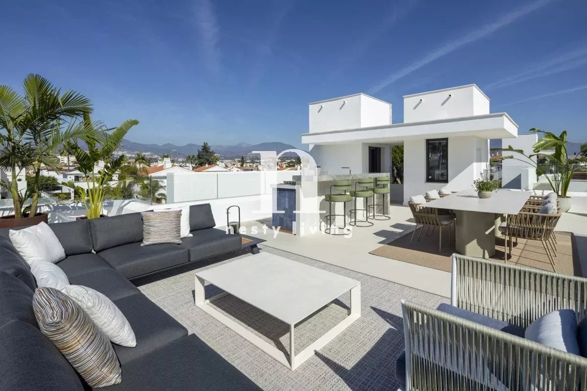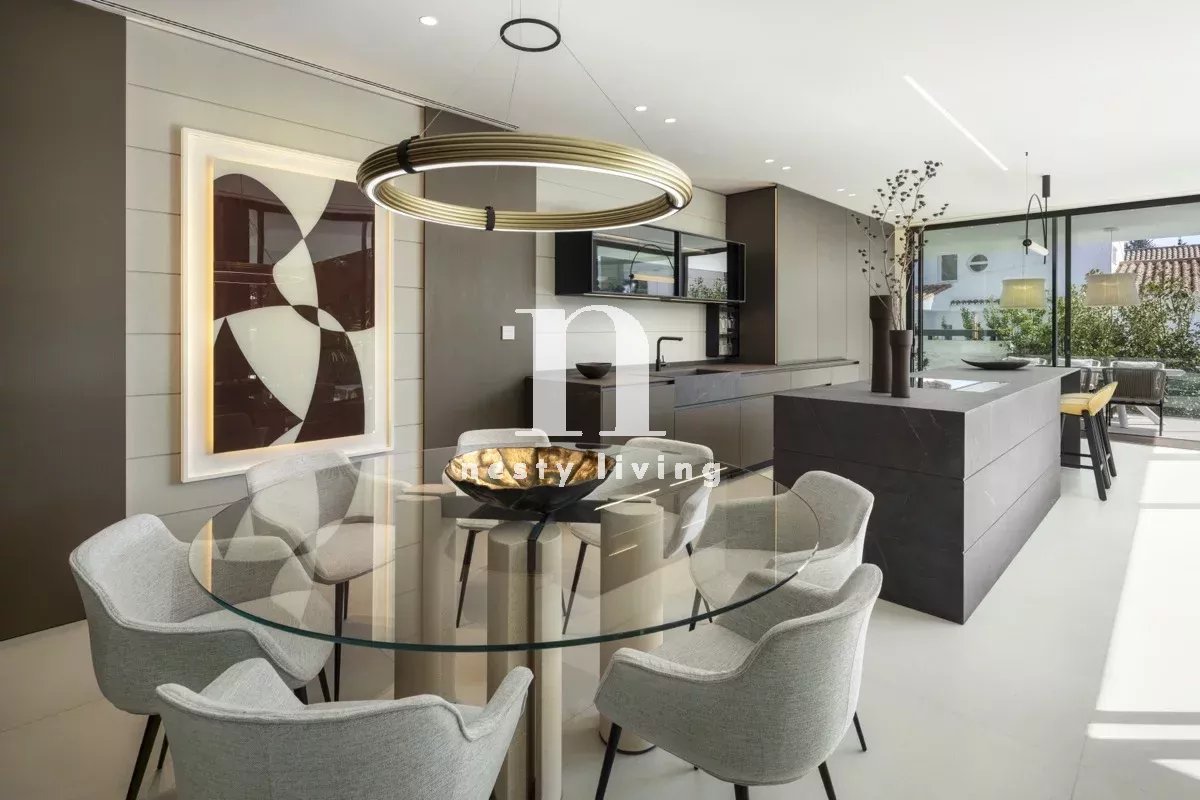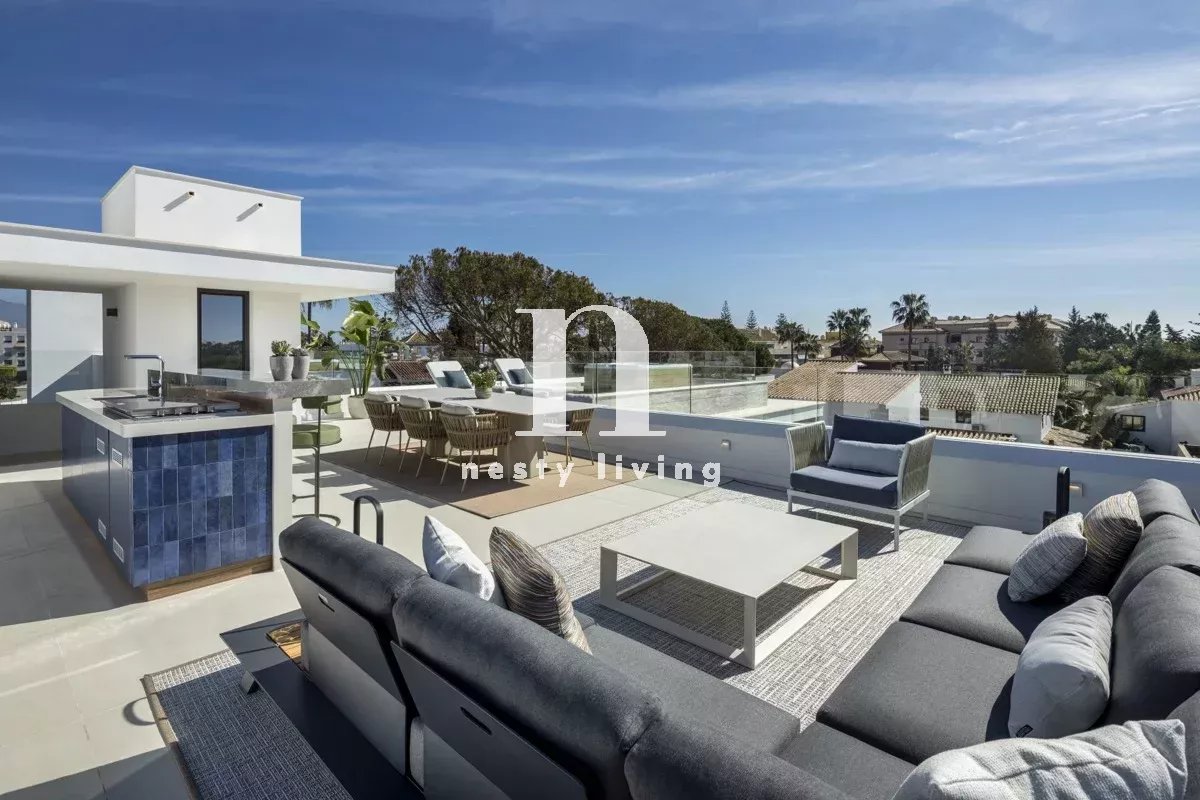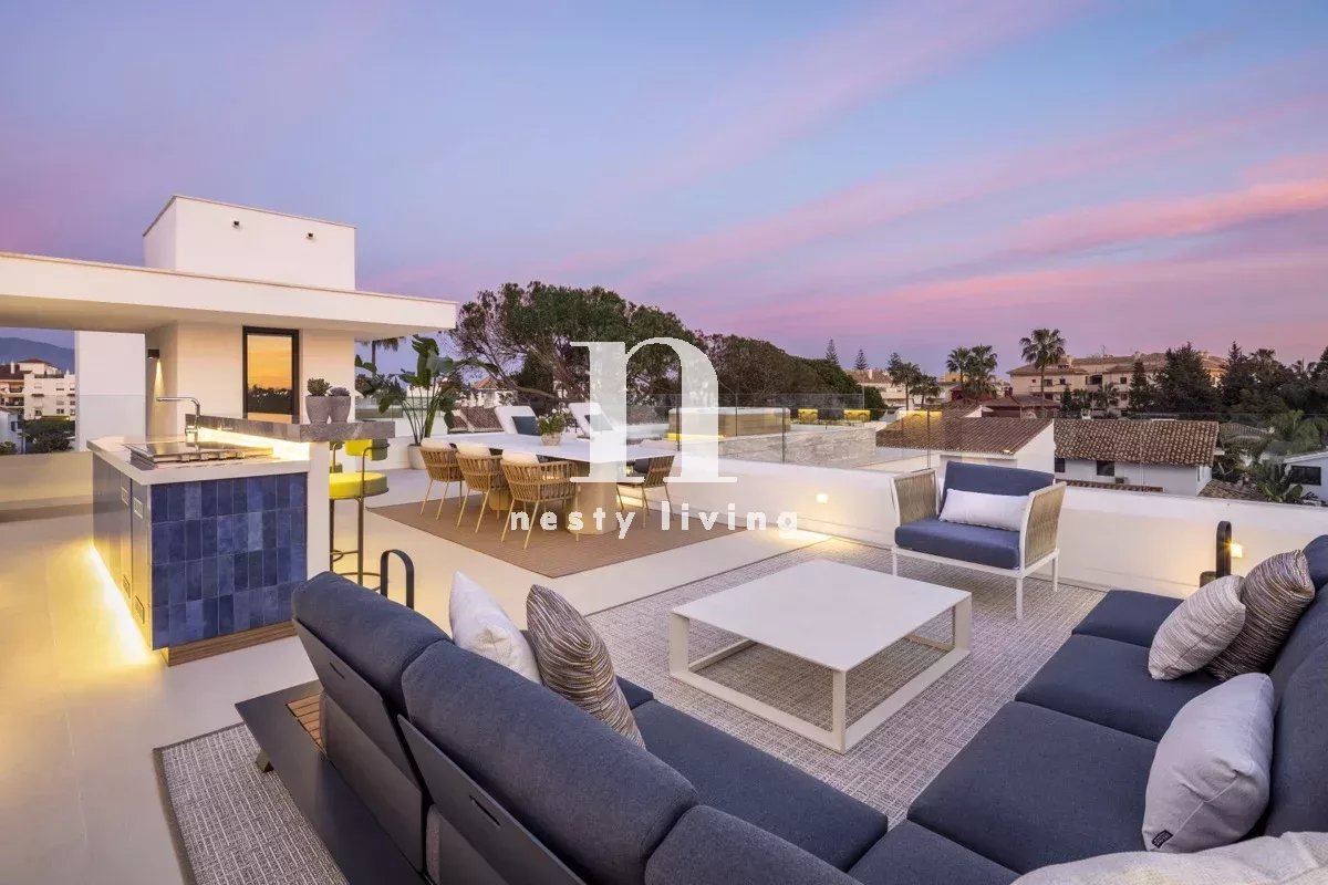 Une villa située près de la plage doit avoir un aspect et une atmosphère un peu différents, ses lignes blanches et fraîches reflétant une situation côtière privilégiée. d'une situation privilégiée sur la côte. Depuis cette banlieue de villas établie sur la Calle Los Angeles, la plage et les commodités voisines sont à quelques pas de votre domaine privé, une villa d'architecture moderne et élégante située au milieu d'une végétation luxuriante. Los Angeles 184 est sophistiquée de par sa conception et présente les plus hauts niveaux de style et d'ameublement intérieur de Marbella. par le plus prestigieux architecte d'intérieur de Marbella, Pedro Peña. Cela se voit dès que vous entrez dans cette maison magnifiquement détaillée, où un spacieux espace de vie ouvert s'étend de la cuisine et des salons à la terrasse et à la piscine d'eau salée, formant ainsi un grand espace de vie. Les normes de qualité de la villa se reflètent dans les matériaux nobles tels que le bois, la pierre et le marbre, dans le mobilier sur mesure et dans des détails tels que l'élégant bar sur mesure qui constitue l'un des points forts de l'espace de divertissement de l'étage inférieur de la villa. Ce dernier, avec son gymnase, son salon et ses salles supplémentaires, est en fait l'un des deux espaces dédiés à la relaxation raffinée. La terrasse sur le toit est un élément de style de vie qui distingue la villa et donne le ton aux journées et aux soirées passées dans son jacuzzi, sa salle de bain et sa cuisine. La terrasse sur le toit est un élément de style de vie qui distingue la villa, donnant le ton aux journées et aux soirées passées dans son jacuzzi, son salon et sa salle à manger desservie par un bar et une cuisine extérieure professionnelle, le tout dans un décor à couper le souffle, celui de la mer toute proche.