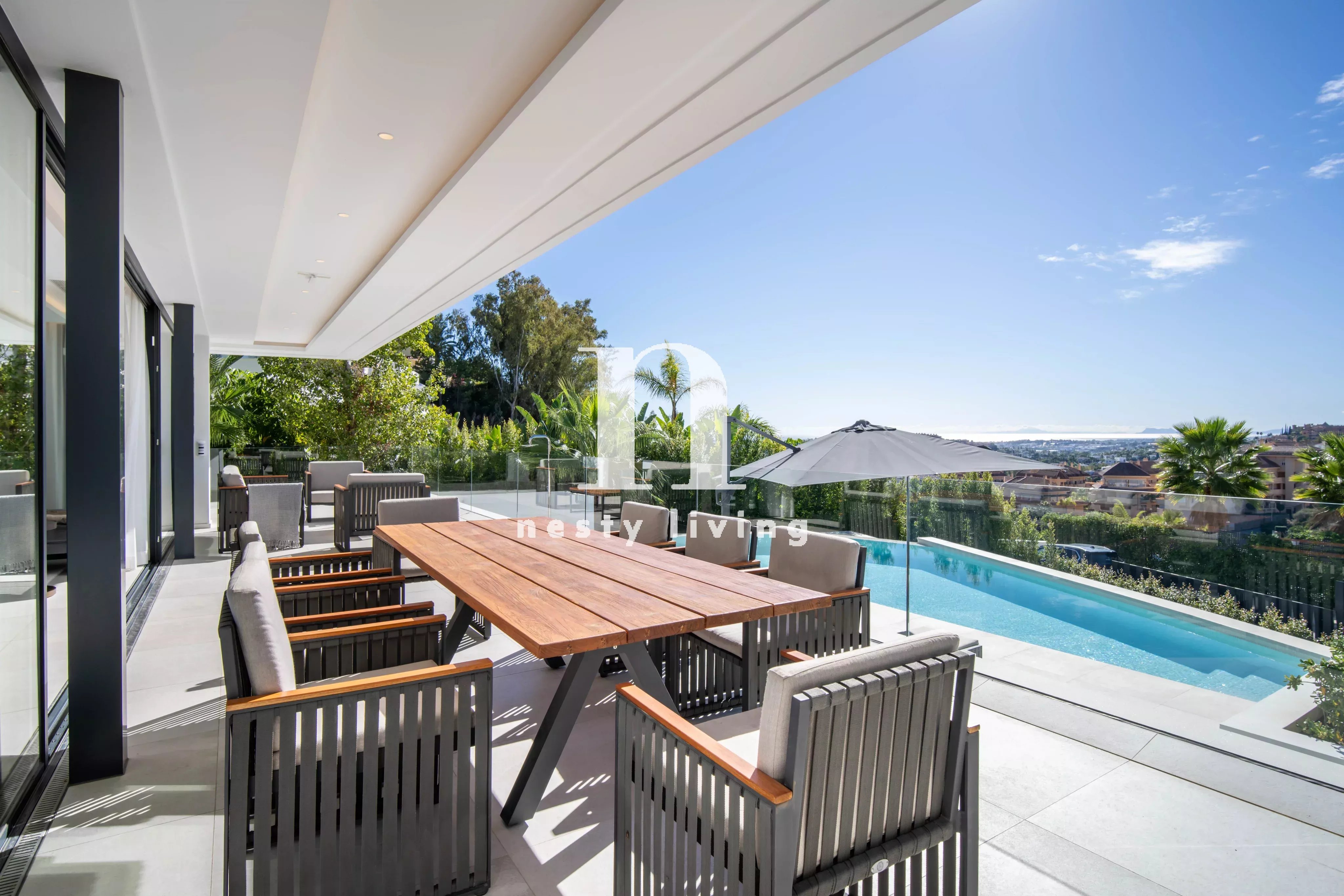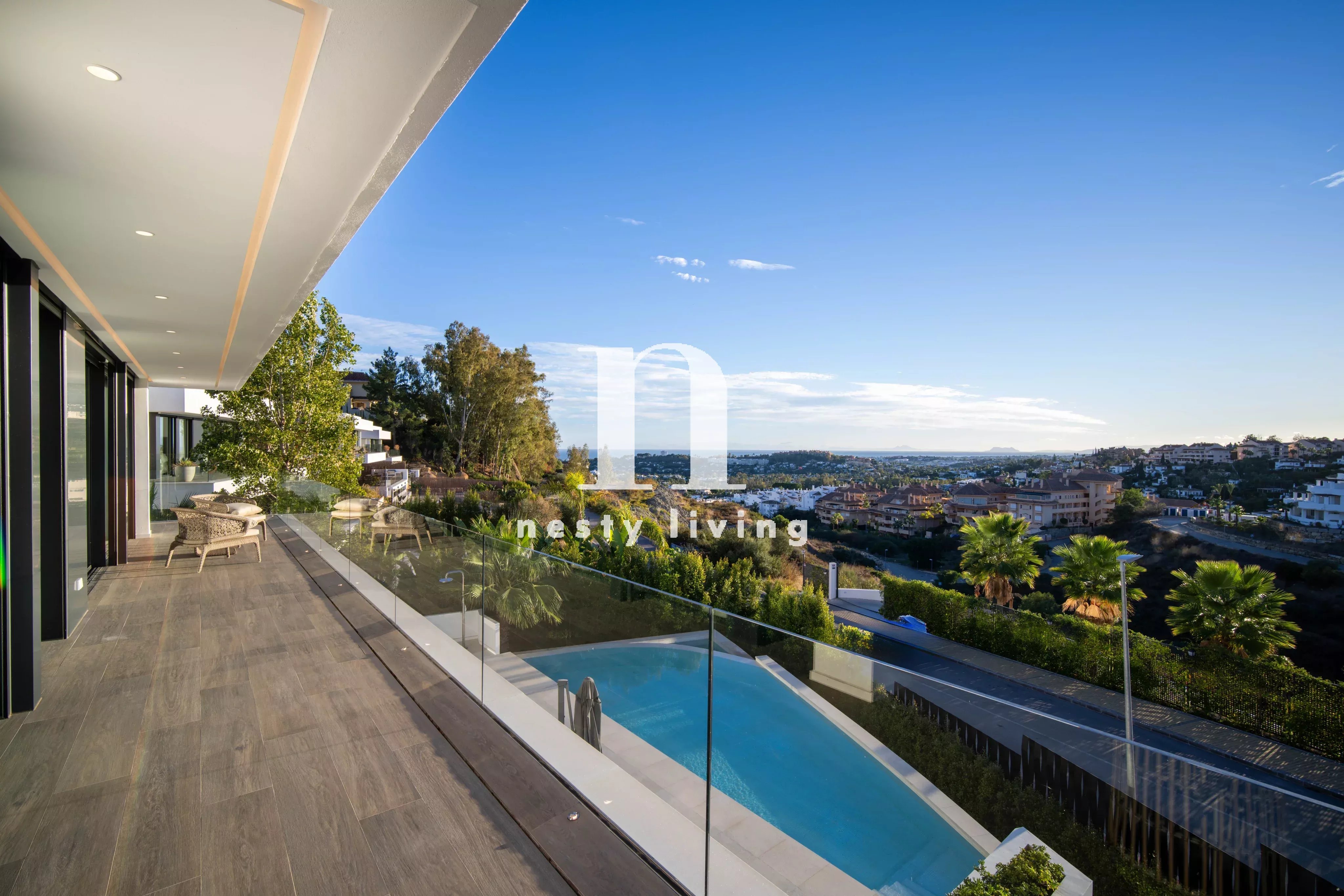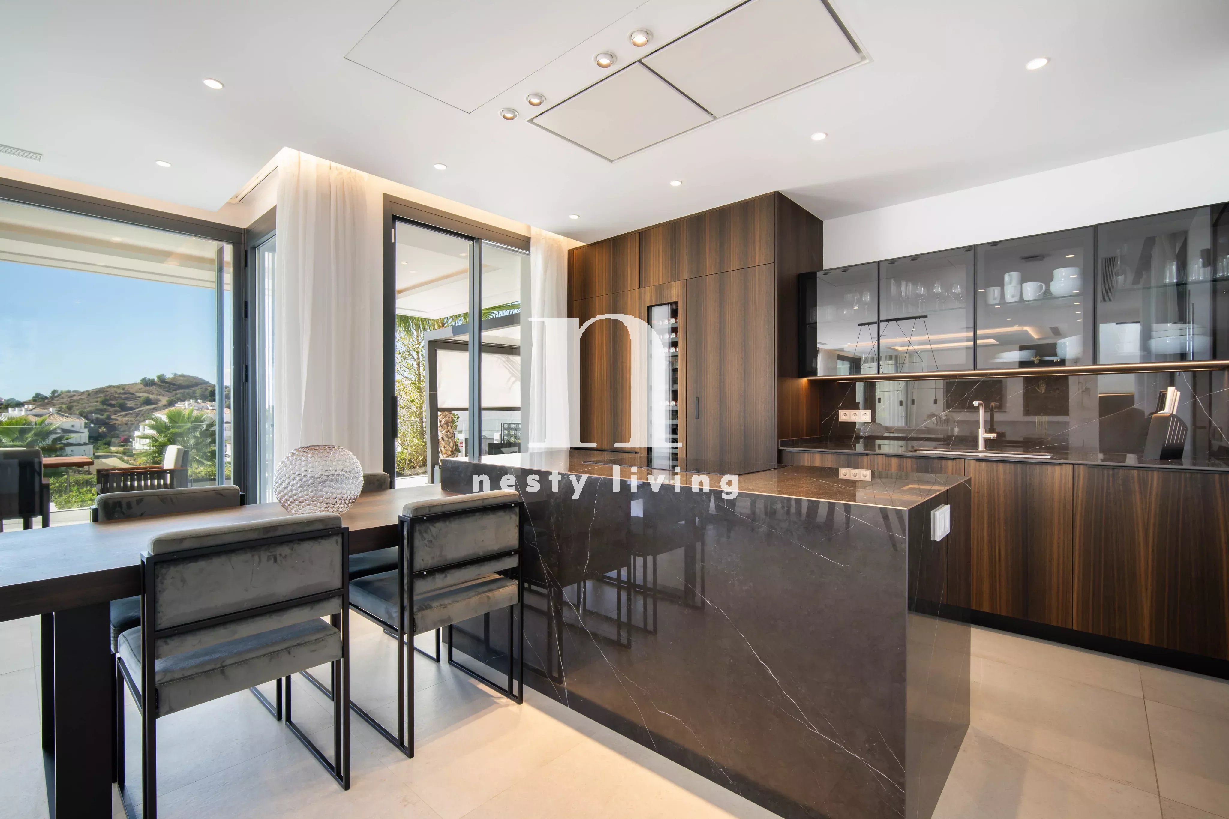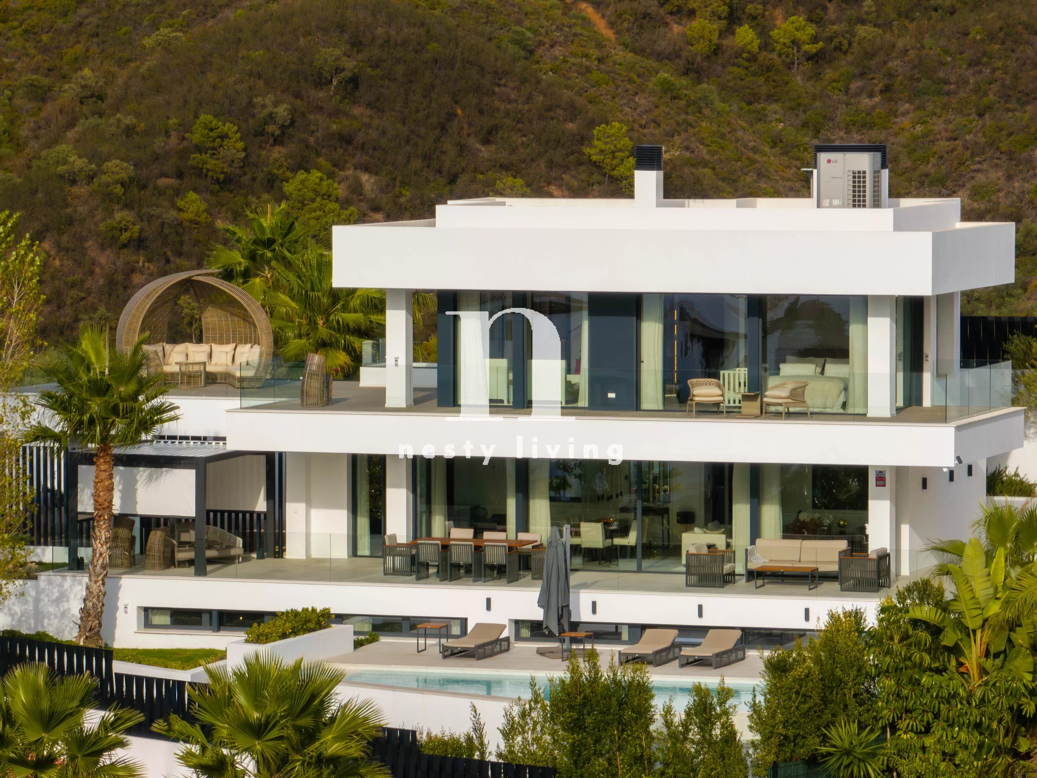 La Villa Alfma est une magnifique villa moderne située à Nueva Andalucía. Elle se distingue par son architecture ultramoderne, avec des murs blancs et de grandes fenêtres. Grâce à son orientation sud-ouest, elle reçoit un ensoleillement optimal, offrant ainsi une vue panoramique sur les environs et la mer Méditerranée. Le rez-de-chaussée est entouré d'une grande terrasse où l'on peut manger en plein air, se détendre et prendre un bain de soleil. Une piscine à débordement d'une taille presque équivalente à la propriété ajoute une touche d'élégance à l'extérieur. Les espaces intérieurs sont harmonieusement reliés aux espaces extérieurs, permettant ainsi de profiter pleinement de la vie intérieure et extérieure. De plus, la villa dispose d'un abri de voiture couvert à l'entrée. Avec son emplacement idéal, son architecture moderne et ses équipements de grande qualité, la Villa Alfma est un lieu parfait pour profiter du climat agréable de Marbella. Les intérieurs sont tout aussi impressionnants que l'extérieur, présentant un design intérieur impressionnant, aussi esthétique que fonctionnel. L'espace de vie est ouvert et le salon confortable offre des vues directes sur l'extérieur. Le mobilier et les installations témoignent de l'attention portée aux détails. La salle à manger, adjacente, offre également des vues incroyables sur la terrasse et l'extérieur. La cuisine sur mesure est élégamment conçue avec des menuiseries en bois et un merveilleux îlot de cuisine en marbre, ainsi que des appareils de cuisine Gaggenau dernier cri. L'îlot de cuisine est relié à une petite table à manger pour une plus grande polyvalence. La terrasse du niveau supérieur entoure les chambres et dispose d'un charmant espace de détente idéal pour admirer le coucher du soleil ou se relaxer. S'étendant sur 3 niveaux, le niveau supérieur est réservé aux chambres à coucher et à l'illustre chambre principale. Toutes les chambres ont été conçues pour maximiser le confort tout en restant élégantes. La chambre principale bénéficie d'une vue imprenable et d'une terrasse. La salle de bains principale est un atout supplémentaire pour l'espace, avec une superbe baignoire indépendante et des accents de marbre partout. La Villa Alfma dispose de tout ce dont vous aurez besoin, le niveau inférieur de la propriété étant réservé aux incroyables équipements qui comprennent une étonnante salle de divertissement avec une table de billard sur mesure, une cave à vin, une salle de cinéma et un bar personnalisé. Il y a également une salle de sport et un sauna. Une salle de télévision est également située à ce niveau pour plus de divertissement. Le chauffage par le sol est présent dans toute la propriété, pour plus de confort et de luxe. La Villa Alfma a tout pour plaire : des équipements incroyables, d'étonnantes terrasses extérieures, une décoration intérieure impeccable, des vues panoramiques imprenables et un emplacement de choix à Nueva Andalucia. La Villa Alfma est vraiment la meilleure offre immobilière de sa catégorie à Marbella.