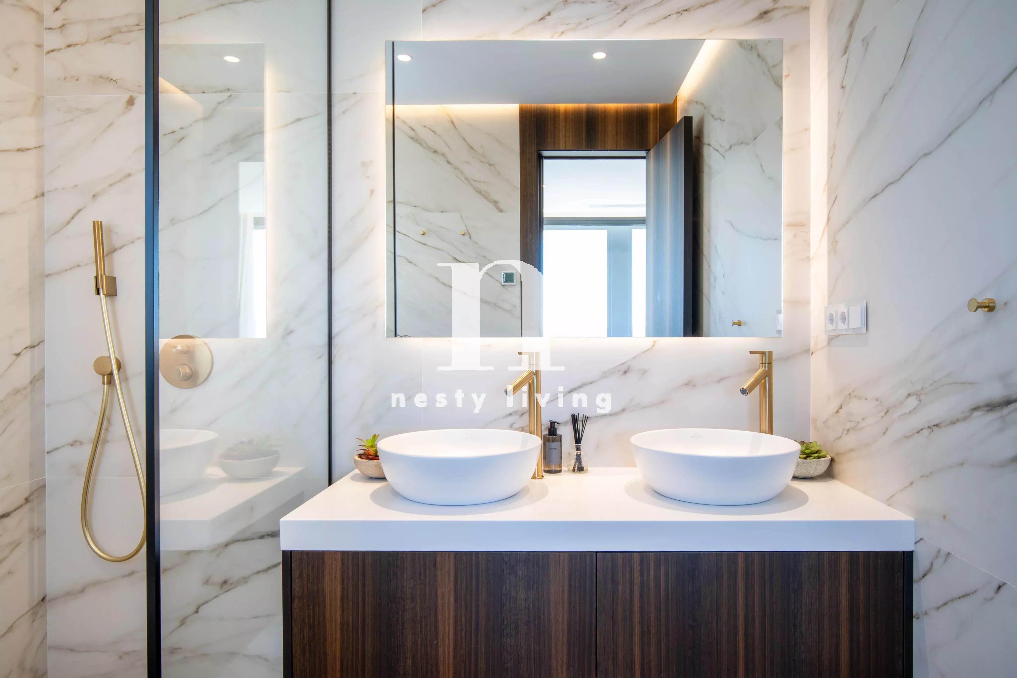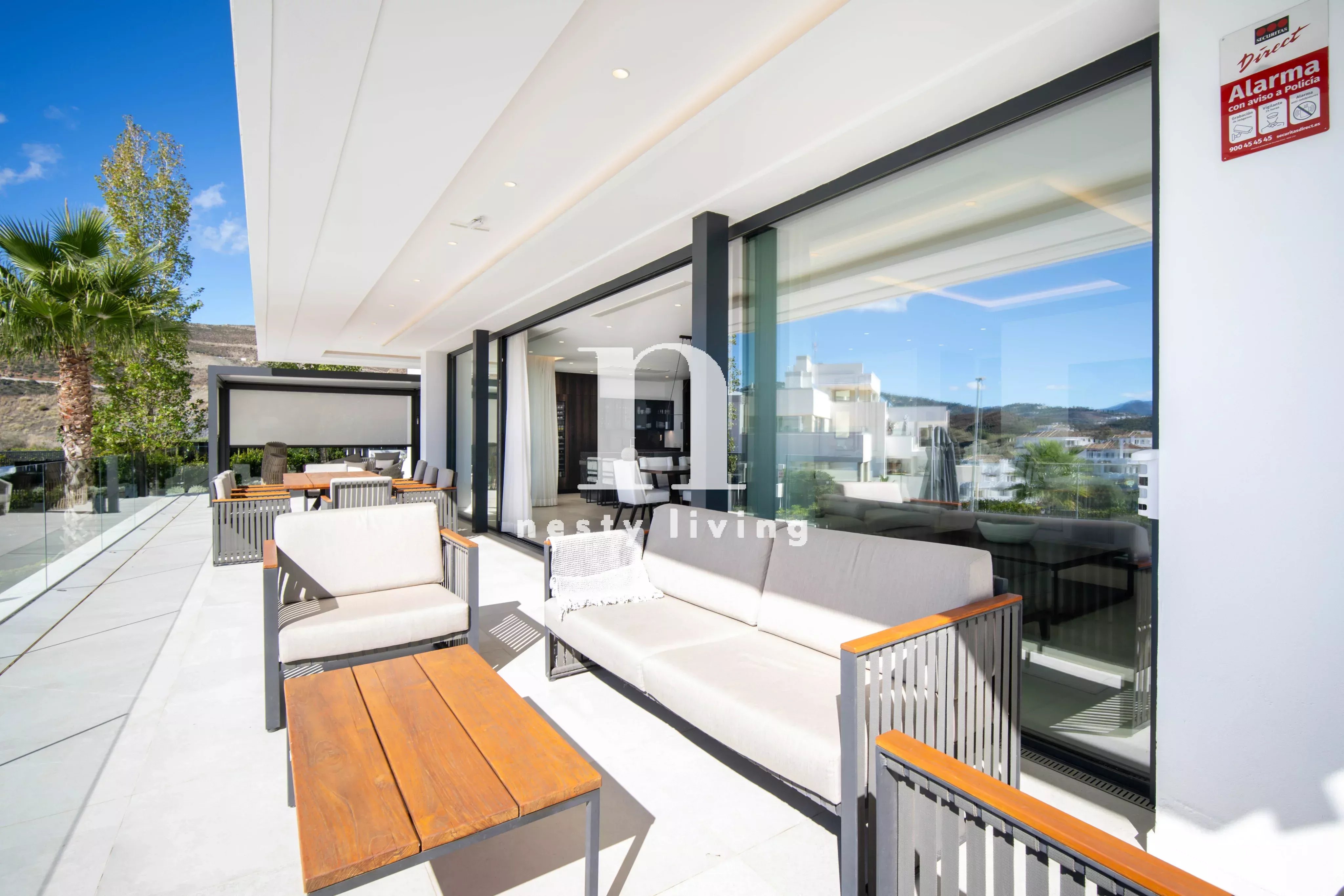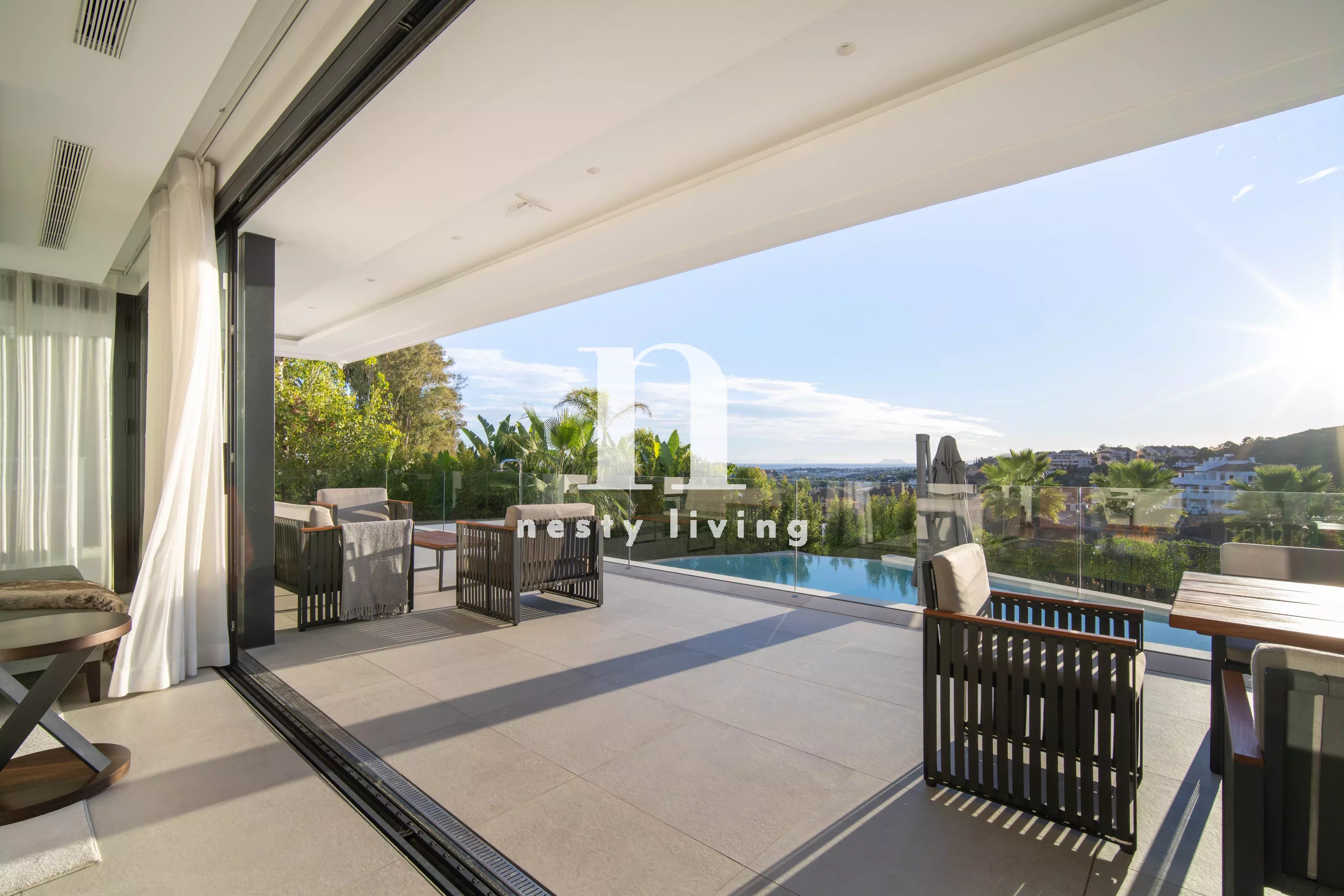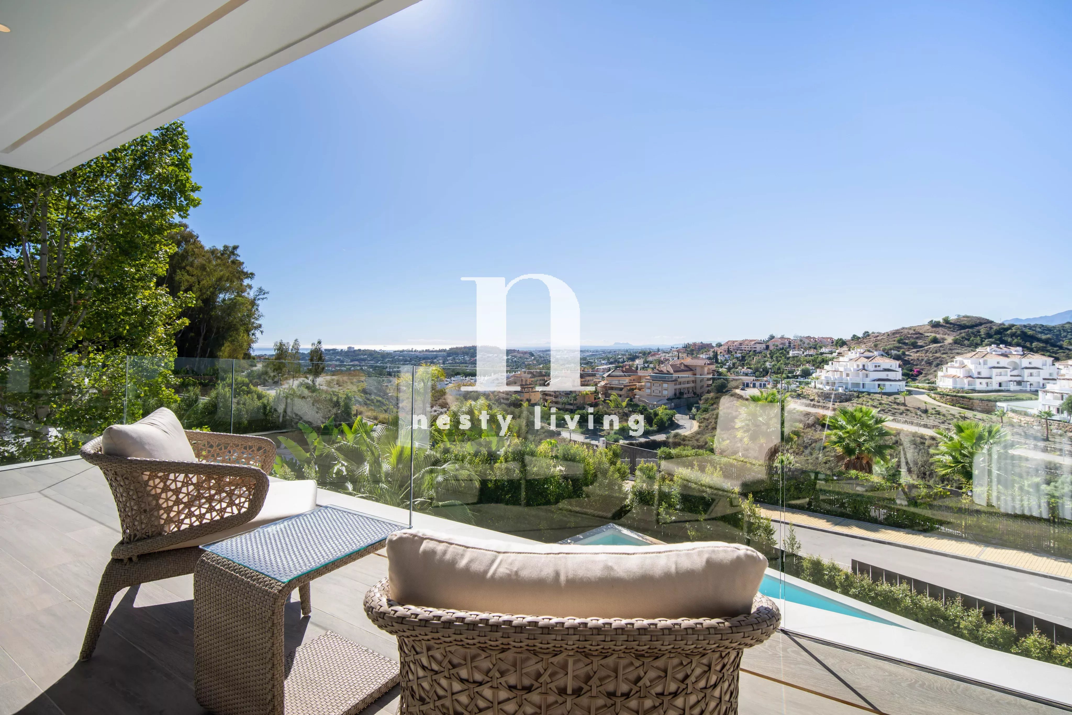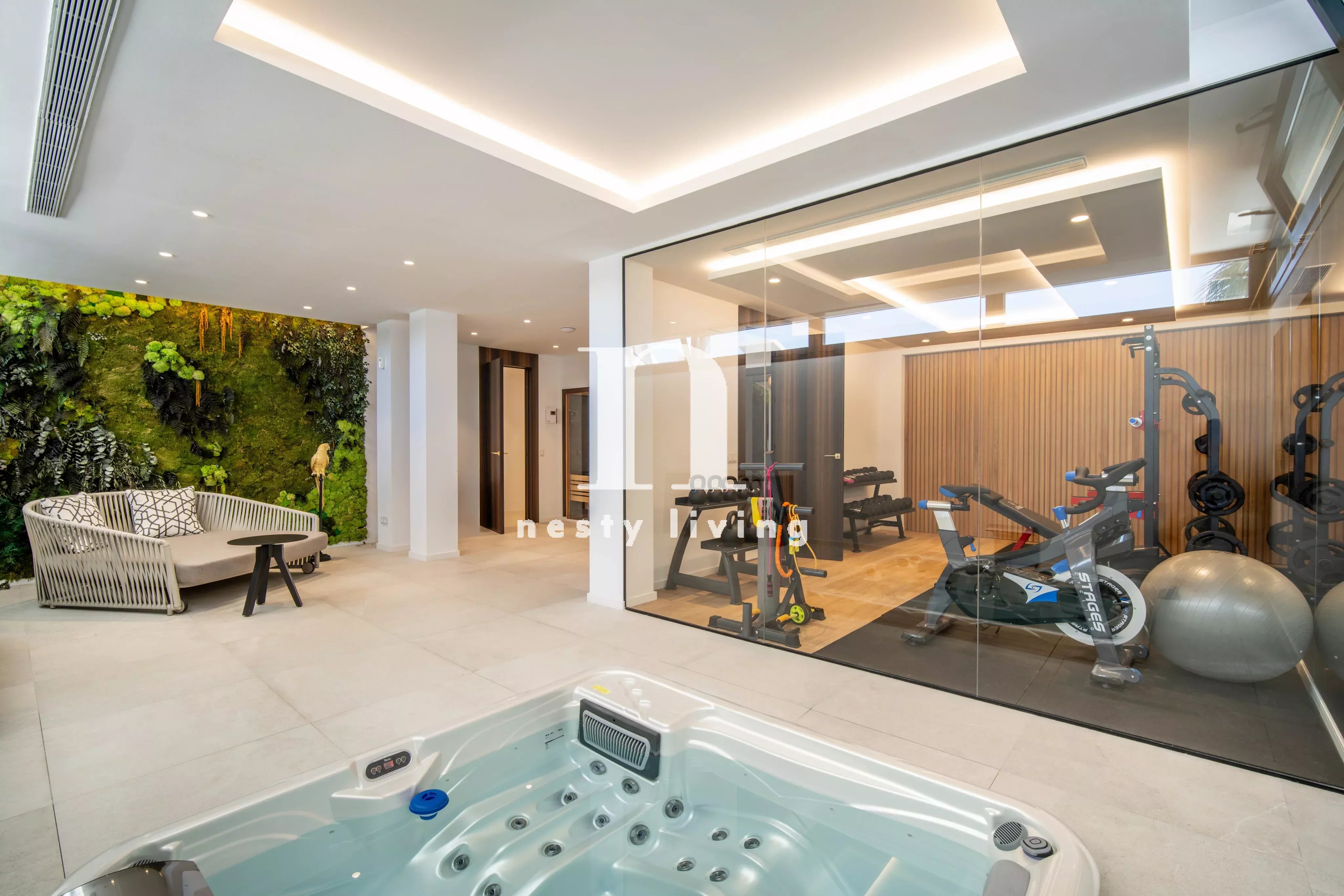 La Villa Alfma est une magnifique villa moderne située à Nueva Andalucía. Elle se distingue par son architecture ultramoderne, avec des murs blancs et de grandes fenêtres. Grâce à son orientation sud-ouest, elle reçoit un ensoleillement optimal, offrant ainsi une vue panoramique sur les environs et la mer Méditerranée. Le rez-de-chaussée est entouré d'une grande terrasse où l'on peut manger en plein air, se détendre et prendre un bain de soleil. Une piscine à débordement d'une taille presque équivalente à la propriété ajoute une touche d'élégance à l'extérieur. Les espaces intérieurs sont harmonieusement reliés aux espaces extérieurs, permettant ainsi de profiter pleinement de la vie intérieure et extérieure. De plus, la villa dispose d'un abri de voiture couvert à l'entrée. Avec son emplacement idéal, son architecture moderne et ses équipements de grande qualité, la Villa Alfma est un lieu parfait pour profiter du climat agréable de Marbella. Les intérieurs sont tout aussi impressionnants que l'extérieur, présentant un design intérieur impressionnant, aussi esthétique que fonctionnel. L'espace de vie est ouvert et le salon confortable offre des vues directes sur l'extérieur. Le mobilier et les installations témoignent de l'attention portée aux détails. La salle à manger, adjacente, offre également des vues incroyables sur la terrasse et l'extérieur. La cuisine sur mesure est élégamment conçue avec des menuiseries en bois et un merveilleux îlot de cuisine en marbre, ainsi que des appareils de cuisine Gaggenau dernier cri. L'îlot de cuisine est relié à une petite table à manger pour une plus grande polyvalence. La terrasse du niveau supérieur entoure les chambres et dispose d'un charmant espace de détente idéal pour admirer le coucher du soleil ou se relaxer. S'étendant sur 3 niveaux, le niveau supérieur est réservé aux chambres à coucher et à l'illustre chambre principale. Toutes les chambres ont été conçues pour maximiser le confort tout en restant élégantes. La chambre principale bénéficie d'une vue imprenable et d'une terrasse. La salle de bains principale est un atout supplémentaire pour l'espace, avec une superbe baignoire indépendante et des accents de marbre partout. La Villa Alfma dispose de tout ce dont vous aurez besoin, le niveau inférieur de la propriété étant réservé aux incroyables équipements qui comprennent une étonnante salle de divertissement avec une table de billard sur mesure, une cave à vin, une salle de cinéma et un bar personnalisé. Il y a également une salle de sport et un sauna. Une salle de télévision est également située à ce niveau pour plus de divertissement. Le chauffage par le sol est présent dans toute la propriété, pour plus de confort et de luxe. La Villa Alfma a tout pour plaire : des équipements incroyables, d'étonnantes terrasses extérieures, une décoration intérieure impeccable, des vues panoramiques imprenables et un emplacement de choix à Nueva Andalucia. La Villa Alfma est vraiment la meilleure offre immobilière de sa catégorie à Marbella.
