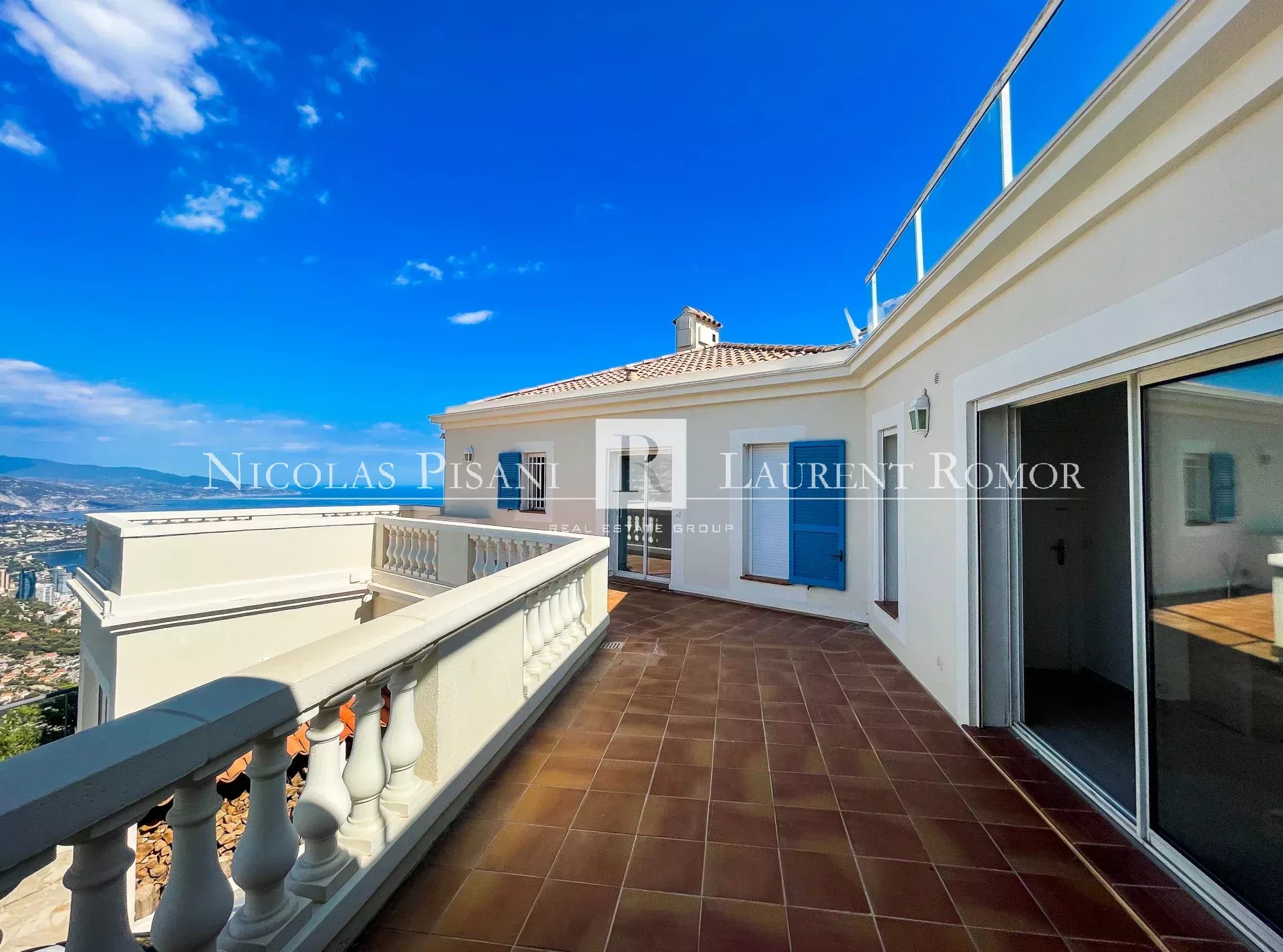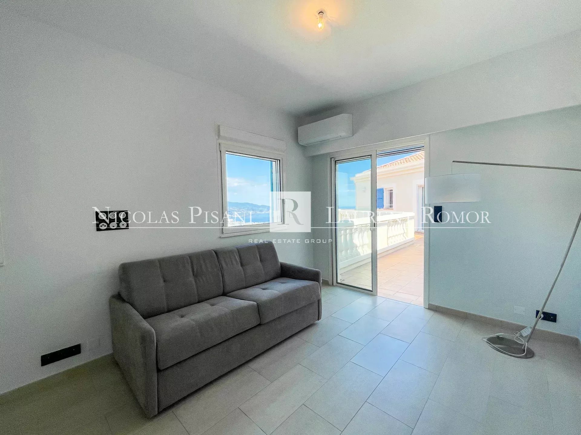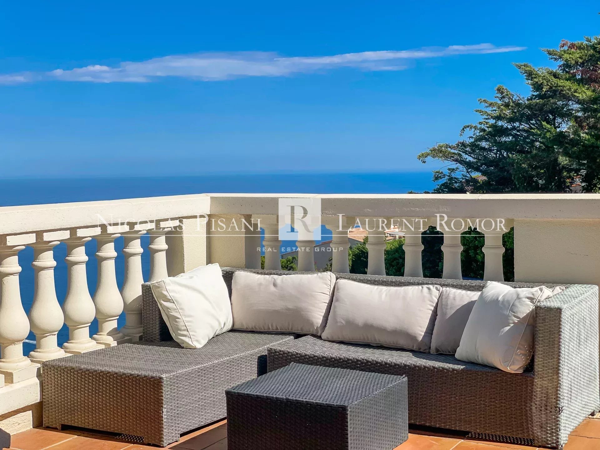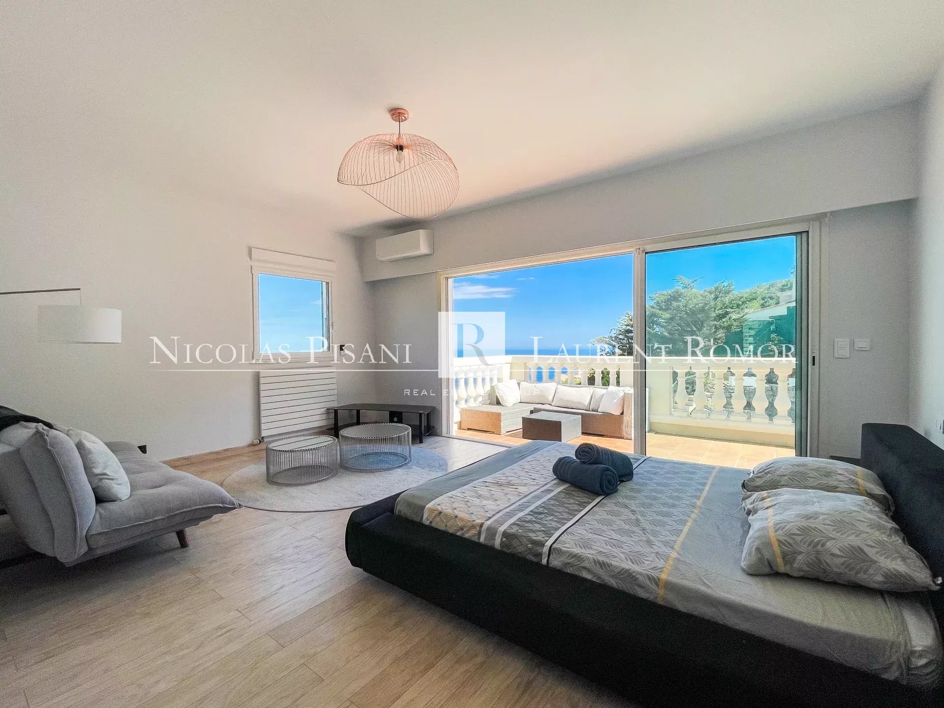 luxueuse villa de 4 chambres, avec bureau plus un appartement indépendant, située au calme et offrant une vue imprenable sur la mer, les collines, l'Italie, la Principauté de Monaco. La villa d'environ 350 m² peut accueillir 10 personnes confortablement. Elle se compose d'un spacieux séjour donnant sur une terrasse, d'une belle piscine (chauffée), d'une cuisine indépendante, d'un bureau, d'une salle de télévision, d'une chambre et d'un sauna. A l'étage, vous bénéficierez de 3 belles chambres avec terrasse dont une chmabre de maître avec dressing, de 2 salles de bains équipées, également d'une douche et d'un wc. Vous aurez la possibilité de recevoir des invités en toute indépendance, dans la deuxième partie de la villa composée d'un séjour, d'un coin cuisine, d'une chambre avec placard, d'une salle de bain avec toilettes. Vous accéderez facilement à la villa en voiture, elle dispose de 2 garages intérieurs (capacité 3 ou 4 voitures) et plusieurs places extérieures. Villa rénovée en 2021, climatisée, internet : wifi/Fibre