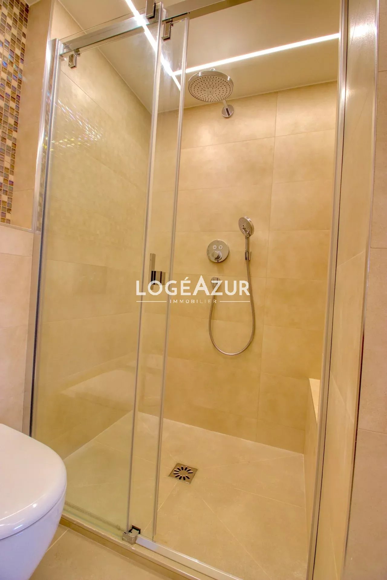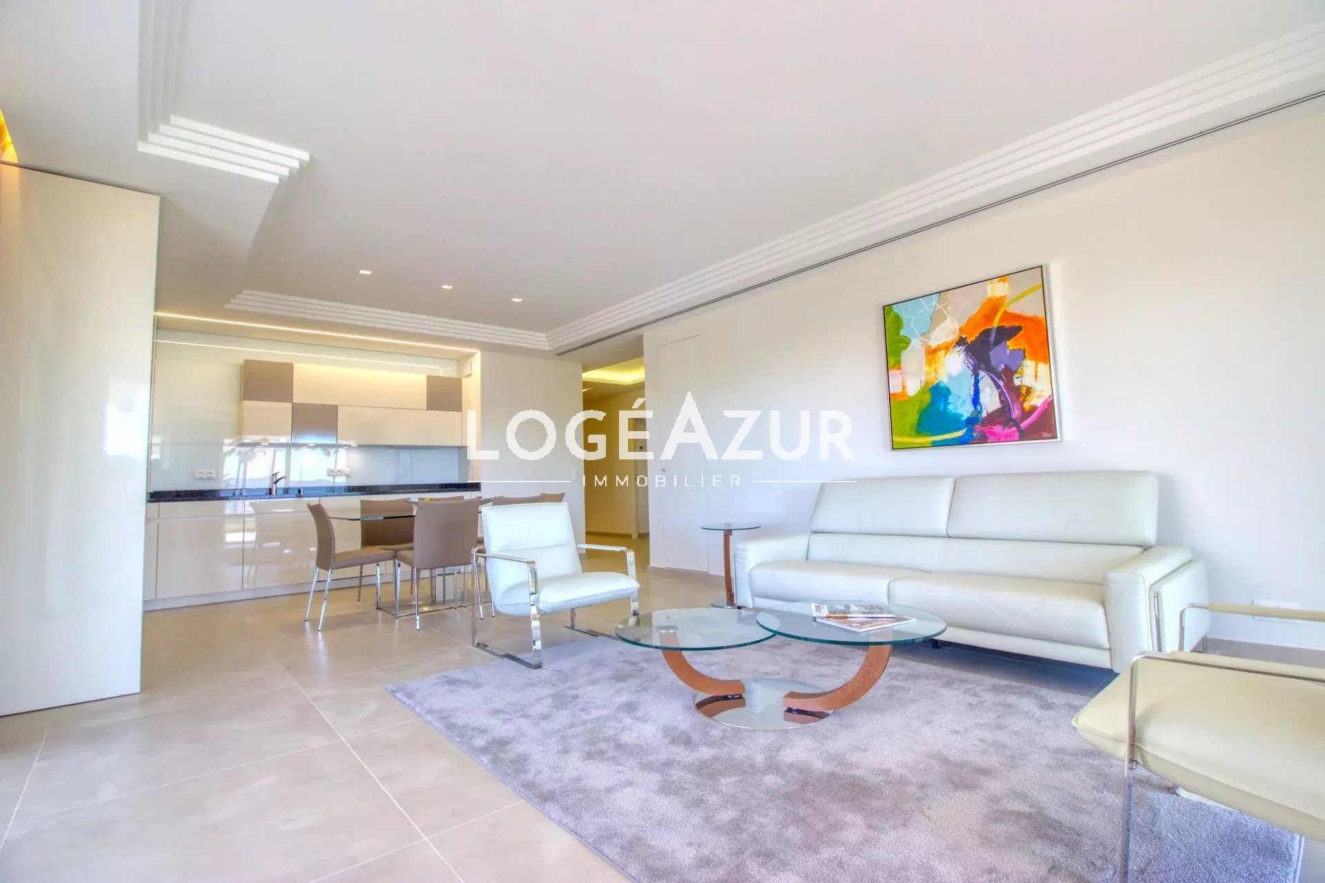 Dans une élégante résidence très cotée de la Croisette, située dans un écrin de verdure, superbe appartement d’angle de 4 pièces de 117 m2 ( Loi Carrez ), avec profonde terrasse de 55 m2. Cet appartement situé au 2e étage de la résidence bénéficie d’une très belle vue sur la mer, la baie de Cannes et l’Estérel. Il se compose d’une entrée, d’un grand séjour/salle à manger donnant sur la terrasse, d’une cuisine ouverte totalement équipée, de 3 belles chambres avec 3 salles d’eau attenantes, WC invités. Rénovation luxueuse avec des prestations raffinées haut de gamme. Mobilier contemporain / Climatisation Réversible / Domotique / Gardien. Cave et garage dans la résidence.
