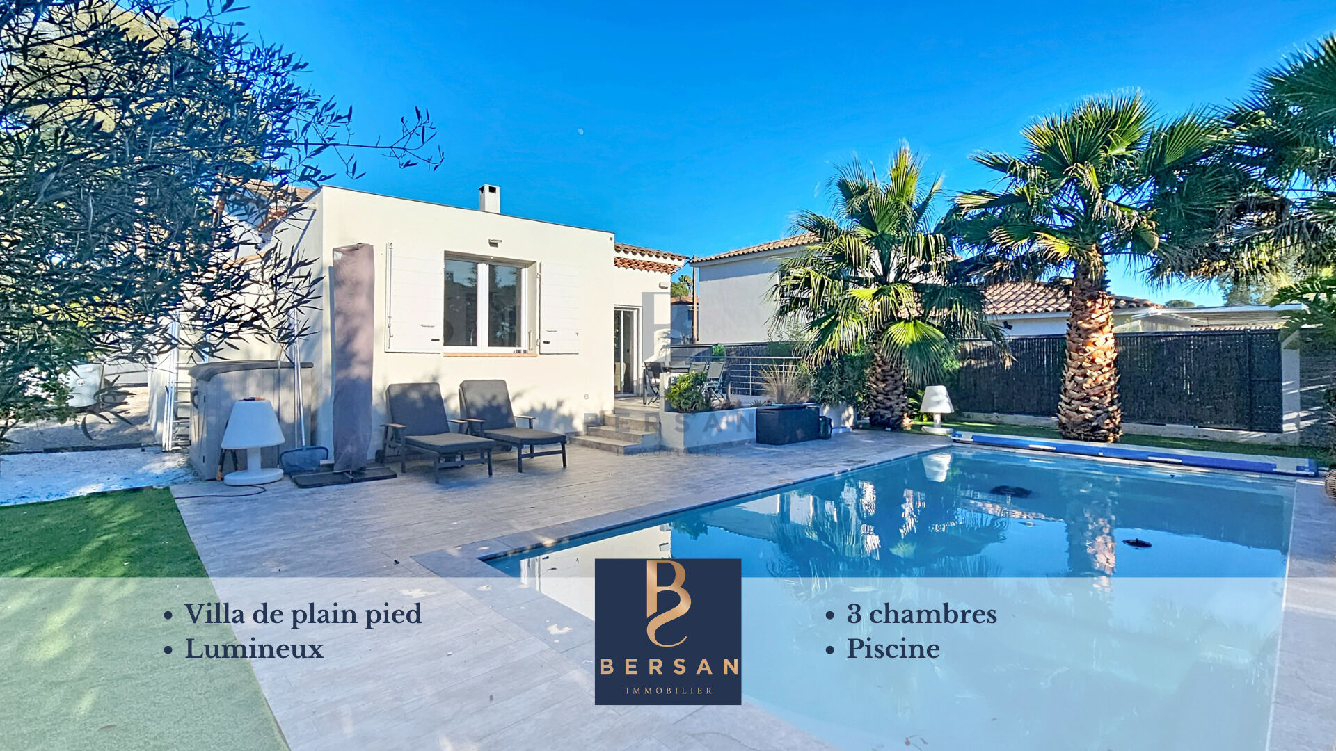 Votre agence BERSAN Immobilier vous propose cette belle villa de plain pied, entièrement rénovée située dans un quartier résidentiel et au calme. On dispose d'un confortable et très lumineux séjour/salle à manger donnant, par de larges baies, sur la terrasse plein Sud avec vue sur la piscine chauffée. La cuisine américaine équipée est récente et offre de nombreux rangements auxquels s'ajoute un espace buanderie. Dans l'espace nuit, on profite de 2 chambres, de WC indépendants, d'u