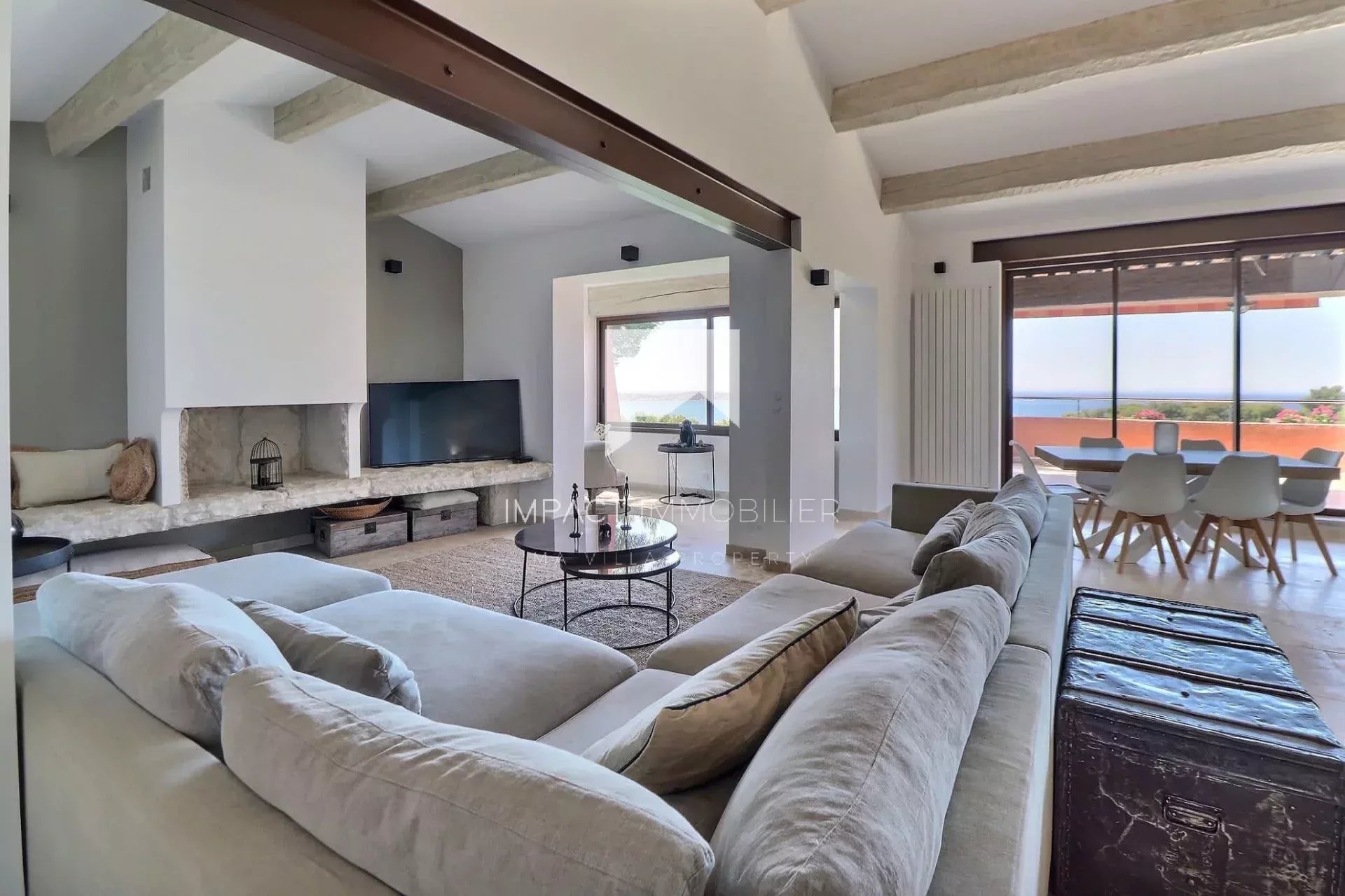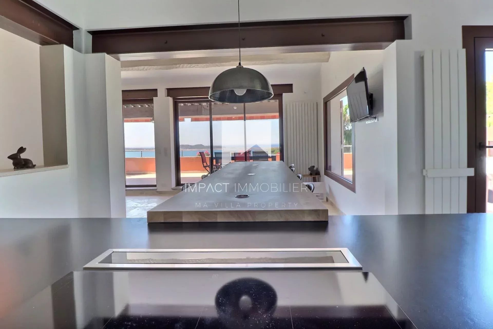 Découvrez cette somptueuse maison à Hyères, refaite à neuf, offrant une vue panoramique à 180 degrés sur la mer, la prequ'île de Giens et les îles de port cros et porquerolles . Nichée dans un cadre exceptionnel, cette propriété se distingue par ses prestations haut de gamme et son élégance intemporelle. Au rez-de-chaussée, vous serez accueillis par un séjour cathédrale spacieux et lumineux, agrémenté d'une cheminée à feu ouvert, parfaite pour des soirées chaleureuses en famille ou entre amis. La cuisine dernier cri est équipée de tout le nécessaire pour les gourmets, y compris un four à vapeur, un four traditionnel, une cave à vin, une plaque à induction et un réfrigérateur américain. Une grande terrasse avec vue sur la mer offre un espace de détente incomparable et sur laquelle vous pourrez profiter de magnifiques coucher de soleil, tandis que la climatisation intégrée assure un confort optimal en toutes saisons. En descendant au niveau R-1, trois suites parentales vous attendent, chacune avec sa propre salle de bain privative dont une avec baignoire balnéo, et terrasse individuelle ouvert sur la méditerranée, offrant un espace intime et raffiné. Le niveau R-2 propose des dépendances modulables selon vos besoins, pouvant servir de salle de sport, studio ou espace de rangement. À l'extérieur, un jardin paysager soigneusement entretenu ajoute à l'attrait de cette propriété, tandis qu'une piscine à débordement avec pompe à chaleur permet de profiter des joies de la baignade toute l'année. Un garage complète ce bien d'exception et la propriété peut accueillir trois véhicules, offrant sécurité et praticité. Le terrain de 1800 m² procure un espace généreux et privé. Enfin, cette propriété bénéficie d'un accès direct à une plage privative, un luxe rare pour des moments uniques au bord de l'eau. Ne manquez pas cette opportunité unique d'acquérir une résidence d'exception sur la côte méditerranéenne. Pour plus d'informations ou pour organiser une visite, contactez-nous dès aujourd'hui.